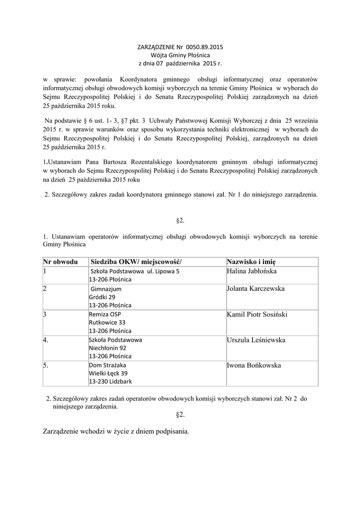 ZARZĄDZENIE Nr 0050.89.2015 Wójta Gminy Płośnica z dnia 07 października 2015 r. w sprawie: powołania Koordynatora gminnego obsługi informatycznej oraz operatorów informatycznej obsługi obwodowych komisji wyborczych na terenie Gminy Płośnica w wyborach do Sejmu Rzeczypospolitej Polskiej i do Senatu Rzeczypospolitej Polskiej zarządzonych na dzień 25 października 2015 roku. Na podstawie § 6 ust. 1- 3, §7 pkt. 3 Uchwały Państwowej Komisji Wyborczej z dnia 25 września 2015 r. w sprawie warunków oraz sposobu wykorzystania techniki elektronicznej w wyborach do Sejmu Rzeczypospolitej Polskiej i do Senatu Rzeczypospolitej Polskiej, zarządzonych na dzień 25 października 2015 r. 1.Ustanawiam Pana Bartosza Rozentalskiego koordynatorem gminnym obsługi informatycznej w wyborach do Sejmu Rzeczypospolitej Polskiej i do Senatu Rzeczypospolitej Polskiej zarządzonych na dzień 25 października 2015 roku 2. Szczegółowy zakres zadań koordynatora gminnego stanowi zał. Nr 1 do niniejszego zarządzenia. §2. 1. Ustanawiam operatorów informatycznej obsługi obwodowych komisji wyborczych na terenie Gminy Płośnica Nr obwodu 1 2 3 4. 5. Siedziba OKW/ miejscowość/ Szkoła Podstawowa ul. Lipowa 5 13-206 Płośnica Gimnazjum Gródki 29 13-206 Płośnica Remiza OSP Rutkowice 33 13-206 Płośnica Szkoła Podstawowa Niechłonin 92 13-206 Płośnica Dom Strażaka Wielki Łęck 39 13-230 Lidzbark Nazwisko i imię Halina Jabłońska Jolanta Karczewska Kamil Piotr Sosiński Urszula Leśniewska Iwona Bońkowska 2. Szczegółowy zakres zadań operatorów obwodowych komisji wyborczych stanowi zał. Nr 2 do niniejszego zarządzenia. §2. Zarządzenie wchodzi w życie z dniem podpisania. Załącznik Nr 1 do Zarządzenia Nr 0050.89.2015 Wójta Gminy Płośnica z dnia 07 października 2015 r. Zadania koordynatora gminnego Do zadań koordynatora gminnego należy: 1) współpraca i wsparcie pełnomocnika okręgowej komisji wyborczej w gminie, 2) udział w szkoleniu organizowanym przez pełnomocnika ds. informatyki okręgowej komisji wyborczej, 3) wsparcie wprowadzania i aktualizacji w systemie informatycznym danych dotyczących obwodów głosowania i ich granic, liczby uprawnionych do głosowania na obszarze gminy oraz danych o liczbie udzielonych pełnomocnictw, liczbie zaświadczeń, liczbie wysłanych pakietów wyborczych, osobom realizującym zadanie obsługi rejestru wyborców w gminie, 4) wsparcie wprowadzania i aktualizacji w systemie WOW składów obwodowych komisji wyborczych dla osób realizujących zadanie, 5) prowadzenie ewidencji operatorów obsługi informatycznej obwodowych komisji zawierającej dane kontaktowe i ustalony sposób dystrybucji loginów i haseł, oprogramowania oraz danych definiujących, 6) przeprowadzenie szkolenia dla operatorów obsługi informatycznej obwodowych komisji wyborczych, 7) przekazanie przewodniczącym obwodowych komisji wyborczych oraz operatorom obsługi informatycznej obwodowych komisji wyborczych loginów i haseł, 8) dystrybucja oprogramowania oraz danych definicyjnych dla każdego obwodu głosowania (poprzez pobranie ze stron internetowych i utworzenie nośników), także w przypadku testów, o których mowa w punkcie 13, 9) prowadzenie ewidencji wersji zainstalowanego oprogramowania (w przypadku wsparcia w obwodach bez dostępu do sieci publicznej przekazywania danych) i aktualności danych definicyjnych, 10) przyjmowanie uwag dotyczących działania programu oraz udzielanie wsparcia technicznego operatorom obsługi informatycznej obwodowych komisji wyborczych, 11) zgłaszanie uwag dotyczących działania systemu pełnomocnikowi okręgowej komisji wyborczej ds. informatyki, 12) w przypadkach awaryjnych nawiązanie kontaktu i przekazanie informacji pełnomocnikowi ds. informatyki okręgowej komisji wyborczej, 13) udział w przygotowaniu i przeprowadzeniu testów ogólnokrajowych przekazywania danych testowych o wynikach głosowania ze wszystkich komisji obwodowych korzystających ze wsparcia informatycznego oraz danych testowych o liczbie osób ujętych w spisie wyborców i o liczbie wydanych kart do głosowania, zgodnie ze scenariuszami testów, 14) przekazanie do pełnomocnika ds. informatyki okręgowej komisji wyborczej wniosków i spostrzeżeń w formie raportu podsumowującego przebieg testów ogólnokrajowych, 15) prowadzenie dziennika zdarzeń, w którym w szczególności są odnotowywane czynności: a) przeprowadzenie (z potwierdzeniem uczestnictwa) szkolenia operatorów obsługi informatycznej obwodowej komisji wyborczej i pozostałych użytkowników gminnych obsługujących system WOW, b) zgłaszanie uwag do działania programu do pełnomocnika ds. informatyki okręgowej komisji wyborczej, w tym usterek i awarii, c) przekazanie, za potwierdzeniem, loginów i haseł operatorom oraz przewodniczącym obwodowych komisji wyborczych, d) przekazanie, oprogramowania i danych definicyjnych operatorom obwodowych komisji wyborczych (pobranie z serwisów dystrybucyjnych, utworzenie nośnika), Załącznik Nr 2 do Zarządzenia Nr 0050.89.2015 Wójta Gminy Płośnica z dnia 07 października 2015 r. Zadania operatora informatycznej obsługi obwodowej komisji wyborczej. Do zadań operatora należy: 1) udział w szkoleniu organizowanym przez koordynatora gminnego, 2) udział w wyznaczonych terminach w testach ogólnokrajowych obejmujących wprowadzenie testowych wyników głosowania oraz testowych danych o liczbie osób ujętych w spisie wyborców i liczbie wydanych kart do głosowania w zakresie obsługiwanych obwodów głosowania; przesłanie danych za pośrednictwem sieci publicznej lub w przypadku braku dostępu do sieci publicznej przekazanie danych do pełnomocnika okręgowej komisji wyborczej w gminie w wyznaczonym terminie, 3) odbiór za potwierdzeniem loginu i hasła operatora do systemu (na czas testów oraz dla obsługi wyborów), 4) przygotowanie i sprawdzenie stanowiska komputerowego w zakresie konfiguracji dostępu do sieci publicznej i zainsta