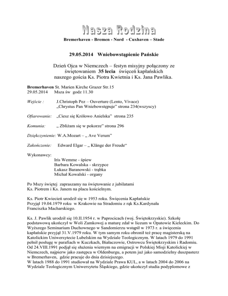 Bremerhaven - Bremen - Nord - Cuxhaven – Stade 29.05.2014 Wniebowstąpienie Pańskie Dzień Ojca w Niemczech – festyn misyjny połączony ze świętowaniem 35 lecia święceń kapłańskich naszego gościa Ks. Piotra Kwietnia i Ks. Jana Pawlika. Bremerhaven St. Marien Kirche Grazer Str.15 29.05.2014 Msza św godz 11.30 Wejście : J.Christoph Pez – Ouverture (Lento, Vivace) „Chrystus Pan Wniebowstępuje” strona 234(wszyscy) Ofiarowanie: „Ciesz się Królowo Anielska” strona 235 Komunia: „ Zbliżam się w pokorze” strona 296 Dziękczynienie: W.A.Mozart – „ Ave Verum” Zakończenie: Edward Elgar – „ Klänge der Freude“ Wykonawcy: Iris Wemme - śpiew Barbara Kowalska - skrzypce Łukasz Baranowski - trąbka Michał Kowalski - organy Po Mszy świętej zapraszamy na świętowanie z jubilatami Ks. Piotrem i Ks. Janem na placu kościelnym. Ks. Piotr Kwiecień urodził się w 1953 roku. Święcenia Kapłańskie Przyjął 19.04.1979 roku w Krakowie na Stradomiu z rąk Ks.Kardynała Franciszka Macharskiego. Ks. J. Pawlik urodził się 10.II.1954 r. w Paprocicach (woj. Świętokrzyskie). Szkołę podstawową ukończył w Woli Zamkowej a maturę zdał w liceum w Opatowie Kieleckim. Do Wyższego Seminarium Duchownego w Sandomierzu wstąpił w 1973 r. a święcenia kapłańskie przyjął 31.V.1979 roku. W tym samym roku obronił też pracę magisterską na Katolickim Uniwersytecie Lubelskim na Wydziale Teologicznym. W latach 1979 do 1991 pełnił posługę w parafiach w Kuczkach, Białaczowie, Ostrowcu Świętokrzyskim i Radomiu. Od 24.VIII.1991 podjął się służenia wiernym na emigracji w Polskiej Misji Katolickiej w Niemczech, najpierw jako zastępca w Oldenburgu, a potem już jako samodzielny duszpasterz w Bremerhaven, gdzie pracuje do dnia dzisiejszego. W latach 1988 do 1991 studiował na Wydziale Prawa KUL, a w latach 2004 do 2006 na Wydziale Teologicznym Uniwersytetu Śląskiego, gdzie ukończył studia podyplomowe z teologii pastoralnej i otrzymał licencjat. W 2011 na Uniwersytecie Papieskim Jana Pawła II w Krakowie uzyskał doktorat. O godzinie 14.30 odbędzie się recital Marii Bober pt. „ Piękny jest Bóg” poświęcony błogosławionej Karolinie Kózkównie w hołdzie św Janowi Pawłowi II . Błogosławiona Karolina oddała życie w obronie swojej czystości. Dodatkową wartością recitalu jest osobiste świadectwo o bł. Karolinie wypowiadane przez autorkę recitalu. Na zakończenie będzie odprawione Nabożeństwo Majowe w Kościele St. Marien. Miesiąc czerwiec poświęcony jest Naświętszemu Sercu Jezusa. Przez cały czerwiec po Mszy św. będzie Nabożeństwo do Naświętszego Serca Jezusa. „ ...przy Sercu Jezusowym serce człowieka uczy się poznawać, jaki jest prawdziwy i jedyny sens jego życia i jego przeznaczenie: przy Sercu Jezusowym serce człowieka nabiera zdolności miłowania”. (Jan Paweł II) „ ...Kult Serca Jezusowego wywodzi się z czasów średniowiecza, początkowo miał charakter prywatny z czasem ogarnął szerokie rzesze społeczeństwa . Główna zasługa w rozpowszechnianiu się nabożeństwa do Najświętszego Serca Pana Jezusa przypada skromnej zakonnicy, wizytce, św. Małgorzacie Marii Alacoque(1647-1690). Żyła ona w tym samym wieku i czasie, co św. Jan Eudes, ale w zupełnym ukryciu w klasztorze w Paray-le-Monial. 27 grudnia 1673 roku Małgorzata dopuszczona do tego, by spoczęła na Sercu Jezusowym. Pan Jezus pokazując jej swoje Serce pełne ognia, rzekł do niej: „Moje Boskie Serce tak płonie miłością ku ludziom, że nie może dłużej utrzymać tych płomieni gorejących, zamkniętych w moim łonie. Ono pragnie rozlać je za twoim pośrednictwem i pragnie wzbogacić ludzi swoimi Bożymi skarbami”. Następie Jezus wziął serce Małgorzaty i umieścił je symboliczne w swoim Sercu. Potem już przemienione i jaśniejące oddał Małgorzacie. Usłyszała pocieszające słowa: „Dotąd nosiłaś tylko imię mojej sługi. Dzisiaj daję Ci inne imię – umiłowanej uczennicy mojego Serca”. Obietnice Serca Jezusowego : Pan Jezus dał św. Małgorzacie Alacoque dwanaście obietnic, dotyczących czcicieli Jego Serca: 1 Dam im łaski, potrzebne w ich stanie. 2. Ustalę pokój w ich rodzinach. 3. Będę ich pocieszał w utrapieniach. 4. Będę ich pewną ucieczką w życiu, a szczególnie w godzinę śmierci. 5. Będę im błogosławił w ich przedsięwzięciach. 6. Grzesznicy znajdą w mym Sercu źródło i ocean miłosierdzia. 7. Dusze oziębłe staną się gorliwymi. 8. Dusze gorliwe prędko dojdą do doskonałości. 9. Będę błogosławił domom, w których wizerunek Serca mojego będzie czczony. 10. Osoby, które będą to nabożeństwo rozszerzały, będą miały imię swoje wypisane w Sercu moim. 11. Dam kapłanom dar wzruszania serc nawet najzatwardzialszych. 12. W nadmiarze miłosierdzia Serca mojego przyrzekam tym wszystkim, którzy będą komunikować w pierwsze piątki miesiąca przez dziewięć miesięcy z rzędu w intencji wynagrodzenia, że miłość moja udzieli łaskę pokuty, iż nie umrą w mojej niełasce, ani bez Sakramentów świętych, a Serce moje będzie im pewną ucieczką w ostatniej godzinie życia.” (Ks. Grzegorz A. Ostrowski) 01.06.14 niedziela Msza św. godz 11.30 w St Marien 17.06.14 wtorek św. Brata Alberta patrona naszej Misji Msza św. godz 17.30 w St Marien 19.06.14 czwartek Boże Ciało – godz. 9.30 wspólna Msza św. w jęz. niemieckim w Walter Kolb –Halle godz. 17.30 St. Marien – Nieszpory Eucharystyczne a po nich Msza św. 27.06.14 piątek Uroczystość Serca Pana Jezusa Msza św. godz 17.30 w St Marien 29.06.14 niedziela świętych Piotra i Pawła Msza św. w St. Ansgar kolekta na Świętopietrze