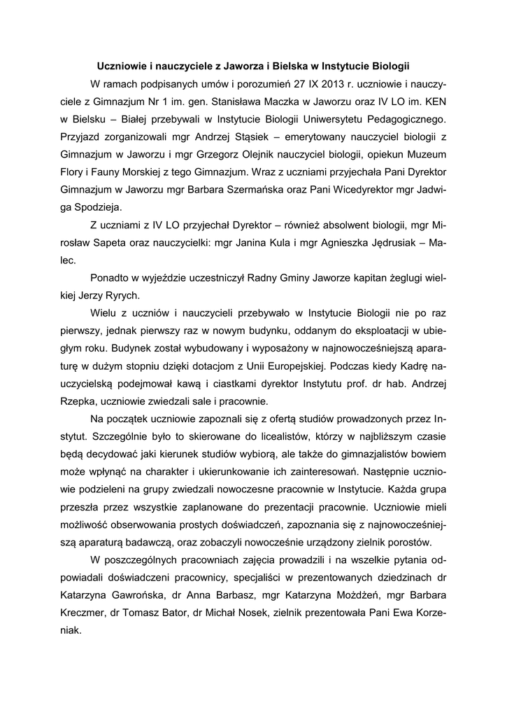 Uczniowie i nauczyciele z Jaworza i Bielska w Instytucie Biologii W ramach podpisanych umów i porozumień 27 IX 2013 r. uczniowie i nauczyciele z Gimnazjum Nr 1 im. gen. Stanisława Maczka w Jaworzu oraz IV LO im. KEN w Bielsku – Białej przebywali w Instytucie Biologii Uniwersytetu Pedagogicznego. Przyjazd zorganizowali mgr Andrzej Stąsiek – emerytowany nauczyciel biologii z Gimnazjum w Jaworzu i mgr Grzegorz Olejnik nauczyciel biologii, opiekun Muzeum Flory i Fauny Morskiej z tego Gimnazjum. Wraz z uczniami przyjechała Pani Dyrektor Gimnazjum w Jaworzu mgr Barbara Szermańska oraz Pani Wicedyrektor mgr Jadwiga Spodzieja. Z uczniami z IV LO przyjechał Dyrektor – również absolwent biologii, mgr Mirosław Sapeta oraz nauczycielki: mgr Janina Kula i mgr Agnieszka Jędrusiak – Malec. Ponadto w wyjeździe uczestniczył Radny Gminy Jaworze kapitan żeglugi wielkiej Jerzy Ryrych. Wielu z uczniów i nauczycieli przebywało w Instytucie Biologii nie po raz pierwszy, jednak pierwszy raz w nowym budynku, oddanym do eksploatacji w ubiegłym roku. Budynek został wybudowany i wyposażony w najnowocześniejszą aparaturę w dużym stopniu dzięki dotacjom z Unii Europejskiej. Podczas kiedy Kadrę nauczycielską podejmował kawą i ciastkami dyrektor Instytutu prof. dr hab. Andrzej Rzepka, uczniowie zwiedzali sale i pracownie. Na początek uczniowie zapoznali się z ofertą studiów prowadzonych przez Instytut. Szczególnie było to skierowane do licealistów, którzy w najbliższym czasie będą decydować jaki kierunek studiów wybiorą, ale także do gimnazjalistów bowiem może wpłynąć na charakter i ukierunkowanie ich zainteresowań. Następnie uczniowie podzieleni na grupy zwiedzali nowoczesne pracownie w Instytucie. Każda grupa przeszła przez wszystkie zaplanowane do prezentacji pracownie. Uczniowie mieli możliwość obserwowania prostych doświadczeń, zapoznania się z najnowocześniejszą aparaturą badawczą, oraz zobaczyli nowocześnie urządzony zielnik porostów. W poszczególnych pracowniach zajęcia prowadzili i na wszelkie pytania odpowiadali doświadczeni pracownicy, specjaliści w prezentowanych dziedzinach dr Katarzyna Gawrońska, dr Anna Barbasz, mgr Katarzyna Możdżeń, mgr Barbara Kreczmer, dr Tomasz Bator, dr Michał Nosek, zielnik prezentowała Pani Ewa Korzeniak. Po spotkaniu z Dyrektorem Instytutu do uczniów dołączyli opiekunowie i wspólnie zwiedzali Instytut a następnie w holu Uczelni zapoznali się z wykazem Doktorów Honoris Causa uhonorowanych tym tytułem przez Senat Uniwersytetu. Po pobycie na Uniwersytecie uczestnicy wycieczki udali się do krakowskiego Ogrodu Zoologicznego gdzie przewodnikiem był pracownik UP dr M. Guzik, który również zorganizował i koordynował pobyt gości w Instytucie. Pogoda dopisała i wiele zwierząt było na wybiegach więc uczniowie mogli podziwiać znane z lekcji biologii ciekawe i egzotyczne zwierzęta. Jak zwykle zainteresowanie wzbudziły duże koty – tygrys, lwy czy pantery śnieżne ale także niewielkie ale wielce sympatyczne liski pustynne – fenki, których wielkie uszy są charakterystyczną cechą tych zwierząt. Wielkim zainteresowaniem cieszyło się egzotarium gdzie na ekspozycjach można było oglądać niewielkie, mierzące kilka centymetrów długości, jednak obdarzone najsilniejszym jadem, płazy z grupy drzewołazów. Na tym zakończył się pobyt uczniów w Krakowie. Druga cześć zajęć miała miejsce następnego dnia w Gimnazjum w Jaworzu. Zajęcia w szkole zorganizował mgr Grzegorz Olejnik. Na początek odbył się wykład dr Jacka Proszyka połączony z prezentacją jego zbiorów owadów, występujących w okolicy Jaworza. Jako kolejne odbyły się zajęcia prowadzone przez przybyłych z Krakowa pracowników UP, botanika dr Ryszarda Kozika i zoologa dr Marka Guzika. W ramach zajęć z botaniki uczniowie przy użyciu prostych kluczy uczyli się oznaczania pospolitych gatunków drzew i krzewów. Po tych zajęciach dr M. Guzik przeprowadził egzamin dla kolejnej grupy przewodników po Muzeum Flory i Fauny Morskiej. Wszyscy zdający wykazali się dużą wiedzą i bardzo dobrym przygotowaniem do czekającej ich funkcji. Jest to zatem kolejna grupa przewodników przygotowywana przez mgr Grzegorza Olejnika – opiekuna Muzeum Flory i Fauny Morskiej oraz Ligi Morskiej i Rzecznej, która przejmie, niewątpliwie z sukcesem, funkcje przewodników w miejsce kolegów i koleżanek, absolwentów Jaworzańskiego Gimnazjum. Warsztaty przeszły do historii. Cieszy fakt, że dzięki zaangażowaniu kadry dydaktycznej z Jaworza i Bielska ponad 40 osobowa grupa uczniów ciekawie spędziła czas i w Krakowie i w Jaworzu dr Marek Guzik