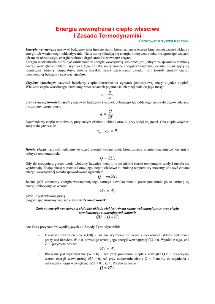 Energia wewnętrzna i ciepło właściwe I Zasada Termodynamiki Opracował: Krzysztof Kadowski Energią wewnętrzną nazywać będziemy taką funkcję stanu, która jest sumą energii kinetycznej cząstek układu i energii ich wzajemnego oddziaływania. Na tę sumę składają się energia kinetyczna ruchu postępowego cząstek, ich ruchu obrotowego, energia ruchów i drgań atomów wewnątrz cząstek. Energia mechaniczna może być zamieniana w energię wewnętrzną, zaś praca jest jednym ze sposobów zamiany energii wewnętrznej układu. Wynika z tego, że taką samą zmianę energii wewnętrznej układu, objawiającą się identyczną zmianą temperatury, można uzyskać przez ogrzewanie układu. Ten sposób zmiany energii wewnętrznej będziemy nazywać ciepłem. Ciepłem właściwym nazywać będziemy ciepło potrzebne na ogrzanie jednostkowej masy o jeden stopień. Wielkość ciepła właściwego określamy przez stosunek pojemności cieplnej ciała do jego masy: q , m c= przy czym pojemnością cieplną nazywać będziemy stosunek pobranego lub oddanego ciepła do odpowiadającej mu zmiany temperatury: q= Q . ∆T Rozróżniamy ciepło właściwe cp przy stałym ciśnieniu układu oraz cV przy stałej objętości. Oba ciepła wiąże ze sobą stała gazowa R: c p − cV = R. Ilością ciepła nazywać będziemy tę część energii wewnętrznej, która zostaje wymieniona między ciałami o różnych temperaturach: Q = ∆U . Gdy do naczynia z gorącą wodą włożymy kawałek metalu, to po jakimś czasie temperatury wody i metalu się wyrównają. Znając masę m metalu i oraz jego ciepło właściwe c i zmianę temperatury możemy obliczyć zmianę energii wewnętrznej metalu spowodowana ogrzaniem: Q = mc∆T . Jednak jeśli zmienimy energię wewnętrzną tego samego kawałka metalu przez pocieranie go to zmianę tej energii obliczymy ze wzoru: ∆U = W , gdzie W jest włożoną pracą. Uogólniając możemy zapisać I Zasadę Termodynamiki: Zmiana energii wewnętrznej ciała lub układu ciał jest równa sumie wykonanej pracy oraz ciepła wymienionego z otaczającymi ciałami: ∆U = Q + W . Oto kilka przypadków wynikających z I Zasady Termodynamiki: - Układ izolowany cieplnie (Q=0) – tzn. nie wymienia on ciepła z otoczeniem. Wtedy wykonanie pracy nad układem W > 0, powoduje wzrost jego energii wewnętrznej ∆U > 0. Wynika z tego, że I Z.T. przybiera postać: - Praca nie jest wykonywana (W = 0) – tzn. przy pobieraniu ciepła z zewnątrz Q > 0 towarzyszy wzrost energii wewnętrznej ∆U > 0, zaś przy oddawaniu ciepła Q < 0 mamy do czynienia z maleniem energii wewnętrznej ∆U < 0. I Z. T. Przybiera postać: ∆U = W , Q = ∆U . - Układ, w którym ∆U = 0, to taki, który jest izolowany termicznie i nie ma na nim wykonanej pracy. Spełniony jest więc warunek: Q = 0 i W = 0 lub W >0 i Q < 0 lub W < 0 i Q > 0. I Z. T. Przybiera postać: W + Q = 0.