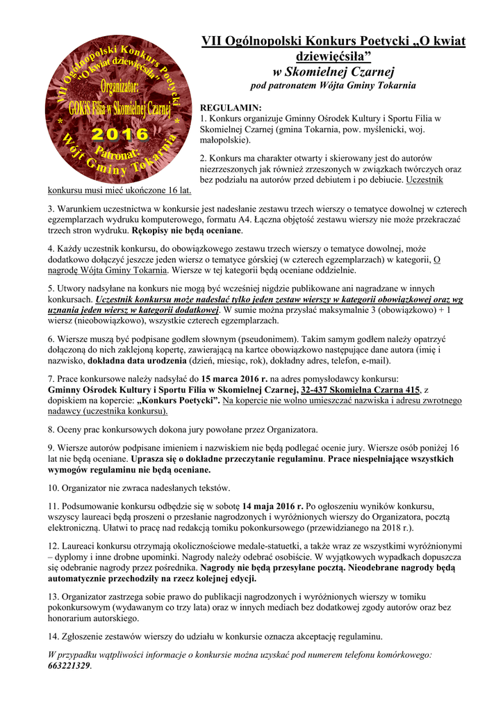 VII Ogólnopolski Konkurs Poetycki „O kwiat dziewięćsiła” w Skomielnej Czarnej pod patronatem Wójta Gminy Tokarnia REGULAMIN: 1. Konkurs organizuje Gminny Ośrodek Kultury i Sportu Filia w Skomielnej Czarnej (gmina Tokarnia, pow. myślenicki, woj. małopolskie). 2. Konkurs ma charakter otwarty i skierowany jest do autorów niezrzeszonych jak również zrzeszonych w związkach twórczych oraz bez podziału na autorów przed debiutem i po debiucie. Uczestnik konkursu musi mieć ukończone 16 lat. 3. Warunkiem uczestnictwa w konkursie jest nadesłanie zestawu trzech wierszy o tematyce dowolnej w czterech egzemplarzach wydruku komputerowego, formatu A4. Łączna objętość zestawu wierszy nie może przekraczać trzech stron wydruku. Rękopisy nie będą oceniane. 4. Każdy uczestnik konkursu, do obowiązkowego zestawu trzech wierszy o tematyce dowolnej, może dodatkowo dołączyć jeszcze jeden wiersz o tematyce górskiej (w czterech egzemplarzach) w kategorii, O nagrodę Wójta Gminy Tokarnia. Wiersze w tej kategorii będą oceniane oddzielnie. 5. Utwory nadsyłane na konkurs nie mogą być wcześniej nigdzie publikowane ani nagradzane w innych konkursach. Uczestnik konkursu może nadesłać tylko jeden zestaw wierszy w kategorii obowiązkowej oraz wg uznania jeden wiersz w kategorii dodatkowej. W sumie można przysłać maksymalnie 3 (obowiązkowo) + 1 wiersz (nieobowiązkowo), wszystkie czterech egzemplarzach. 6. Wiersze muszą być podpisane godłem słownym (pseudonimem). Takim samym godłem należy opatrzyć dołączoną do nich zaklejoną kopertę, zawierającą na kartce obowiązkowo następujące dane autora (imię i nazwisko, dokładna data urodzenia (dzień, miesiąc, rok), dokładny adres, telefon, e-mail). 7. Prace konkursowe należy nadsyłać do 15 marca 2016 r. na adres pomysłodawcy konkursu: Gminny Ośrodek Kultury i Sportu Filia w Skomielnej Czarnej, 32-437 Skomielna Czarna 415, z dopiskiem na kopercie: „Konkurs Poetycki”. Na kopercie nie wolno umieszczać nazwiska i adresu zwrotnego nadawcy (uczestnika konkursu). 8. Oceny prac konkursowych dokona jury powołane przez Organizatora. 9. Wiersze autorów podpisane imieniem i nazwiskiem nie będą podlegać ocenie jury. Wiersze osób poniżej 16 lat nie będą oceniane. Uprasza się o dokładne przeczytanie regulaminu. Prace niespełniające wszystkich wymogów regulaminu nie będą oceniane. 10. Organizator nie zwraca nadesłanych tekstów. 11. Podsumowanie konkursu odbędzie się w sobotę 14 maja 2016 r. Po ogłoszeniu wyników konkursu, wszyscy laureaci będą proszeni o przesłanie nagrodzonych i wyróżnionych wierszy do Organizatora, pocztą elektroniczną. Ułatwi to pracę nad redakcją tomiku pokonkursowego (przewidzianego na 2018 r.). 12. Laureaci konkursu otrzymają okolicznościowe medale-statuetki, a także wraz ze wszystkimi wyróżnionymi – dyplomy i inne drobne upominki. Nagrody należy odebrać osobiście. W wyjątkowych wypadkach dopuszcza się odebranie nagrody przez pośrednika. Nagrody nie będą przesyłane pocztą. Nieodebrane nagrody będą automatycznie przechodziły na rzecz kolejnej edycji. 13. Organizator zastrzega sobie prawo do publikacji nagrodzonych i wyróżnionych wierszy w tomiku pokonkursowym (wydawanym co trzy lata) oraz w innych mediach bez dodatkowej zgody autorów oraz bez honorarium autorskiego. 14. Zgłoszenie zestawów wierszy do udziału w konkursie oznacza akceptację regulaminu. W przypadku wątpliwości informacje o konkursie można uzyskać pod numerem telefonu komórkowego: 663221329.
