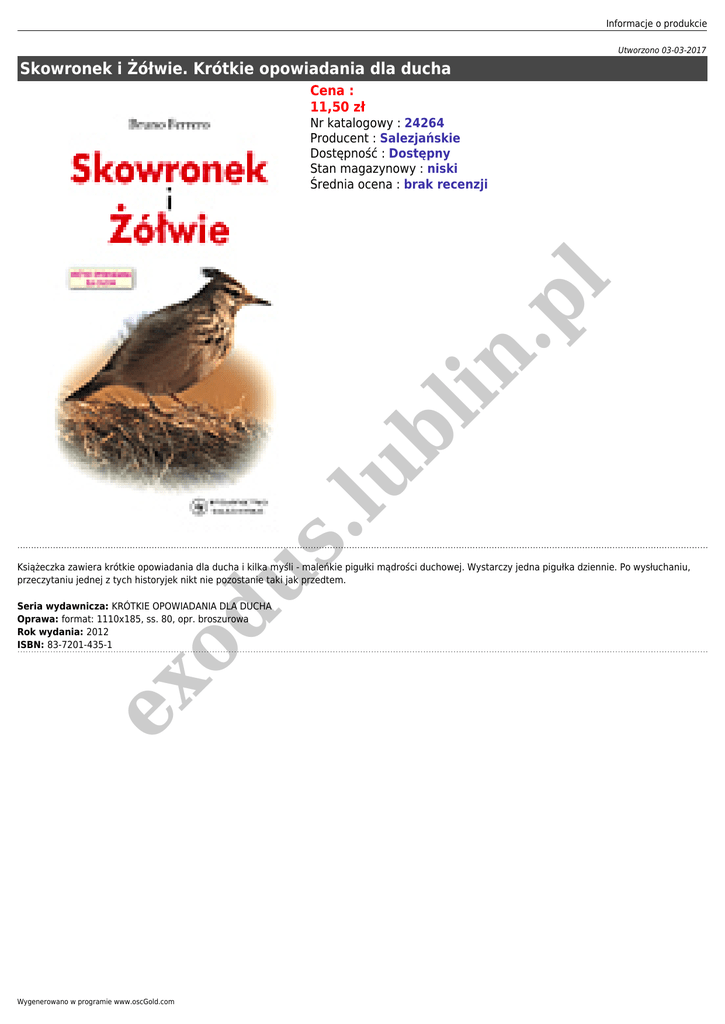 Informacje o produkcie Utworzono 03-03-2017 Skowronek i Żółwie. Krótkie opowiadania dla ducha Cena : 11,50 zł od us .lu bl in .p l Nr katalogowy : 24264 Producent : Salezjańskie Dostępność : Dostępny Stan magazynowy : niski Średnia ocena : brak recenzji Książeczka zawiera krótkie opowiadania dla ducha i kilka myśli - maleńkie pigułki mądrości duchowej. Wystarczy jedna pigułka dziennie. Po wysłuchaniu, przeczytaniu jednej z tych historyjek nikt nie pozostanie taki jak przedtem. ex Seria wydawnicza: KRÓTKIE OPOWIADANIA DLA DUCHA Oprawa: format: 1110x185, ss. 80, opr. broszurowa Rok wydania: 2012 ISBN: 83-7201-435-1 Wygenerowano w programie www.oscGold.com