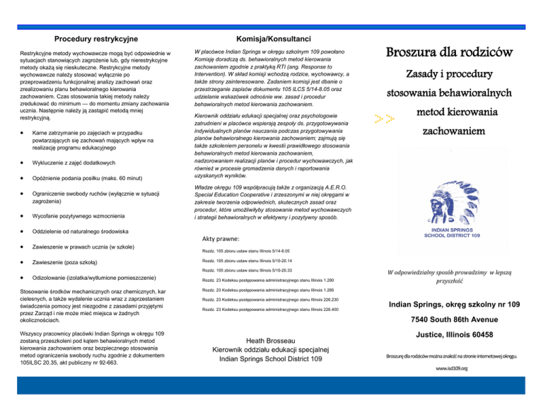 Procedury restrykcyjne Restrykcyjne metody wychowawcze mogą być odpowiednie w sytuacjach stanowiących zagrożenie lub, gdy nierestrykcyjne metody okażą się nieskuteczne. Restrykcyjne metody wychowawcze należy stosować wyłącznie po przeprowadzeniu funkcjonalnej analizy zachowań oraz zrealizowaniu planu behawioralnego kierowania zachowaniem. Czas stosowania takiej metody należy zredukować do minimum — do momentu zmiany zachowania ucznia. Następnie należy ją zastąpić metodą mniej restrykcyjną. Karne zatrzymanie po zajęciach w przypadku powtarzających się zachowań mających wpływ na realizację programu edukacyjnego Wykluczenie z zajęć dodatkowych Opóźnienie podania posiłku (maks. 60 minut) Ograniczenie swobody ruchów (wyłącznie w sytuacji zagrożenia) Wycofanie pozytywnego wzmocnienia Oddzielenie od naturalnego środowiska Zawieszenie w prawach ucznia (w szkole) Zawieszenie (poza szkołą) Odizolowanie (izolatka/wytłumione pomieszczenie) Komisja/Konsultanci W placówce Indian Springs w okręgu szkolnym 109 powołano Komisję doradczą ds. behawioralnych metod kierowania zachowaniem zgodnie z praktyką RTI (ang. Response to Intervention). W skład komisji wchodzą rodzice, wychowawcy, a także strony zainteresowane. Zadaniem komisji jest dbanie o przestrzeganie zapisów dokumentu 105 ILCS 5/14-8.05 oraz udzielanie wskazówek odnośnie ww. zasad i procedur behawioralnych metod kierowania zachowaniem. Kierownik oddziału edukacji specjalnej oraz psychologowie zatrudnieni w placówce wspierają zespoły ds. przygotowywania indywidualnych planów nauczania podczas przygotowywania planów behawioralnego kierowania zachowaniem; zajmują się także szkoleniem personelu w kwestii prawidłowego stosowania behawioralnych metod kierowania zachowaniem, nadzorowaniem realizacji planów i procedur wychowawczych, jak również w procesie gromadzenia danych i raportowania uzyskanych wyników. Broszura dla rodziców Zasady i procedury stosowania behawioralnych metod kierowania zachowaniem Władze okręgu 109 współpracują także z organizacją A.E.R.O. Special Education Cooperative i zrzeszonymi w niej okręgami w zakresie tworzenia odpowiednich, skutecznych zasad oraz procedur, które umożliwiłyby stosowanie metod wychowawczych i strategii behawioralnych w efektywny i pozytywny sposób. Akty prawne: Rozdz. 105 zbioru ustaw stanu Illinois 5/14-8.05 Rozdz. 105 zbioru ustaw stanu Illinois 5/10-20.14 Rozdz. 105 zbioru ustaw stanu Illinois 5/10-20.33 Stosowanie środków mechanicznych oraz chemicznych, kar cielesnych, a także wydalenie ucznia wraz z zaprzestaniem świadczenia pomocy jest niezgodne z zasadami przyjętymi przez Zarząd i nie może mieć miejsca w żadnych okolicznościach. Wszyscy pracownicy placówki Indian Springs w okręgu 109 zostaną przeszkoleni pod kątem behawioralnych metod kierowania zachowaniem oraz bezpiecznego stosowania metod ograniczenia swobody ruchu zgodnie z dokumentem 105ILSC 20.35, akt publiczny nr 92-663. Rozdz. 23 Kodeksu postępowania administracyjnego stanu Illinois 1.280 W odpowiedzialny sposób prowadzimy w lepszą przyszłość Rozdz. 23 Kodeksu postępowania administracyjnego stanu Illinois 1.285 Rozdz. 23 Kodeksu postępowania administracyjnego stanu Illinois 226.230 Rozdz. 23 Kodeksu postępowania administracyjnego stanu Illinois 226.400 Indian Springs, okręg szkolny nr 109 7540 South 86th Avenue Heath Brosseau Kierownik oddziału edukacji specjalnej Indian Springs School District 109 Justice, Illinois 60458 Broszurę dla rodziców można znaleźć na stronie internetowej okręgu. www.isd109.org Zasady Procedury Pracownicy placówki Indian Springs w okręgu szkolnym nr 109 oraz organizacji A.E.R.O. Special Education Cooperative, zgodnie z aktem publicznym 89-191, opracowali niniejsze zasady behawioralnych metod kierowania zachowaniem dla uczniów ze specjalnymi potrzebami edukacyjnymi uczęszczających do szkół w okręgu szkolnym oraz korzystających z programów A.E.R.O. Metody behawioralne należy stosować z uwzględnieniem prawa do fizycznej wolności dzieci, interakcji społecznych, a także prawa do umieszczenia w mniej restrykcyjnym środowisku, z poszanowaniem godności ludzkiej i prawa do prywatności. Fundamentalną zasadą jest preferowanie i stosowanie w maksymalnym możliwym zakresie nieawersyjnych bądź pozytywnych metod wychowawczych mających na celu pobudzanie i wzmacnianie pożądanych zachowań zamiast metod awersyjnych lub bardziej restrykcyjnych. Poniższe procedury opracowano w celu zachęcania do przestrzegania najlepszych branżowych standardów i praktyk podczas stosowania behawioralnych metod kierowania zachowaniem. Ich celem powinno być egzekwowanie bardziej odpowiednich, pożądanych zachowań z wykorzystaniem procedur oraz metod zgodnych z ogólnie przyjętymi praktykami w dziedzinie behawioralnych metod kierowania zachowaniem. Stosowanie wyłącznie pozytywnych metod wychowawczych nie zapewni sukcesu w każdej sytuacji wymagającej wyeliminowania zachowania powodującego zakłócenie procesu edukacyjnego dziecka i innych uczniów, jednak bardziej restrykcyjne metody wychowawcze powinny być zawsze traktowane, jako rozwiązanie tymczasowe i stosowane z rozwagą oraz w sposób zgodny z przepisami. Stosując restrykcyjne metody wychowawcze należy zachować szacunek dla godności ucznia, jego prywatności, a także postępować z dbałością o bezpieczeństwo ucznia i przestrzegać ogólnie obowiązujących praktyk branżowych. Metody pozytywne i nierestrykcyjne mają za zadanie zachęcać do odpowiednich zachowań i redukować zachowania negatywne. Są to działania preferowane ze względu na niskie ryzyko wystąpienia skutków ubocznych, jak również na duży nacisk na zmianę zachowania zamiast jego kontrolowania. Metody pozytywne i nierestrykcyjne mogą być stosowane bez uprzedniego sporządzenia planu behawioralnych metod kierowania zachowaniem lub zgodnie z zaleceniami określonymi w in