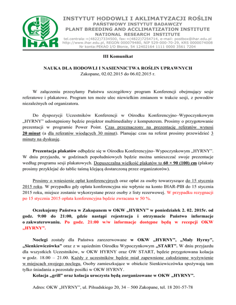 INSTYTUT HODOWLI I AKLIMATYZACJI ROŚLIN PAŃSTWOWY INSTYTUT BADAWCZY PLANT BREEDING AND ACCLIMATIZATION INSTITUTE NATIONAL RESEARCH INSTITUTE tel.centrala:+(4822)7334500, fax:+(4822)7254714, e-mail: [email protected] http://www.ihar.edu.pl, REGON 000079480, NIP 529-000-70-29, KRS 0000074008 Nr konta:PEKAO I/O Błonie, 54 12402164 1111 0000 3561 7204 III Komunikat NAUKA DLA HODOWLI I NASIENNICTWA ROŚLIN UPRAWNYCH Zakopane, 02.02.2015 do 06.02.2015 r. W załączeniu przesyłamy Państwu szczegółowy program Konferencji obejmujący sesje referatowe i plakatowe. Program ten może ulec niewielkim zmianom w trakcie sesji, z powodów niezależnych od organizatora. Do dyspozycji Uczestników Konferencji w Ośrodku Konferencyjno–Wypoczynkowym „HYRNY” udostępniony będzie projektor multimedialny z komputerem. Prosimy o przygotowanie prezentacji w programie Power Point. Czas przeznaczony na prezentację referatów wynosi 20 minut (a dla referatów wiodących 30 minut). Planując czas na referat prosimy przewidzieć 3 minuty na dyskusję. Prezentacja plakatów odbędzie się w Ośrodku Konferencyjno–Wypoczynkowym „HYRNY”. W dniu przyjazdu, w godzinach popołudniowych będzie można umieszczać swoje prezentacje według programu sesji plakatowych. Dopuszczalna wielkość plakatów to 60 × 90 (100) cm (plakaty prosimy przyklejać do tablic taśmą klejącą dostarczoną przez organizatorów). Prosimy o wniesienie opłat konferencyjnych oraz opłat za osoby towarzyszące do 15 stycznia 2015 roku. W przypadku gdy opłata konferencyjna nie wpłynie na konto IHAR-PIB do 15 stycznia 2015 roku, miejsce zostanie wykorzystane przez osoby z listy rezerwowej. W przypadku rezygnacji po 15 stycznia 2015 opłata konferencyjna będzie zwracana w 50 %. Oczekujemy Państwa w Zakopanem w OKW „HYRNY” w poniedziałek 2. 02. 2015r. od godz. 9:00 do 21:00, gdzie nastąpi rejestracja i otrzymacie Państwo informacje o zakwaterowaniu. Po godz. 21:00 w/w informacje dostępne będą w recepcji OKW „HYRNY”. Noclegi zostały dla Państwa zarezerwowane w OKW „HYRNY”, „Mały Hyrny”, „Sienkiewiczówka” oraz z w sąsiednim Ośrodku Wypoczynkowym „START”. W dniu przyjazdu dla wszystkich Uczestników, w OKW HYRNY oraz OW START, będzie przygotowana kolacja w godz. 18.00 – 21.00. Każdy z uczestników będzie miał zapewnione całodzienne wyżywienie w miejscach swojego noclegu. Osoby zamieszkujące w obiekcie Sienkiewiczówka spożywają tam tylko śniadania a pozostałe posiłki w OKW HYRNY. Kolacja „grill” oraz kolacja uroczysta będą zorganizowane w OKW „HYRNY”. Adres: OKW „HYRNY”, ul. Piłsudskiego 20, 34 – 500 Zakopane, tel. 18 201-57-78 Adres „Sienkiewiczówka”, ul. Zamoyskiego 21, 34-500 Zakopane, tel. 18 201 27 63 Adres OW „START”, ul. Piłsudskiego 22, 34-500 Zakopane, tel. 18 206 13 94 Adres „Mały Hyrny”, ul. Piłsudskiego 20, 34 – 500 Zakopane, tel. 18 201-57-78 W czasie trwania konferencji w OKW „HYRNY” do dyspozycji Państwa będzie udostępniona szatnia z obsługą. Organizatorzy nie zapewniają miejsc parkingowych dla samochodów. Planowane jest specjalne wydanie Biuletynu IHAR-PIB po Konferencji. Prace konferencyjne należy przesłać na adres Sekretarza Redakcji Pani mgr Gabrielli WodzyńskiejŁapińskiej: [email protected] lub na dotychczasowy e-mail Konferencji [email protected] do dnia 31 marca 2015 roku. Artykuły będą recenzowane. Opłatę za druk publikacji w Biuletynie IHAR-PIB (100 PLN) należy wnieść na podane konto Instytutu http://www.ihar.edu.pl/biuletyn_ihar.php. Informujemy, że w OKW „HYRNY” istnieje możliwość korzystania z gabinetu odnowy biologicznej, za dodatkową opłatą wg pakietu usług. Ważna informacja: W obiektach hotelowych we wszystkich pomieszczeniach (pokoje, hole, korytarze) obowiązuje bezwzględny zakaz palenia papierosów (zainstalowane czujniki). W imieniu Komitetu Organizacyjnego Konferencji Karolina Mitura 2
