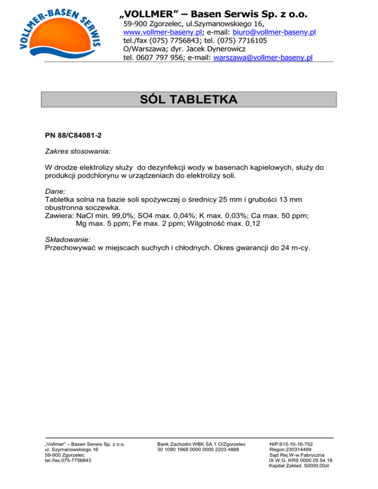 „VOLLMER” – Basen Serwis Sp. z o.o. 59-900 Zgorzelec, ul.Szymanowskiego 16, www.vollmer-baseny.pl; e-mail: [email protected] tel./fax (075) 7756843; tel. (075) 7716105 O/Warszawa; dyr. Jacek Dynerowicz tel. 0607 797 956; e-mail: [email protected] SÓL TABLETKA PN 88/C84081-2 Zakres stosowania: W drodze elektrolizy służy do dezynfekcji wody w basenach kąpielowych, służy do produkcji podchlorynu w urządzeniach do elektrolizy soli. Dane: Tabletka solna na bazie soli spożywczej o średnicy 25 mm i grubości 13 mm obustronna soczewka. Zawiera: NaCl min. 99,0%; SO4 max. 0,04%; K max. 0,03%; Ca max. 50 ppm; Mg max. 5 ppm; Fe max. 2 ppm; Wilgotność max. 0,12 Składowanie: Przechowywać w miejscach suchych i chłodnych. Okres gwarancji do 24 m-cy. „Vollmer” – Basen Serwis Sp. z o.o. ul. Szymanowskiego 16 59-900 Zgorzelec tel./fax:075-7756843 Bank Zachodni WBK SA 1 O/Zgorzelec 30 1090 1968 0000 0005 2203 4888 NIP:615-10-16-752 Regon:230314499 Sąd Rej.W-w Fabryczna IX W.G. KRS 0000 05 54 18 Kapitał Zakład. 50000,00zł