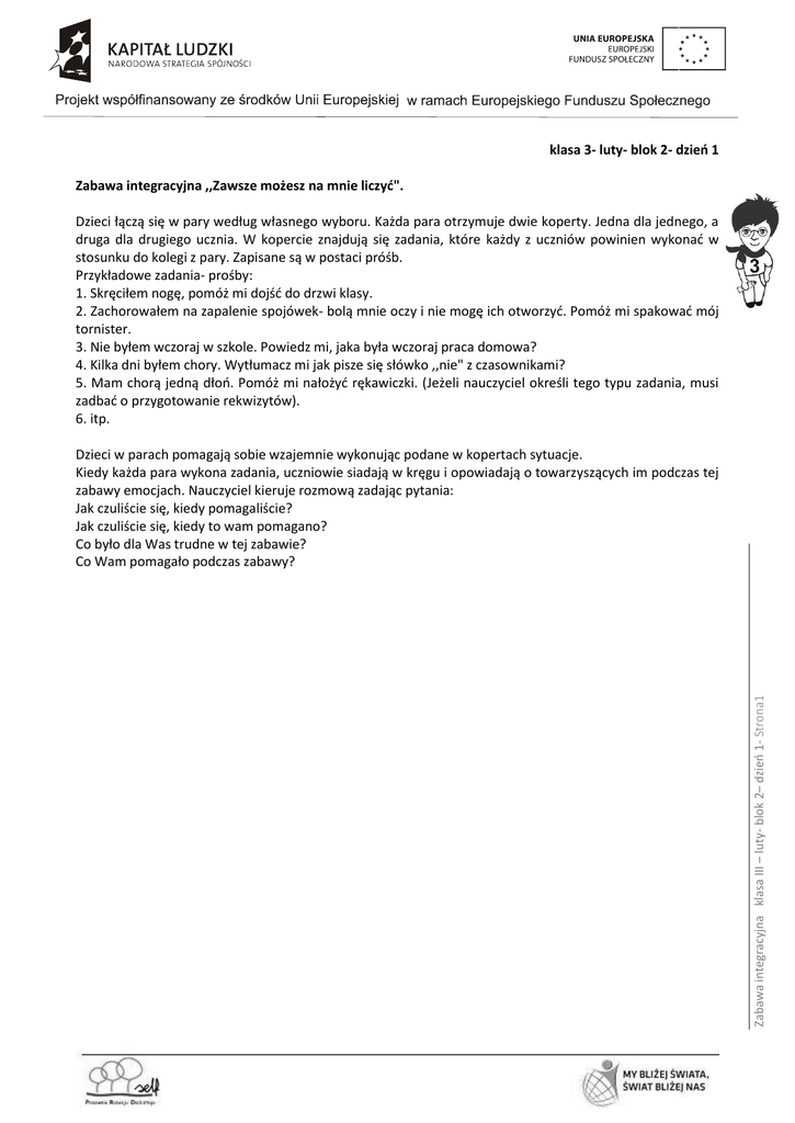 klasa 3- luty- blok 2- dzień 1 Zabawa integracyjna ,,Zawsze możesz na mnie liczyć". Dzieci łączą się w pary według własnego wyboru. Każda para otrzymuje dwie koperty. Jedna dla jednego, a druga dla drugiego ucznia. W kopercie znajdują się zadania, które każdy z uczniów powinien wykonać w stosunku do kolegi z pary. Zapisane są w postaci próśb. Przykładowe zadania- prośby: 1. Skręciłem nogę, pomóż mi dojść do drzwi klasy. 2. Zachorowałem na zapalenie spojówek- bolą mnie oczy i nie mogę ich otworzyć. Pomóż mi spakować mój tornister. 3. Nie byłem wczoraj w szkole. Powiedz mi, jaka była wczoraj praca domowa? 4. Kilka dni byłem chory. Wytłumacz mi jak pisze się słówko ,,nie" z czasownikami? 5. Mam chorą jedną dłoń. Pomóż mi nałożyć rękawiczki. (Jeżeli nauczyciel określi tego typu zadania, musi zadbać o przygotowanie rekwizytów). 6. itp. Zabawa integracyjna klasa III – luty- blok 2– dzień 1- Strona1 Dzieci w parach pomagają sobie wzajemnie wykonując podane w kopertach sytuacje. Kiedy każda para wykona zadania, uczniowie siadają w kręgu i opowiadają o towarzyszących im podczas tej zabawy emocjach. Nauczyciel kieruje rozmową zadając pytania: Jak czuliście się, kiedy pomagaliście? Jak czuliście się, kiedy to wam pomagano? Co było dla Was trudne w tej zabawie? Co Wam pomagało podczas zabawy?