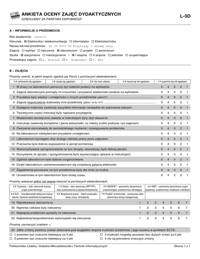 ANKIETA OCENY ZAJĘĆ DYDAKTYCZNYCH L-3D DZIĘKUJEMY ZA PAŃSTWA ODPOWIEDZI A – INFORMACJE O PRZEDMIOCIE Rok akademicki 2010/11 Kierunek Elektronika i telekomunikacja Informatyka Elektrotechnika Nazwa lub kod przedmiotu 02 39 0470 00 Przyrządy i układy mocy Zajęcia wykład ćwiczenia laboratorium projekt seminarium Studia stacjonarne niestacjonarne / I stopnia II stopnia jednolite uzupełniające Prowadzący zajęcia Ł. Starzak K. Grabowski C. Maj B – ZAJĘCIA Prosimy ocenić, w jakim stopniu zgadza się Pan(i) z poniższymi stwierdzeniami. 5 całkowicie się zgadzam 4 raczej się zgadzam 3 nie mam zdania 2 raczej się nie zgadzam 1 zupełnie się nie zgadzam 1 W pracy na laboratorium pomocny był materiał podany na wykładzie. 5 4 3 2 1 2 Zajęcia laboratoryjne pomogły mi zrozumieć i przyswoić wiadomości podane na wykładzie. 5 4 3 2 1 3 Przydatne były wiedza i umiejętności z innych przedmiotów (jakich?) ...................................................... . 5 4 3 2 1 4 Zajęcia niepotrzebnie dublowały inne przedmioty (jakie i w ilu %?) ............................................................ . 5 4 3 2 1 5 Dostępne materiały zawierały wszystkie informacje niezbędne do wykonania ćwiczeń. 5 4 3 2 1 6 Teoretyczne części instrukcji były napisane przystępnie. 5 4 3 2 1 7 Wiadomości teoretyczne zawarte w instrukcjach były zbyt obszerne. 5 4 3 2 1 8 Instrukcje zawierały kompletne i jasne wskazówki, co należy zrobić podczas i po zajęciach. 5 4 3 2 1 9 Ćwiczenia stymulowały do samodzielnego myślenia i rozwiązywania problemów. 5 4 3 2 1 10 Na laboratorium zdobyłem/am przydatne umiejętności. 5 4 3 2 1 11 Laboratorium wymagało zbyt dużego nakładu pracy poza zajęciami. 5 4 3 2 1 12 Pracownia była dobrze wyposażona w sprzęt pomiarowy. 5 4 3 2 1 13 Wykorzystywane oprogramowanie (w tym skrypty, skoroszyty) było dobrej jakości. 5 4 3 2 1 14 Korzystanie ze sprzętu i oprogramowania było wystarczająco opisane w instrukcjach. 5 4 3 2 1 15 Ogólnie laboratorium było dobrze zorganizowane. 5 4 3 2 1 16 Dzięki laboratorium zainteresowałem/am się omawianą gałęzią elektroniki. 5 4 3 2 1 17 Zagadnienia poruszane na tym przedmiocie były dla mnie za trudne. 5 4 3 2 1 18 Uczestnictwo w tym laboratorium było stratą czasu. 5 4 3 2 1 Prosimy wskazać jedno lub więcej ćwiczeń w poniższych stwierdzeniach. 2 Tyrystory – triak, sterownik fazowy prądu przemiennego 1 Diody – stan zaworowy (NPT/PT), stan przewodzenia (unipolarne/bipolarne) 3 MOSFET – parametry dynamiczne (czas/energia), przetwornica obniżająca 5 BJT – charakterystyki statyczne tranzystorów, falownik świetlówki kompaktowej 6 Bezpieczna praca – dobór przyrządu, straty mocy, chłodzenie 7 Projekt i konstrukcja – przerywacz jako ściemniacz lampy halogenowej 4 IGBT – parametry dynamiczne (ogon prądowy), przetwornica mostkowa z silnikiem 19 Najciekawsze ćwiczenia to: 1 2 3 4 5 6 7 20 Najmniej ciekawe były ćwiczenia: 1 2 3 4 5 6 7 21 Najwięcej problemów sprawiły mi ćwiczenia: 1 2 3 4 5 6 7 22 Najbardziej bezproblemowo wykonywało się ćwiczenia: 1 2 3 4 5 6 7 Prosimy zaznaczyć znakiem ×: 23 Jakie zmiany powinny zostać dokonane pod względem stopnia trudności przedmiotu i jego wyceny w punktach ECTS: 1 powinien być znacznie łatwiejszy za 3 pkt 2 powinien być znacznie łatwiejszy za 4 pkt 3 trudność mogłaby pozostać bez dużych zmian za 4 pkt 4 nie są potrzebne znaczące zmiany Politechnika Łódzka / Katedra Mikroelektroniki i Technik Informatycznych Strona 1 z 1 C – PROWADZĄCY(A) Prosimy ocenić, w jakim stopniu zgadza się Pan(i) z poniższymi stwierdzeniami. 5 całkowicie się zgadzam 4 raczej się zgadzam 3 nie mam zdania 2 raczej się nie zgadzam 1 zupełnie się nie zgadzam 24 Punktualnie rozpoczynał(a) i kończył(a) zajęcia, uprzedzał(a) o przełożonych zajęciach. 5 4 3 2 1 25 Wykazał(a) się kompetencją w dziedzinie prowadzonych zajęć. 5 4 3 2 1 26 Chętnie odpowiadał(a) na pytania. 5 4 3 2 1 27 Jego/jej wyjaśnienia były zrozumiałe i przydatne. 5 4 3 2 1 28 Interesował(a) się postępami w pracy i jej wynikami. 5 4 3 2 1 29 Potrafił(a) zmotywować mnie do pracy. 5 4 3 2 1 30 Stymulował(a) do samodzielnego myślenia i rozwiązywania problemów. 5 4 3 2 1 31 Sprawiedliwie dzielił(a) swoją uwagę między zespoły. 5 4 3 2 1 32 Był(a) dostępny/a w czasie wyznaczonych godzin przyjęć. 5 4 3 2 1 33 Sprawdzał(a) sprawozdania i kolokwia w wystarczająco krótkim czasie. 5 4 3 2 1 34 Oceny kolokwiów i pracy (sprawozdań) były sprawiedliwe. 5 4 3 2 1 D – UWAGI DODATKOWE Jakie były dobre strony zajęć? Jakie zagadnienia mogłyby być wyjaśnione lepiej, dokładniej, poruszone w większej liczbie ćwiczeń itp.? Co jeszcze mogłoby zostać zmienione / poprawione? Inne uwagi o laboratorium i ankiecie E – ANKIETA 5 całkowicie się zgadzam 4 raczej się zgadzam 3 nie mam zdania 2 raczej się nie zgadzam 35 Myślę, że warto było poświęcić czas na wypełnienie tej ankiety i zostanie ona wykorzystana przez osoby odpowiedzialne za laboratorium do jego ulepszenia. Politechnika Łódzka / Katedra Mikroelektroniki i Technik Informatycznych 1 zupełnie się nie zgadzam 5 4 3 2 1 Strona 2 z 2
