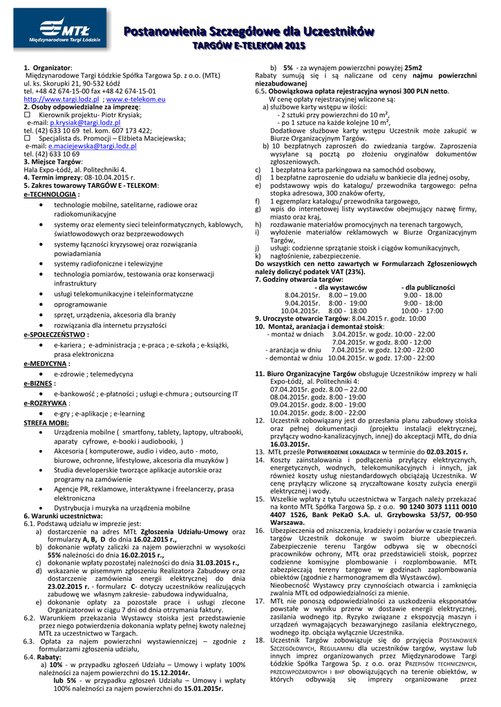 PPoossttaannoow wiieenniiaa SSzzcczzeeggóółłoow wee ddllaa U Ucczzeessttnniikkóów w TTAARRGGÓ ÓW W EE--TTEELLEEKKO OM M 22001155 1. Organizator: Międzynarodowe Targi Łódzkie Spółka Targowa Sp. z o.o. (MTŁ) ul. ks. Skorupki 21, 90-532 Łódź tel. +48 42 674-15-00 fax +48 42 674-15-01 http://www.targi.lodz.pl ; www.e-telekom.eu 2. Osoby odpowiedzialne za imprezę: Kierownik projektu- Piotr Krysiak; e-mail: [email protected] tel. (42) 633 10 69 tel. kom. 607 173 422; Specjalista ds. Promocji – Elżbieta Maciejewska; e-mail: [email protected] tel. (42) 633 10 69 3. Miejsce Targów: Hala Expo-Łódź, al. Politechniki 4. 4. Termin imprezy: 08-10.04.2015 r. 5. Zakres towarowy TARGÓW E - TELEKOM: e-TECHNOLOGIA : technologie mobilne, satelitarne, radiowe oraz radiokomunikacyjne systemy oraz elementy sieci teleinformatycznych, kablowych, światłowodowych oraz bezprzewodowych systemy łączności kryzysowej oraz rozwiązania powiadamiania systemy radiofoniczne i telewizyjne technologia pomiarów, testowania oraz konserwacji infrastruktury usługi telekomunikacyjne i teleinformatyczne oprogramowanie sprzęt, urządzenia, akcesoria dla branży rozwiązania dla internetu przyszłości e-SPOŁECZEŃSTWO : e-kariera ; e-administracja ; e-praca ; e-szkoła ; e-książki, prasa elektroniczna e-MEDYCYNA : e-zdrowie ; telemedycyna e-BIZNES : e-bankowość ; e-płatności ; usługi e-chmura ; outsourcing IT e-ROZRYWKA : e-gry ; e-aplikacje ; e-learning STREFA MOBI: Urządzenia mobilne ( smartfony, tablety, laptopy, ultrabooki, aparaty cyfrowe, e-booki i audiobooki, ) Akcesoria ( komputerowe, audio i video, auto - moto, biurowe, ochronne, lifestylowe, akcesoria dla muzyków ) Studia developerskie tworzące aplikacje autorskie oraz programy na zamówienie Agencje PR, reklamowe, interaktywne i freelancerzy, prasa elektroniczna Dystrybucja i muzyka na urządzenia mobilne 6. Warunki uczestnictwa: 6.1. Podstawą udziału w imprezie jest: a) dostarczenie na adres MTŁ Zgłoszenia Udziału-Umowy oraz formularzy A, B, D do dnia 16.02.2015 r., b) dokonanie wpłaty zaliczki za najem powierzchni w wysokości 55% należności do dnia 16.02.2015 r., c) dokonanie wpłaty pozostałej należności do dnia 31.03.2015 r., d) wskazanie w pisemnym zgłoszeniu Realizatora Zabudowy oraz dostarczenie zamówienia energii elektrycznej do dnia 23.02.2015 r. - formularz C- dotyczy uczestników realizujących zabudowę we własnym zakresie- zabudowa indywidualna, e) dokonanie opłaty za pozostałe prace i usługi zlecone Organizatorowi w ciągu 7 dni od dnia otrzymania faktury. 6.2. Warunkiem przekazania Wystawcy stoiska jest przedstawienie przez niego potwierdzenia dokonania wpłaty pełnej kwoty należnej MTŁ za uczestnictwo w Targach. 6.3. Opłata za najem powierzchni wystawienniczej – zgodnie z formularzami zgłoszenia udziału, 6.4. Rabaty: a) 10% - w przypadku zgłoszeń Udziału – Umowy i wpłaty 100% należności za najem powierzchni do 15.12.2014r. lub 5% - w przypadku zgłoszeń Udziału – Umowy i wpłaty 100% należności za najem powierzchni do 15.01.2015r. b) 5% - za wynajem powierzchni powyżej 25m2 Rabaty sumują się i są naliczane od ceny najmu powierzchni niezabudowanej 6.5. Obowiązkowa opłata rejestracyjna wynosi 300 PLN netto. W cenę opłaty rejestracyjnej wliczone są: a) służbowe karty wstępu w ilości: - 2 sztuki przy powierzchni do 10 m², - po 1 sztuce na każde kolejne 10 m², Dodatkowe służbowe karty wstępu Uczestnik może zakupić w Biurze Organizacyjnym Targów. b) 10 bezpłatnych zaproszeń do zwiedzania targów. Zaproszenia wysyłane są pocztą po złożeniu oryginałów dokumentów zgłoszeniowych. c) 1 bezpłatna karta parkingowa na samochód osobowy, d) 1 bezpłatne zaproszenie do udziału w bankiecie dla jednej osoby, e) podstawowy wpis do katalogu/ przewodnika targowego: pełna stopka adresowa, 300 znaków oferty, f) 1 egzemplarz katalogu/ przewodnika targowego, g) wpis do internetowej listy wystawców obejmujący nazwę firmy, miasto oraz kraj, h) rozdawanie materiałów promocyjnych na terenach targowych, i) wyłożenie materiałów reklamowych w Biurze Organizacyjnym Targów, j) usługi: codzienne sprzątanie stoisk i ciągów komunikacyjnych, k) nagłośnienie, zabezpieczenie. Do wszystkich cen netto zawartych w Formularzach Zgłoszeniowych należy doliczyć podatek VAT (23%). 7. Godziny otwarcia targów: - dla wystawców - dla publiczności 8.04.2015r. 8.00 – 19.00 9.00 - 18.00 9.04.2015r. 8:00 - 19:00 9:00 - 18:00 10.04.2015r. 8:00 - 18:00 10:00 - 17:00 9. Uroczyste otwarcie Targów: 8.04.2015 r. godz. 10:00 10. Montaż, aranżacja i demontaż stoisk: - montaż w dniach 3.04.2015r. w godz. 10:00 - 22:00 7.04.2015r. w godz. 8:00 - 12:00 - aranżacja w dniu 7.04.2015r. w godz. 12:00 - 22:00 - demontaż w dniu 10.04.2015r. w godz. 17:00 - 22:00 11. Biuro Organizacyjne Targów obsługuje Uczestników imprezy w hali Expo-Łódź, al. Politechniki 4: 07.04.2015r. godz. 8.00 – 22.00 08.04.2015r. godz. 8:00 - 19:00 09.04.2015r. godz. 8:00 - 19:00 10.04.2015r. godz. 8:00 - 22:00 12. Uczestnik zobowiązany jest do przesłania planu zabudowy stoiska oraz pełnej dokumentacji (projektu instalacji elektrycznej, przyłączy wodno-kanalizacyjnych, innej) do akceptacji MTŁ, do dnia 16.03.2015r. 13. MTŁ prześle POTWIERDZENIE LOKALIZACJI w terminie do 02.03.2015 r. 14. Koszty zainstalowania i podłączenia przyłączy elektrycznych, energetycznych, wodnych, telekomunikacyjnych i innych, jak również koszty usług niestandardowych obciążają Uczestnika. W cenę przyłączy wliczone są zryczałtowane koszty zużycia energii elektrycznej i wody. 15. Wszelkie wpłaty z tytułu uczestnictwa w Targach należy przekazać na konto MTŁ Spółka Targowa Sp. z o.o. 90 1240 3073 1111 0010 4407 1526, Bank PeKaO S.A. ul. Grzybowska 53/57, 00-950 Warszawa. 16. Ubezpieczenia od zniszczenia, kradzieży i pożarów w czasie trwania targów Uczestnik dokonuje w swoim biurze ubezpiec