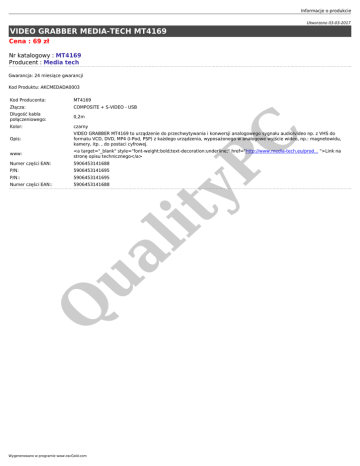 Informacje o produkcie Utworzono 03-03-2017 VIDEO GRABBER MEDIA-TECH MT4169 Cena : 69 zł Nr katalogowy : MT4169 Producent : Media tech Gwarancja: 24 miesiące gwarancji Kod Produktu: AKCMEDADA0003 MT4169 Złącza: COMPOSITE + S-VIDEO - USB Długość kabla połączeniowego: 0,2m Kolor: czarny Opis: VIDEO GRABBER MT4169 to urządzenie do przechwytywania i konwersji analogowego sygnału audio/video np. z VHS do formatu VCD, DVD, MP4 (I-Pod, PSP) z każdego urządzenia, wyposażonego w analogowe wyjście wideo, np.: magnetowidu, kamery, itp. , do postaci cyfrowej. www: <a target="_blank" style="font-weight:bold;text-decoration:underline;" href="http://www.media-tech.eu/prod... ">Link na stronę opisu technicznego</a> Numer części EAN: 5906453141688 P/N: 5906453141695 P/N:: 5906453141695 Numer części EAN:: 5906453141688 Q ua lit yP C Kod Producenta: Wygenerowano w programie www.oscGold.com