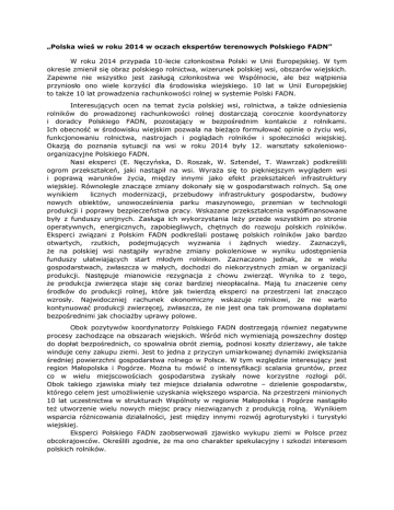 „Polska wieś w roku 2014 w oczach ekspertów terenowych Polskiego FADN” W roku 2014 przypada 10-lecie członkostwa Polski w Unii Europejskiej. W tym okresie zmienił się obraz polskiego rolnictwa, wizerunek polskiej wsi, obszarów wiejskich. Zapewne nie wszystko jest zasługą członkostwa we Wspólnocie, ale bez wątpienia przyniosło ono wiele korzyści dla środowiska wiejskiego. 10 lat w Unii Europejskiej to także 10 lat prowadzenia rachunkowości rolnej w systemie Polski FADN. Interesujących ocen na temat życia polskiej wsi, rolnictwa, a także odniesienia rolników do prowadzonej rachunkowości rolnej dostarczają corocznie koordynatorzy i doradcy Polskiego FADN, pozostający w bezpośrednim kontakcie z rolnikami. Ich obecność w środowisku wiejskim pozwala na bieżąco formułować opinie o życiu wsi, funkcjonowaniu rolnictwa, nastrojach i poglądach rolników i społeczności wiejskiej. Okazją do poznania sytuacji na wsi w roku 2014 były 12. warsztaty szkoleniowoorganizacyjne Polskiego FADN. Nasi eksperci (E. Nęczyńska, D. Roszak, W. Sztendel, T. Wawrzak) podkreślili ogrom przekształceń, jaki nastąpił na wsi. Wyraża się to piękniejszym wyglądem wsi i poprawą warunków życia, między innymi jako efekt przekształceń infrastruktury wiejskiej. Równolegle znaczące zmiany dokonały się w gospodarstwach rolnych. Są one wynikiem licznych modernizacji, przebudowy infrastruktury gospodarstw, budowy nowych obiektów, unowocześnienia parku maszynowego, przemian w technologii produkcji i poprawy bezpieczeństwa pracy. Wskazane przekształcenia współfinansowane były z funduszy unijnych. Zasługa ich wykorzystania leży przede wszystkim po stronie operatywnych, energicznych, zapobiegliwych, chętnych do rozwoju polskich rolników. Eksperci związani z Polskim FADN podkreślali postawę polskich rolników jako bardzo otwartych, rzutkich, podejmujących wyzwania i żądnych wiedzy. Zaznaczyli, że na polskiej wsi nastąpiły wyraźne zmiany pokoleniowe w wyniku udostępnienia funduszy ułatwiających start młodym rolnikom. Zaznaczono jednak, że w wielu gospodarstwach, zwłaszcza w małych, dochodzi do niekorzystnych zmian w organizacji produkcji. Następuje mianowicie rezygnacja z chowu zwierząt. Wynika to z tego, że produkcja zwierzęca staje się coraz bardziej nieopłacalna. Mają tu znaczenie ceny środków do produkcji rolnej, które jak twierdzą eksperci na przestrzeni lat znacząco wzrosły. Najwidoczniej rachunek ekonomiczny wskazuje rolnikowi, że nie warto kontynuować produkcji zwierzęcej, zwłaszcza, że nie jest ona tak promowana dopłatami bezpośrednimi jak chociażby uprawy polowe. Obok pozytywów koordynatorzy Polskiego FADN dostrzegają również negatywne procesy zachodzące na obszarach wiejskich. Wśród nich wymieniają powszechny dostęp do dopłat bezpośrednich, co spowalnia obrót ziemią, podnosi koszty dzierżawy, ale także winduje ceny zakupu ziemi. Jest to jedna z przyczyn umiarkowanej dynamiki zwiększania średniej powierzchni gospodarstwa rolnego w Polsce. W tym względzie interesujący jest region Małopolska i Pogórze. Można tu mówić o intensyfikacji scalania gruntów, przez co w wielu miejscowościach gospodarstwa zyskały nowe korzystne rozłogi pól. Obok takiego zjawiska miały też miejsce działania odwrotne – dzielenie gospodarstw, którego celem jest umożliwienie uzyskania większego wsparcia. Na przestrzeni minionych 10 lat uczestnictwa w strukturach Wspólnoty w regionie Małopolska i Pogórze nastąpiło też utworzenie wielu nowych miejsc pracy niezwiązanych z produkcją rolną. Wynikiem wsparcia różnicowania działalności, jest między innymi rozwój agroturystyki i turystyki wiejskiej. Eksperci Polskiego FADN zaobserwowali zjawisko wykupu ziemi w Polsce przez obcokrajowców. Określili zgodnie, że ma ono charakter spekulacyjny i szkodzi interesom polskich rolników. W opinii naszych specjalistów godne uwagi pozostaje też nasilenie działań na rzecz ochrony polskich dóbr naturalnych dzięki licznym programom środowiskowym. Rocznica obchodów 10-lecia Polskiego FADN była okazją do oceny funkcjonowania systemu rachunkowości i podkreślenia rangi doradców rolnych w funkcjonowaniu polskiego rolnictwa. Zauważono, że prowadzenie rachunkowości rolnej nauczyło wielu rolników gospodarowania z wykorzystaniem rachunku ekonomicznego, porządkowania dokumentów i efektywniejszej organizacji działania. Koordynatorzy Polskiego FADN zaznaczyli, że doradcy muszą nieustannie dbać o podnoszenie kwalifikacji zawodowych, aby sprostać potrzebom rolników, dzięki czemu cieszą się uznaniem i ogromnym zaufaniem, często pozostając w bliskich, osobistych kontaktach z rolnikiem i jego rodziną. Są często swego rodzaju filarem w tworzeniu „wartości dodanej” gospodarstwa. Bliskie relacje i zaufanie jest podstawą współpracy w dziedzinie rachunkowości rolnej w systemie Polski FADN. Należy dodać, że te wartości doceniają pracownicy Agencji Łącznikowej Polskiego FADN i wyrażają głębokie uznanie i podziękowanie za 10 lat współpracy. Przygotowała: mgr inż. Grażyna Nachtman ZRR, IERiGŻ-PIB