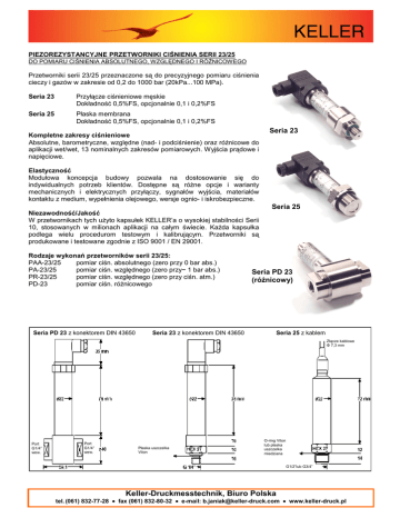PIEZOREZYSTANCYJNE PRZETWORNIKI CIŚNIENIA SERII 23/25 DO POMIARU CIŚNIENIA ABSOLUTNEGO, WZGLĘDNEGO I RÓŻNICOWEGO Przetworniki serii 23/25 przeznaczone są do precyzyjnego pomiaru ciśnienia cieczy i gazów w zakresie od 0,2 do 1000 bar (20kPa...100 MPa). Seria 23 Przyłącze ciśnieniowe męskie Dokładność 0,5%FS, opcjonalnie 0,1 i 0,2%FS Seria 25 Płaska membrana Dokładność 0,5%FS, opcjonalnie 0,1 i 0,2%FS Kompletne zakresy ciśnieniowe Absolutne, barometryczne, względne (nad- i podciśnienie) oraz różnicowe do aplikacji wet/wet, 13 nominalnych zakresów pomiarowych. Wyjścia prądowe i napięciowe. Seria 23 Elastyczność Modułowa koncepcja budowy pozwala na dostosowanie się do indywidualnych potrzeb klientów. Dostępne są różne opcje i warianty mechanicznych i elektrycznych przyłączy, sygnałów wyjścia, materiałów kontaktu z medium, wypełnienia olejowego, wersje ognio- i iskrobezpieczne. Seria 25 Niezawodność/Jakość W przetwornikach tych użyto kapsułek KELLER’a o wysokiej stabilności Serii 10, stosowanych w milionach aplikacji na całym świecie. Każda kapsułka podlega wielu procedurom testowym i kalibrującym. Przetworniki są produkowane i testowane zgodnie z ISO 9001 / EN 29001. Rodzaje wykonań przetworników serii 23/25: PAA-23/25 pomiar ciśn. absolutnego (zero przy 0 bar abs.) PA-23/25 pomiar ciśn. względnego (zero przy~ 1 bar abs.) PR-23/25 pomiar ciśn. względnego (zero przy ciśn. atm.) PD-23 pomiar ciśn. różnicowego Seria PD 23 z konektorem DIN 43650 Seria PD 23 (różnicowy) Seria 23 z konektorem DIN 43650 Seria 25 z kablem Złącze kablowe Φ 7,3 mm Port G1/4” wew. Port G1/4” wew. Płaska uszczelka Viton O-ring Viton lub płaska uszczelka miedziana G1/2”lub G3/4” Keller-Druckmesstechnik, Biuro Polska tel. (061) 832-77-28 • fax (061) 832-80-32 • e-mail: [email protected] • www.keller-druck.pl DANE TECHNICZNE SERIA 23/25 Zakres pomiarowy (FS) w [bar]-inne na życzenie PR-23/25 -1 -0,5 -0,2 0,2 0,5 1 2 5 10 20 PD-23 0,2 0,5 1 2 5 10 20 PAA-23/25 0,2 0,5 1 2 5 10 20 1 2 5 10 20 50 100 200 400 600 1000 100 200 300 600 900 1100 PA-23/25 Przeciążenie -1 -1 -1 Przeciążenie dla PD 2,5 2,5 3 4 10 20 40 1 1 2 3 7 15 25 Dop. ciśn. Statyczne maksymalnie 200 bar dla PD PR - względne (zero przy ciśn. atm.) ; PAA - absolutne (zero przy 0 bar); PA - względne (zero przy ∼1 bar w dniu kalibracji) Liniowość (1) + Histereza + Powtarzalność Magazynowanie / temperatura pracy Zakres kompensacji temperatury Współczynniki temperaturowe - zakres > 1 bar - zakres 1 bar - zakres 0,5 bar - zakres 0,2 bar Stabilność - zakres > 2 bar - zakres ≤ 2 bar (1) ±0,2% zakresu, max ±0,5% -40..100 °C -10..80 °C zera, w %FS/ºC czułości w %FS/ºC 0,005 typ. 0,01 max 0,02 max 0,010 typ. 0,02 max 0,02 max 0,015 typ. 0,03 max 0,02 max 0,025 typ. 0,05 max 0,02 max 0,1 FS% typowo 1 mbar typowo Wyjście analogowe best straight line thru zero 0,2 FS%max 2 mbar max 4...20 mA 0...20 mA 0...10 VDC 8...30 VDC 10...28 VDC 13...28 VDC Rezystancja wejścia (U-10V) / 0,02A (U-5V ) / 0,02A > 5kΩ Konfiguracja 2-przewodowy Zasilanie Przyłącze elektryczne 3-przewodowy Zmiana objętości martwej Przyłącze pomiarowe Rodzaj materiału Stopień ochrony Waga Izolacja Wytrzymałość Odpowiedź impulsowa złącze DIN 43650, ochrona IP65 kabel (z tubą odniesienia do atmosfery), ochrona IP68 < 0,1 mm3 patrz rysunek stal nierdzewna typ 316L (DIN 1.4435), Viton IP65 PR/PA/PAA: ≈ 180g; PD: ≈ 440g > 100MΩ / 50V 10 milionów cykli 0...100%FS w 25ºC 1kHz ( opcjonalnie 5kHz) OPCJONALNIE: Przyłącze pomiarowe, wyjście elektryczne Zakres pomiarowy Liniowość Rodzaj materiału Wypełnienie olejowe Trudne środowiska Stopień ochrony Dopuszczalne ciśnienie statyczne na życzenie, wiele możliwości dowolny zakres pomiędzy 0,2 - 1000 bar, różne jednostki ± 0,1 i ± 0,2%FS lub według życzeń klienta Hastelloy C, monel, platyna, nikiel, tantal, złoto-platyna olej fluoryzowany (O2 - zgodny), oliwa, olej do niskich temperatur wykonanie iskrobezpieczne i ognioodporne IP67 do 600 bar (tylko PD) Przetwornik 3-przew. 0...10V 2-przew. 3-przew. Złącze DIN 43650 Amphenol C91A Kabel 2-przew. 4...20mA - - 0V /GND 1 1 biały +OUT OUT 2 1 czerwony +Vcc +Vcc 3 3 czarny Rez. wej + + + GND 13 ... 28 V S Y G N A Ł GND 10 ... 30 V Zasilanie Keller-Druckmesstechnik, Biuro Polska tel. (061) 832-77-28 • fax (061) 832-80-32 • e-mail: [email protected] • www.keller-druck.pl