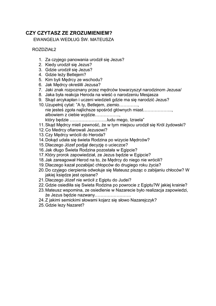 CZY CZYTASZ ZE ZROZUMIENIEM? EWANGELIA WEDŁUG ŚW. MATEUSZA ROZDZIAŁ2 1. Za czyjego panowania urodził się Jezus? 2. Kiedy urodził się Jezus? 3. Gdzie urodził się Jezus? 4. Gdzie leży Betlejem? 5. Kim byli Mędrcy ze wschodu? 6. Jak Mędrcy określili Jezusa? 7. Jaki znak rozpoznany przez mędrców towarzyszył narodzinom Jezusa/ 8. Jaka była reakcja Heroda na wieść o narodzeniu Mesjasza 9. Skąd arcykapłan i uczeni wiedzieli gdzie ma się narodzić Jezus? 10. Uzupełnij cytat: ”A ty, Betlejem, ziemio…………., nie jesteś zgoła najlichsze spośród głównych miast……………….., albowiem z ciebie wyjdzie…………….., który będzie ……………………..ludu mego, Izraela” 11. Skąd Mędrcy mieli pewność, że w tym miejscu urodził się Król żydowski? 12. Co Medrcy ofiarowali Jezusowi? 13. Czy Mędrcy wrócili do Heroda? 14. Dokąd udała się świeta Rodzina po wizycie Mędrców? 15. Dlaczego Józef podjął decyzję o ucieczce? 16. Jak długo Świeta Rodzina pozostała w Egipcie? 17. Który prorok zapowiedział, ze Jezus będzie w Egipcie? 18. Jak zareagował Herod na to, że Mędrcy do niego nie wrócili? 19. Dlaczego kazał pozabijać chłopców do drugiego roku życia? 20. Do czyjego cierpienia odwołuje się Mateusz pisząc o zabijaniu chłoców? W jakiej księdze jest opisane? 21. Dlaczego Józef nie wrócił z Egiptu do Judei? 22. Gdzie osiedliła się Swieta Rodzina po powrocie z Egiptu?W jakiej krainie? 23. Mateusz wspomina, ze osiedlenie w Nazarecie było realizacja zapowiedzi, że Jezus będzie nazwany……………………. 24. Z jakimi semickimi słowami kojarz się słowo Nazarejczyk? 25. Gdzie lezy Nazaret? KLUCZ DO ODPOWIEDZI 1. Króla Heroda 2. Było to na pewno przed czwartym rokiem przed naszą erą, gdyż w tym roku przed Świętem Paschy umarł Herod. 3. W Betlejem, w Judei 4. Betlejem leży 8 km na południe od Jerozolimy. Było miejscem urodzenia króla Dawida 5. Mędrcy" (dosł.: magowie) należeli do stanu kapłańskiego. Z powodu swej tajemnej wiedzy byli w wysokim poważaniu na Wschodzie. 6. Nowonarodzony król zydowski 7. Gwiazda.. Ewangelia ma na myśli nadzwyczajne jakieś zjawisko (por. Mt 2,9), dlatego daremne są wszystkie próby naturalnego wytłumaczenia. 8. Skoro to usłyszał król Herod, przeraził się, a z nim cała Jerozolima. 9. Z prorpctwa proroka Micheasza 10. A ty, Betlejem, ziemio Judy, nie jesteś zgoła najlichsze spośród głównych miast Judy, albowiem z ciebie wyjdzie władca, który będzie pasterzem ludu mego, Izraela 11. Ponieważ prowadziła ich gwiazda 12. złoto, kadzidło i mirrę 13. Nie. A otrzymawszy we śnie nakaz, żeby nie wracali do Heroda, inną drogą udali się do swojej ojczyzny 14. Do Egiptu 15. Gdy oni odjechali, oto anioł Pański ukazał się Józefowi we śnie i rzekł: «Wstań, weź Dziecię i Jego Matkę i uchodź do Egiptu; pozostań tam, aż ci powiem; bo Herod będzie szukał Dziecięcia, aby Je zgładzić». 16. Do śmierci Heroda 17. Ozeasz 18. Wtedy Herod widząc, że go Mędrcy zawiedli, wpadł w straszny gniew. Posłał [oprawców] do Betlejem i całej okolicy i kazał pozabijać wszystkich chłopców w wieku do lat dwóch. 19. Kazał pozabijać wszystkich chłopców w wieku do lat dwóch, stosownie do czasu, o którym się dowiedział od Mędrców. 20. Racheli. Mt stosuje skargę, którą prorok Jeremiasz wkłada w usta Racheli, "matki Izraela", płaczącej nad uciskiem Izraela w niewoli 21. W Judei panował Archelaos w miejsce swojego ojca Heroda i Józef się bał. 22. W Nazarecie . w Galilei 23. Nazarejczykiem.. 24. "Nazarejczyk" - Mt ma tu prawdopodobnie na myśli Iz 11,1, gdzie występuje wyraz "odrośl" (neser) lub "Księcia" (nazir) z Rdz 49,26; Pwt 33,16 lub też "Ocalałego" (nasur) z Iz 49,6; por. Za 9,9; i zachowała się w świecie semickim. 25. Nazaret - położone na południowym zboczu góry Dżebel es-Sich.