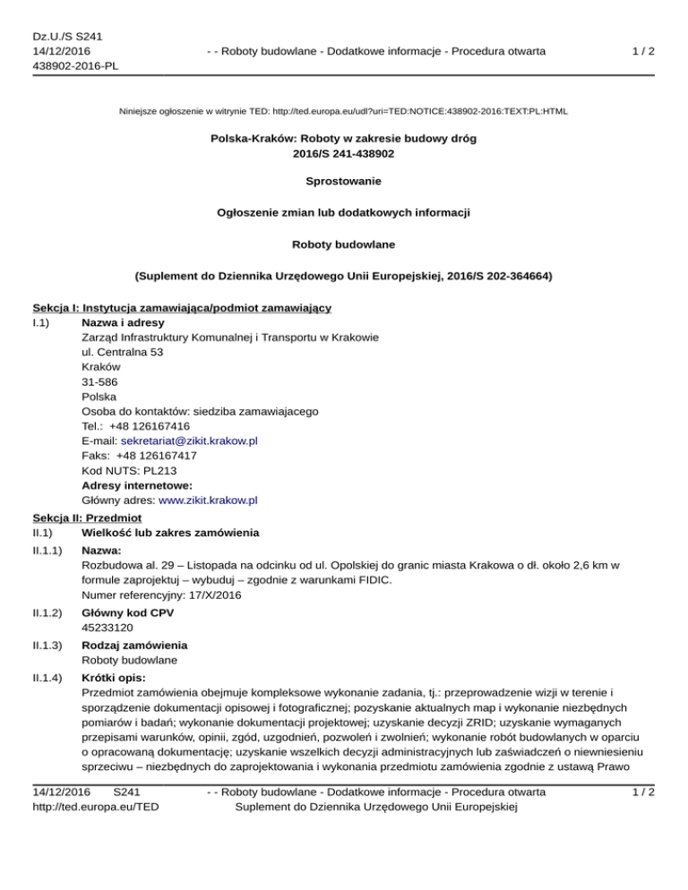 Dz.U./S S241 14/12/2016 438902-2016-PL - - Roboty budowlane - Dodatkowe informacje - Procedura otwarta 1/2 Niniejsze ogłoszenie w witrynie TED: http://ted.europa.eu/udl?uri=TED:NOTICE:438902-2016:TEXT:PL:HTML Polska-Kraków: Roboty w zakresie budowy dróg 2016/S 241-438902 Sprostowanie Ogłoszenie zmian lub dodatkowych informacji Roboty budowlane (Suplement do Dziennika Urzędowego Unii Europejskiej, 2016/S 202-364664) Sekcja I: Instytucja zamawiająca/podmiot zamawiający I.1) Nazwa i adresy Zarząd Infrastruktury Komunalnej i Transportu w Krakowie ul. Centralna 53 Kraków 31-586 Polska Osoba do kontaktów: siedziba zamawiajacego Tel.: +48 126167416 E-mail: [email protected] Faks: +48 126167417 Kod NUTS: PL213 Adresy internetowe: Główny adres: www.zikit.krakow.pl Sekcja II: Przedmiot II.1) Wielkość lub zakres zamówienia II.1.1) Nazwa: Rozbudowa al. 29 – Listopada na odcinku od ul. Opolskiej do granic miasta Krakowa o dł. około 2,6 km w formule zaprojektuj – wybuduj – zgodnie z warunkami FIDIC. Numer referencyjny: 17/X/2016 II.1.2) Główny kod CPV 45233120 II.1.3) Rodzaj zamówienia Roboty budowlane II.1.4) Krótki opis: Przedmiot zamówienia obejmuje kompleksowe wykonanie zadania, tj.: przeprowadzenie wizji w terenie i sporządzenie dokumentacji opisowej i fotograficznej; pozyskanie aktualnych map i wykonanie niezbędnych pomiarów i badań; wykonanie dokumentacji projektowej; uzyskanie decyzji ZRID; uzyskanie wymaganych przepisami warunków, opinii, zgód, uzgodnień, pozwoleń i zwolnień; wykonanie robót budowlanych w oparciu o opracowaną dokumentację; uzyskanie wszelkich decyzji administracyjnych lub zaświadczeń o niewniesieniu sprzeciwu – niezbędnych do zaprojektowania i wykonania przedmiotu zamówienia zgodnie z ustawą Prawo 14/12/2016 S241 http://ted.europa.eu/TED - - Roboty budowlane - Dodatkowe informacje - Procedura otwarta Suplement do Dziennika Urzędowego Unii Europejskiej 1/2 Dz.U./S S241 14/12/2016 438902-2016-PL - - Roboty budowlane - Dodatkowe informacje - Procedura otwarta 2/2 Budowlane; przeprowadzenie prób i badań oraz przygotowanie dokumentów wymaganych dla odbioru i przekazania do użytkowania wykonanych robót. Sekcja VI: Informacje uzupełniające VI.5) Data wysłania niniejszego ogłoszenia: 12/12/2016 VI.6) Numer pierwotnego ogłoszenia Numer ogłoszenia w Dz.Urz. UE – OJ/S: 2016/S 202-364664 Sekcja VII: Zmiany VII.1) Informacje do zmiany lub dodania VII.1.2) Tekst, który należy poprawić w pierwotnym ogłoszeniu Numer sekcji: IV.2.2 Zamiast: Data: 19/12/2016 Czas lokalny: 12:00 Powinno być: Data: 28/12/2016 Czas lokalny: 12:00 Numer sekcji: IV.2.7 Zamiast: Data: 19/12/2016 Czas lokalny: 13:00 Powinno być: Data: 28/12/2016 Czas lokalny: 13:00 VII.2) Inne dodatkowe informacje: 14/12/2016 S241 http://ted.europa.eu/TED - - Roboty budowlane - Dodatkowe informacje - Procedura otwarta Suplement do Dziennika Urzędowego Unii Europejskiej 2/2