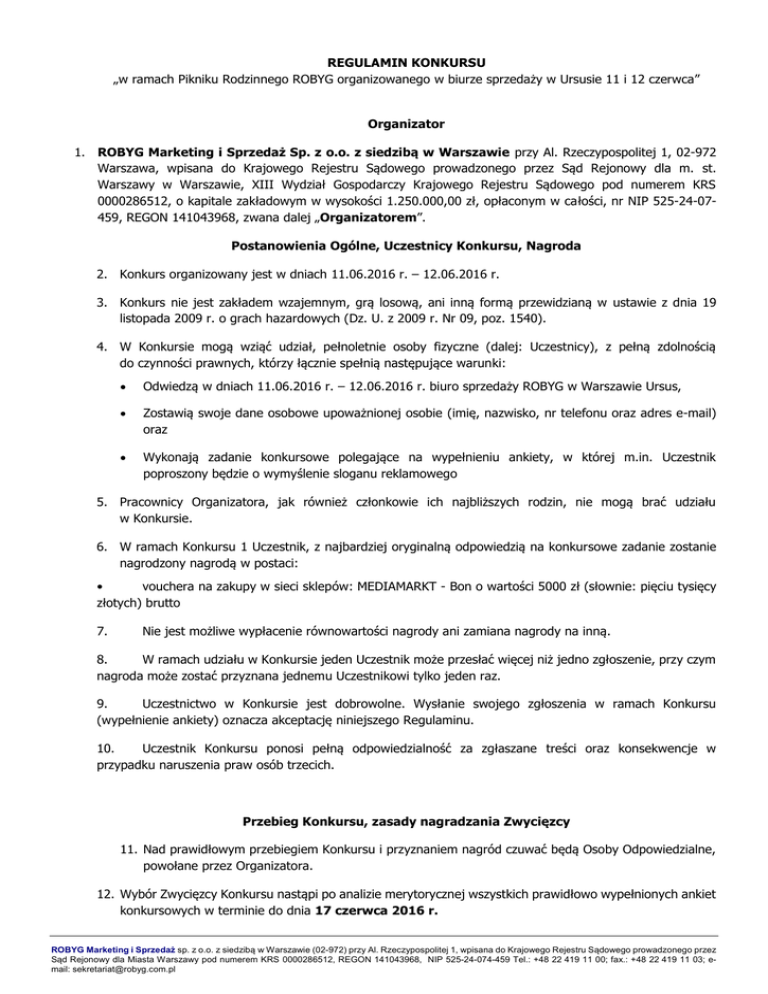 REGULAMIN KONKURSU „w ramach Pikniku Rodzinnego ROBYG organizowanego w biurze sprzedaży w Ursusie 11 i 12 czerwca” Organizator 1. ROBYG Marketing i Sprzedaż Sp. z o.o. z siedzibą w Warszawie przy Al. Rzeczypospolitej 1, 02-972 Warszawa, wpisana do Krajowego Rejestru Sądowego prowadzonego przez Sąd Rejonowy dla m. st. Warszawy w Warszawie, XIII Wydział Gospodarczy Krajowego Rejestru Sądowego pod numerem KRS 0000286512, o kapitale zakładowym w wysokości 1.250.000,00 zł, opłaconym w całości, nr NIP 525-24-07459, REGON 141043968, zwana dalej „Organizatorem”. Postanowienia Ogólne, Uczestnicy Konkursu, Nagroda 2. Konkurs organizowany jest w dniach 11.06.2016 r. – 12.06.2016 r. 3. Konkurs nie jest zakładem wzajemnym, grą losową, ani inną formą przewidzianą w ustawie z dnia 19 listopada 2009 r. o grach hazardowych (Dz. U. z 2009 r. Nr 09, poz. 1540). 4. W Konkursie mogą wziąć udział, pełnoletnie osoby fizyczne (dalej: Uczestnicy), z pełną zdolnością do czynności prawnych, którzy łącznie spełnią następujące warunki: Odwiedzą w dniach 11.06.2016 r. – 12.06.2016 r. biuro sprzedaży ROBYG w Warszawie Ursus, Zostawią swoje dane osobowe upoważnionej osobie (imię, nazwisko, nr telefonu oraz adres e-mail) oraz Wykonają zadanie konkursowe polegające na wypełnieniu ankiety, w której m.in. Uczestnik poproszony będzie o wymyślenie sloganu reklamowego 5. Pracownicy Organizatora, jak również członkowie ich najbliższych rodzin, nie mogą brać udziału w Konkursie. 6. W ramach Konkursu 1 Uczestnik, z najbardziej oryginalną odpowiedzią na konkursowe zadanie zostanie nagrodzony nagrodą w postaci: • vouchera na zakupy w sieci sklepów: MEDIAMARKT - Bon o wartości 5000 zł (słownie: pięciu tysięcy złotych) brutto 7. Nie jest możliwe wypłacenie równowartości nagrody ani zamiana nagrody na inną. 8. W ramach udziału w Konkursie jeden Uczestnik może przesłać więcej niż jedno zgłoszenie, przy czym nagroda może zostać przyznana jednemu Uczestnikowi tylko jeden raz. 9. Uczestnictwo w Konkursie jest dobrowolne. Wysłanie swojego zgłoszenia w ramach Konkursu (wypełnienie ankiety) oznacza akceptację niniejszego Regulaminu. 10. Uczestnik Konkursu ponosi pełną odpowiedzialność za zgłaszane treści oraz konsekwencje w przypadku naruszenia praw osób trzecich. Przebieg Konkursu, zasady nagradzania Zwycięzcy 11. Nad prawidłowym przebiegiem Konkursu i przyznaniem nagród czuwać będą Osoby Odpowiedzialne, powołane przez Organizatora. 12. Wybór Zwycięzcy Konkursu nastąpi po analizie merytorycznej wszystkich prawidłowo wypełnionych ankiet konkursowych w terminie do dnia 17 czerwca 2016 r. ROBYG Marketing i Sprzedaż sp. z o.o. z siedzibą w Warszawie (02-972) przy Al. Rzeczypospolitej 1, wpisana do Krajowego Rejestru Sądowego prowadzonego przez Sąd Rejonowy dla Miasta Warszawy pod numerem KRS 0000286512, REGON 141043968, NIP 525-24-074-459 Tel.: +48 22 419 11 00; fax.: +48 22 419 11 03; email: [email protected] 13. Do oceny nadesłanych zgłoszeń i wyboru zwycięzców wybrana zostanie 3-osobowa Komisja, składająca się z przedstawicieli Organizatora. Wszystkie osoby zasiadające w Komisji będą posiadały niezbędną wiedzę i kompetencje do obiektywnej oceny wypełnionych ankiet. 14. Informacja o wygranej przekazana będzie Zwycięzcy po dokonaniu wyboru przez Komisję w terminie do dnia 24 czerwca 2016 r. drogą telefoniczną oraz mailową. 15. Komisja Konkursowa przy ogłaszaniu wyników nie podaje uzasadnień dla wybranego sloganu, a jej decyzja jest ostateczna i nie przysługuje od niej odwołanie. 16. Organizator Konkursu zastrzega sobie prawo do nie uwzględniania ankiet, które : nie spełniają warunków wymienionych w pkt 4 nin. Regulaminu, zawierają w swojej treści słowa niecenzuralne, już istnieją na rynku polskim, zawierają nazwę już zastrzeżone prawami autorskimi, nie zawierają numeru telefonu, lub wykonanego zadania konkursowego. 17. Uczestnik w zamian za otrzymaną nagrodę zobowiązuje się do przeniesienia całości autorskich praw majątkowych oraz zależnych praw autorskich do hasła o którym mowa w pkt 6 niniejszego Regulaminu na rzecz Organizatora lub osoby wskazanej przez Organizatora, tj. prawa do nieograniczonego rozporządzania i korzystania ze sloganu reklamowego na następujących polach eksploatacji: utrwalanie – w dowolnej formie – w tym graficznie, elektronicznie, innych formach przestrzennych, etc.; zwielokrotnianie przy użyciu wszelkich znanych technik, w tym w szczególności: graficznych, na nośnikach elektronicznych – w tym dyskach przenośnych, dyskietkach, płytach kompaktowych, także CD, video, płytach w formacie DVD, w formie tekstowej, instalacji przestrzennych, itp.; wprowadzenie do pamięci komputera; korzystanie z hasła w sposób zgodny z jego przeznaczeniem,; przesłanie hasła za pomocą sieci Internet i innych sieci, etc. 18. Przeniesienie autorskich praw majątkowych nastąpi bez żadnych ograniczeń w rozporządzaniu oraz korzystaniu, a także z prawem Organizatora do przenoszenia tych praw na inne osoby. Uczestnikowi nie przysługuje odrębne wynagrodzenia za korzystanie z hasła na każdym odrębnym polu eksploatacji. Organizator nie jest jednak zobowiązany do zastosowania zwycięskiego hasła. Przekazanie nagrody 19. Odbiór nagrody, o której mowa w pkt 6 będzie możliwy po zakończeniu Konkursu oraz po podpisaniu protokołu odbioru nagrody w dniach 27 - 30.06.2016 r. w siedzibie spółki ROBYG zlokalizowanej w Warszawie w al. Rzeczypospolitej 1 w godzinach od 10:00 do 17:00 20. W przypadku nie stawienia się zwycięzcy w umówionym miejscu i czasie w nieprzekraczalnym terminie do dnia 30.06.2016 r. do godziny 17:00 lub w inny sposób wyrażenia braku po stronie Zwycięzcy woli odbioru nagrody, Zwycięzca traci prawo do nagrody. Postanowienia dodatkowe 2 21. Organizator zastrzega sobie możliwość odwołania Konkursu w każdym czasie. 22. Organiz