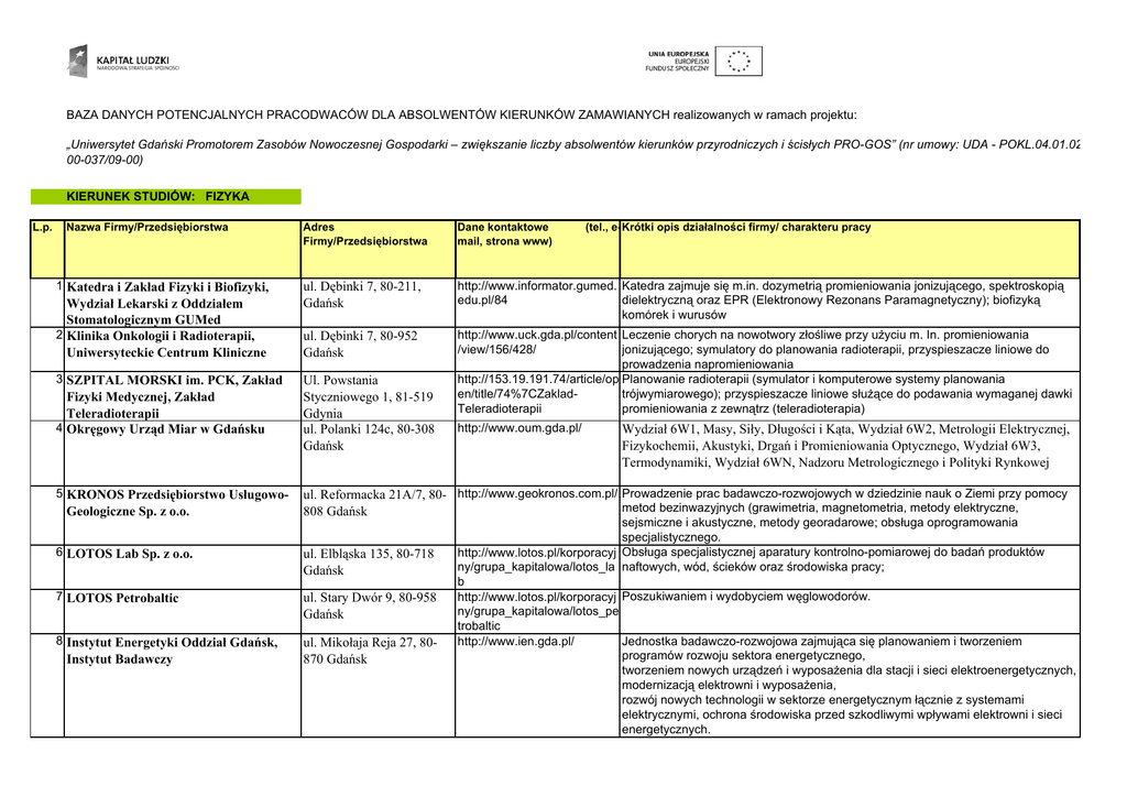 BAZA DANYCH POTENCJALNYCH PRACODWACÓW DLA ABSOLWENTÓW KIERUNKÓW ZAMAWIANYCH realizowanych w ramach projektu: „Uniwersytet Gdański Promotorem Zasobów Nowoczesnej Gospodarki – zwiększanie liczby absolwentów kierunków przyrodniczych i ścisłych PRO-GOS” (nr umowy: UDA - POKL.04.01.02 00-037/09-00) KIERUNEK STUDIÓW: FIZYKA L.p. Nazwa Firmy/Przedsiębiorstwa 1 Katedra i Zakład Fizyki i Biofizyki, Wydział Lekarski z Oddziałem Stomatologicznym GUMed 2 Klinika Onkologii i Radioterapii, Uniwersyteckie Centrum Kliniczne 3 SZPITAL MORSKI im. PCK, Zakład Fizyki Medycznej, Zakład Teleradioterapii 4 Okręgowy Urząd Miar w Gdańsku 5 KRONOS Przedsiębiorstwo Usługowo- Geologiczne Sp. z o.o. Dane kontaktowe mail, strona www) ul. Dębinki 7, 80-211, Gdańsk http://www.informator.gumed. Katedra zajmuje się m.in. dozymetrią promieniowania jonizującego, spektroskopią edu.pl/84 dielektryczną oraz EPR (Elektronowy Rezonans Paramagnetyczny); biofizyką komórek i wurusów ul. Dębinki 7, 80-952 Gdańsk http://www.uck.gda.pl/content Leczenie chorych na nowotwory złośliwe przy użyciu m. In. promieniowania /view/156/428/ jonizującego; symulatory do planowania radioterapii, przyspieszacze liniowe do prowadzenia napromieniowania http://153.19.191.74/article/op Planowanie radioterapii (symulator i komputerowe systemy planowania trójwymiarowego); przyspieszacze liniowe służące do podawania wymaganej dawki en/title/74%7CZakladpromieniowania z zewnątrz (teleradioterapia) Teleradioterapii Ul. Powstania Styczniowego 1, 81-519 Gdynia ul. Polanki 124c, 80-308 Gdańsk http://www.oum.gda.pl/ Wydział 6W1, Masy, Siły, Długości i Kąta, Wydział 6W2, Metrologii Elektrycznej, Fizykochemii, Akustyki, Drgań i Promieniowania Optycznego, Wydział 6W3, Termodynamiki, Wydział 6WN, Nadzoru Metrologicznego i Polityki Rynkowej ul. Reformacka 21A/7, 80- http://www.geokronos.com.pl/ Prowadzenie prac badawczo-rozwojowych w dziedzinie nauk o Ziemi przy pomocy metod bezinwazyjnych (grawimetria, magnetometria, metody elektryczne, 808 Gdańsk 6 LOTOS Lab Sp. z o.o. ul. Elbląska 135, 80-718 Gdańsk 7 LOTOS Petrobaltic ul. Stary Dwór 9, 80-958 Gdańsk 8 Instytut Energetyki Oddział Gdańsk, ul. Mikołaja Reja 27, 80870 Gdańsk Instytut Badawczy (tel., e- Krótki opis działalności firmy/ charakteru pracy Adres Firmy/Przedsiębiorstwa sejsmiczne i akustyczne, metody georadarowe; obsługa oprogramowania specjalistycznego. http://www.lotos.pl/korporacyj Obsługa specjalistycznej aparatury kontrolno-pomiarowej do badań produktów ny/grupa_kapitalowa/lotos_la naftowych, wód, ścieków oraz środowiska pracy; b http://www.lotos.pl/korporacyj Poszukiwaniem i wydobyciem węglowodorów. ny/grupa_kapitalowa/lotos_pe trobaltic http://www.ien.gda.pl/ Jednostka badawczo-rozwojowa zajmująca się planowaniem i tworzeniem programów rozwoju sektora energetycznego, tworzeniem nowych urządzeń i wyposażenia dla stacji i sieci elektroenergetycznych, modernizacją elektrowni i wyposażenia, rozwój nowych technologii w sektorze energetycznym łącznie z systemami elektrycznymi, ochrona środowiska przed szkodliwymi wpływami elektrowni i sieci energetycznych. 9 Instytut Elektrotechniki Oddział w ul. Narwicka 1, 80-557 Gdańsk http://www.iel.gda.pl/?l=pl Instytutu Elektrotechniki prowadzi prace naukowo-badawcze z zakresu elektrotechniki i elektroniki obejmujące takie dziedziny jak energoelektronika, Gdańsku systemy monitoringu i automatyki, aparaty elektryczne, systemy sterowania, urządzenia i narzędzia cyfrowe i informatyczne. 10 Instytut Maszyn Przepływowych PAN http://www.imp.gda.pl/ Instytut prowadzi badania podstawowe w dziedzinie podstaw działania, ul. Fiszera 14, 80-952 projektowania i budowy maszyn służących do konwersji energii w przepływach; Gdańsk mechanika płynów, przepływy wielofazowe, termodynamika i wymiana ciepła, fizyka plazmy, technika laserowa, mechanika maszyn, tribologia i diagnostyka maszyn energetycznych. 11 Instytut Oceanologii Polskiej Akademii Ul. Powstańców Warszawy http://www.iopan.gda.pl/index- Prowadzenie badań podstawowych środowiska morskiego oraz pogłębiania wiedzy pl.html na temat zjawisk i procesów w nim zachodzących. Nauk 55, 81-712 Sopot 12 Instytut Morski w Gdańsku Ul. Długi Targ 41/42, 80830 Gdańsk http://www.im.gda.pl/ 13 Centrum Techniki Okrętowej S.A. - ul. Aleja Rzeczypospolitej http://www.cto.gda.pl/index.p Instytut pobudza i wspiera innowacyjność przemysłu morskiego działalnością hp?id=historia badawczo-rozwojową, projektową i informacyjną. W swej strukturze posiada 8, 80-369 Gdańsk Zakład Badawczo - Rozwojowy 14 Ośrodek Badawczo-Rozwojowy, Centrum Techniki Morskiej S.A. 15 Państwowy Instytut Geologiczny, Oddział Geologii Morza 16 Instytut Problemów Jądrowych Jednostka naukowo-badawcza, wykonuje prace naukowo-badawcze i wdrożeniowe, opracowuje studia i ekspertyzy oraz udziela konsultacji i doradztwa w zakresie: gospodarki transportowej, ekonomiki i prawa morskiego, modernizacji i eksploatacji portów, hydrotechniki morskiej, geotechniki, oceanografii operacyjnej, monitoringu Południowego Bałtyku i zapobiegania zagrożeniom gospodarki wodnej i inżynierii morskiej, ochrony i kształtowania środowiska ekologii morza, zagospodarowania regionu nadmorskiego, tworzenia baz danych i monitoringu zjawisk ciągłych, nowych technologii i gospodarki elektronicznej. Ośrodek Hydromechaniki Okrętu, Ośrodek Mechaniki Konstrukcji, Zespół Laboratoriów Badań Środowiskowych, Zakład Projektowo-Technologiczny. ul. Dickmana 62, 81-109 Gdynia http://www.ctm.gdynia.pl/ Wykrywanie zagrożeń nawodnych i podwodnych, przeciwdziałania oraz wdrażania systemu transmisji danych jawnych i niejawnych. ul. Kościerska 5, 80-328 Gdańsk http://www.pgi.gda.pl/ Instytut prowadzi wszechstronne badania budowy geologicznej kraju, których celem jest praktyczne wykorzystanie zgromadzonej wiedzy w gospodarce narodowej i ochronie środowiska. Specjalistyczn