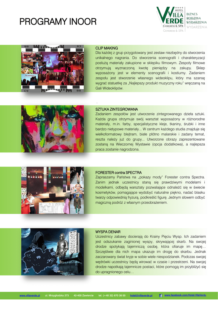 PROGRAMY WIECZORNE PROGRAMY INOOR CLIP MAKING Dla każdej z grup przygotowany jest zestaw niezbędny do stworzenia unikalnego nagrania. Do stworzenia scenografii i charakteryzacji posłużą materiały zakupione w sklepiku filmowym. Zespoły filmowe otrzymują wyznaczoną kwotę pieniędzy na zakupy. Sklep wyposażony jest w elementy scenografii i kostiumy. Zadaniem zespołu jest stworzenie własnego wideoklipu, który ma szansę wygrać statuetkę za „Najlepszy produkt muzyczny roku” wręczaną na Gali Wideoklipów. . SZTUKA ZINTEGROWANA Zadaniem zespołów jest utworzenie zintegrowanego dzieła sztuki. Każda grupa otrzymuje swój warsztat wyposażony w różnorodne materiały, m.in. farby, specjalistyczne kleje, tkaniny, śrubki i inne bardzo nietypowe materiały... W centrum każdego studia znajduje się wielkoformatowy blejtram, białe płótno malarskie i zadany temat, reszta należy już do grupy... Utworzone obrazy zaprezentowane zostaną na Wieczornej Wystawie (opcja dodatkowa), a najlepsza praca zostanie nagrodzona. FORESTER contra SPECTRA Zapraszamy Państwa na „pokazy mody” Forester contra Spectra. Zanim jednak uczestnicy staną się prawdziwymi modelami i modelkami, odbędą warsztaty pozwalające odnaleźć się w świecie kosmetyków, pomagające wydobyć naturalne piękno, nadać blasku twarzy odpowiednią fryzurą, podkreślić figurę. Jednym słowem odbyć magiczną podróż z własnym przeobrażeniem. WYSPA DENAR Uczestnicy zabawy docierają do Krainy Pięciu Wysp. Ich zadaniem jest odszukanie zaginionej wyspy, skrywającej skarb. Na swojej drodze spotykają tajemniczą osobę, która ofiaruje im mapę… Szczęśliwie dla nich mapa ukazuje im drogę do skarbu. Jednak zaczarowany świat kryje w sobie wiele niespodzianek. Podczas swojej wędrówki uczestnicy będą wirować w czasie i przestrzeni. Na swojej drodze napotkają tajemnicze postaci, które pomogą im przybliżyć się do upragnionego celu… www.villaverde.pl ul. Mrzygłodzka 273 42-400 Zawiercie tel. (+48 32) 670 38 00 [email protected] www.facebook.com/Hotel.VllaVerde PROGRAMY WIECZORNE PROGRAMY INOOR AKADEMIA INTEGRACJI INDOOR Program ten łączy w sobie lekkie, zadania połączone z dużą dawką zdrowego śmiechu. Uczestnicy, podzieleni na zespoły, zmierzą się z zadaniami umieszczonymi na poszczególnych punktach. Konkurencje ułożone są tak, aby na każdym punkcie dwie drużyny rywalizowały ze sobą o zwycięstwo. Po przejściu wszystkich drużyn przez każdy z punktów, nastąpi podsumowanie i ogłoszenie wyników. Zwycięskie drużyny otrzymają puchary i udekorowane zostaną medalami! AKADEMIA FAIR PLAY Scenariusz tego programu ułożony jest w oparciu o różnego rodzaju gry. Grupa, podzielona na drużyny rozgrywa turniej, a wygrana należy do zespołu, który na poszczególnych stanowiskach zdobędzie najwięcej punktów. Program cechuje się jasnymi zasadami gry, współpracą w grupie i przede wszystkim dobrą zabawą! TEAM CHEF Integracja przez gotowanie!...Ale dlaczego nie jest to zwykłe wspólne gotowanie? Ponieważ scenariusz imprezy przebiega według ściśle określonych zasad. Przed przystąpieniem do pracy, zespoły muszą opracować strategię działania i odpowiednio przydzielić role każdemu z uczestników. Wygrywa najbardziej zgrany zespół! TEAM VEHICLE Program inspirowany niezwykłymi pojazdami. Nieograniczone możliwości projektowania i konstruowania. Zanim rozpocznie się walka o najlepszy pojazd, poddamy drużyny specjalistycznym testom. Jeśli wykażą się umiejętnościami i wiedzą, otrzymają w pełni wyposażony warsztat konstruktorski. www.villaverde.pl ul. Mrzygłodzka 273 42-400 Zawiercie tel. (+48 32) 670 38 00 [email protected] www.facebook.com/Hotel.VllaVerde PROGRAMY WIECZORNE PROGRAMY INOOR MAFIA (program dla małych grup – do 20 os.) Doprawdy trudno opisać grę "w mafię". Ale bardzo łatwo napisać, iż jest ona kapitalną rozrywką dla mniejszych grup (do 20 osób). Nie ma dwóch identycznych rozgrywek! I nigdy nie będzie. Dlaczego? Bo żadnej rozgrywki nie da się przewidzieć. Całkowita nieliniowość wynika z różnych zachowań samych graczy, których zadaniem jest... kłamać, naginać, przeinaczać, a przede wszystkim – morderczo kombinować, aby nie zostać wyeliminowanym! PODWODNA INTEGRACJA (program dla małych grup – do 20 os.) Zapraszamy do unikatowego podwodnego programu integracyjnego. Zapoznamy Uczestników ze sprzętem do nurkowania, przedstawimy podstawowe zasady dotyczące używania sprzętu oraz zachowania i komunikowania się pod wodą. Będzie to wstępem do prawdziwej zabawy. Liczne zadania specjalne wykonywane pod wodą, to idealna próba współpracy oraz integracja wszystkich Uczestników zabawy. Organizacja zabaw na basenach umożliwia wzięcie udziału w integracji także osobom nie umiejącym pływać. www.villaverde.pl ul. Mrzygłodzka 273 42-400 Zawiercie tel. (+48 32) 670 38 00 [email protected] www.facebook.com/Hotel.VllaVerde