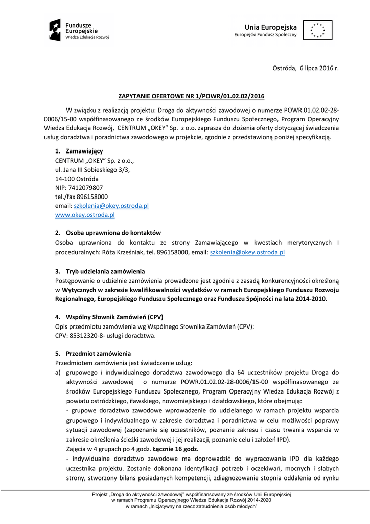 Ostróda, 6 lipca 2016 r. ZAPYTANIE OFERTOWE NR 1/POWR/01.02.02/2016 W związku z realizacją projektu: Droga do aktywności zawodowej o numerze POWR.01.02.02-280006/15-00 współfinasowanego ze środków Europejskiego Funduszu Społecznego, Program Operacyjny Wiedza Edukacja Rozwój, CENTRUM „OKEY” Sp. z o.o. zaprasza do złożenia oferty dotyczącej świadczenia usług doradztwa i poradnictwa zawodowego w projekcie, zgodnie z przedstawioną poniżej specyfikacją. 1. Zamawiający CENTRUM „OKEY” Sp. z o.o., ul. Jana III Sobieskiego 3/3, 14-100 Ostróda NIP: 7412079807 tel./fax 896158000 email: [email protected] www.okey.ostroda.pl 2. Osoba uprawniona do kontaktów Osoba uprawniona do kontaktu ze strony Zamawiającego w kwestiach merytorycznych I proceduralnych: Róża Krześniak, tel. 896158000, email: [email protected] 3. Tryb udzielania zamówienia Postępowanie o udzielnie zamówienia prowadzone jest zgodnie z zasadą konkurencyjności określoną w Wytycznych w zakresie kwalifikowalności wydatków w ramach Europejskiego Funduszu Rozwoju Regionalnego, Europejskiego Funduszu Społecznego oraz Funduszu Spójności na lata 2014-2010. 4. Wspólny Słownik Zamówień (CPV) Opis przedmiotu zamówienia wg Wspólnego Słownika Zamówień (CPV): CPV: 85312320-8- usługi doradztwa. 5. Przedmiot zamówienia Przedmiotem zamówienia jest świadczenie usług: a) grupowego i indywidualnego doradztwa zawodowego dla 64 uczestników projektu Droga do aktywności zawodowej o numerze POWR.01.02.02-28-0006/15-00 współfinasowanego ze środków Europejskiego Funduszu Społecznego, Program Operacyjny Wiedza Edukacja Rozwój z powiatu ostródzkiego, iławskiego, nowomiejskiego i działdowskiego, które obejmują: - grupowe doradztwo zawodowe wprowadzenie do udzielanego w ramach projektu wsparcia grupowego i indywidualnego w zakresie doradztwa i poradnictwa w celu możliwości poprawy sytuacji zawodowej (zapoznanie się uczestników, poznanie zakresu i czasu trwania wsparcia w zakresie określenia ścieżki zawodowej i jej realizacji, poznanie celu i założeń IPD). Zajęcia w 4 grupach po 4 godz. Łącznie 16 godz. - indywidualne doradztwo zawodowe ma doprowadzić do wypracowania IPD dla każdego uczestnika projektu. Zostanie dokonana identyfikacji potrzeb i oczekiwań, mocnych i słabych strony, stworzony bilans posiadanych kompetencji, zdiagnozowanie stopnia oddalenia od rynku Projekt „Droga do aktywności zawodowej” współfinansowany ze środków Unii Europejskiej w ramach Programu Operacyjnego Wiedza Edukacja Rozwój 2014-2020 w ramach „Inicjatywny na rzecz zatrudnienia osób młodych” pracy, wyznaczone cele zawodowe i kierunki działań do podjęcia aktywizacji zawodowej, określony zostanie rodzaj wsparcia dla uczestników. Zajęcia indywidualne 3 spotkania x 2 godz./os. Łącznie 384 godz. b) grupowego poradnictwa zawodowego dla 64 uczestników projektu Droga do aktywności zawodowej o numerze POWR.01.02.02-28-0006/15-00 współfinasowanego ze środków Europejskiego Funduszu Społecznego, Program Operacyjny Wiedza Edukacja Rozwój z powiatu ostródzkiego, iławskiego, nowomiejskiego i działdowskiego, które obejmuje: - poradnictwo grupowe polegać ma na stymulowaniu uczestnika w działania zmierzające do uzyskania przyjętych celów w ścieżce rozwoju zawodowego, zmotywuje uczestnika do działania, zainspiruje do osiągnięcia celów zawodowych, umiejętności funkcjonowania na otwartym rynku pracy, wzmocni samoocenę, doprowadzi do podejmowania działań poszukiwania pracy tj. rozmowy kwalifikacyjne, dokumenty aplikacyjne, udzielane wsparcie pobudzi do samodzielnego działania i poszukiwania pracy, ukształtuje aktywną postawę i nawyk podejmowania inicjatyw do aktywności i realizacji celów zawodowych. Zajęcia w 4 grupach po 4 godz. przez 4 dni. Łącznie 64 godz. c) indywidualnego poradnictwa zawodowego dla 56 uczestników (53 osoby bierne zawodowo, 3 osoby długotrwale bezrobotne) projektu Droga do aktywności zawodowej o numerze POWR.01.02.02-28-0006/15-00 współfinasowanego ze środków Europejskiego Funduszu Społecznego, Program Operacyjny Wiedza Edukacja Rozwój z powiatu ostródzkiego, iławskiego, nowomiejskiego i działdowskiego, które obejmuje: - Poradnictwo indywidualne polegać ma na zindywidualizowanym stymulowaniu uczestnika w działaniach zmierzających do uzyskania przyjętych celów w ścieżce rozwoju zawodowego. Zajęcia indywidualne 2 godz./miesiąc w ciągu 4 miesięcy. Łącznie 448 godz. Uczestnikami wsparcia są 64 osoby (42 kobiet, 22 mężczyzn) w wieku 15- 29 lat bez pracy, które nie uczestniczą w szkoleniu i kształceniu – MŁODZIEŻ NEET, zamieszkujących powiat ostródzki lub nowomiejski lub iławski lub działdowski w tym znajdą się osoby: - 53 osoby bierne zawodowo ( 34 kobiety, 19 mężczyzn), - 11 osób bezrobotnych (8 kobiet,3 mężczyzn) w tym 9 osób długotrwale bezrobotnych 6. Zamówienia uzupełniające Istnieje możliwość udzielenia Wykonawcy wyłonionemu w trybie zasady konkurencyjności zamówień publicznych uzupełniających, w wysokości nieprzekraczającej 50% wartości zamówienia publicznego określonej w umowie zawartej z Wykonawcą, o ile te zamówienia publiczne są zgodne z przedmiotem zamówienia publicznego podstawowego oraz możliwość udzielenia takiego zamówienia publicznego została przewidziana w zapytaniu ofertowym oraz w umowie z Wykonawcą. W takim przypadku nie jest konieczne ponowne stosowanie zasady konkurencyjności. 7. Termin i miejsce realizacji zamówienia Zajęcia realizowane będą w terminach: a) grupowe doradztwo zawodowe – lipiec – sierpień 2016 r. – 16 godz. b) indywidualne doradztwo zawodowe – lipiec – sierpień 2016 r.- 384 godz. (64os.x6godz.) c) grupowego poradnictwa zawodowego – wrzesień 2016 r. – 64 godz. Projekt „Droga do aktywności zawodowej” współfinansowany ze środków Unii Europejskiej w ramach Programu Operacyjnego Wiedza Edukacja Rozwój 2014-2020 