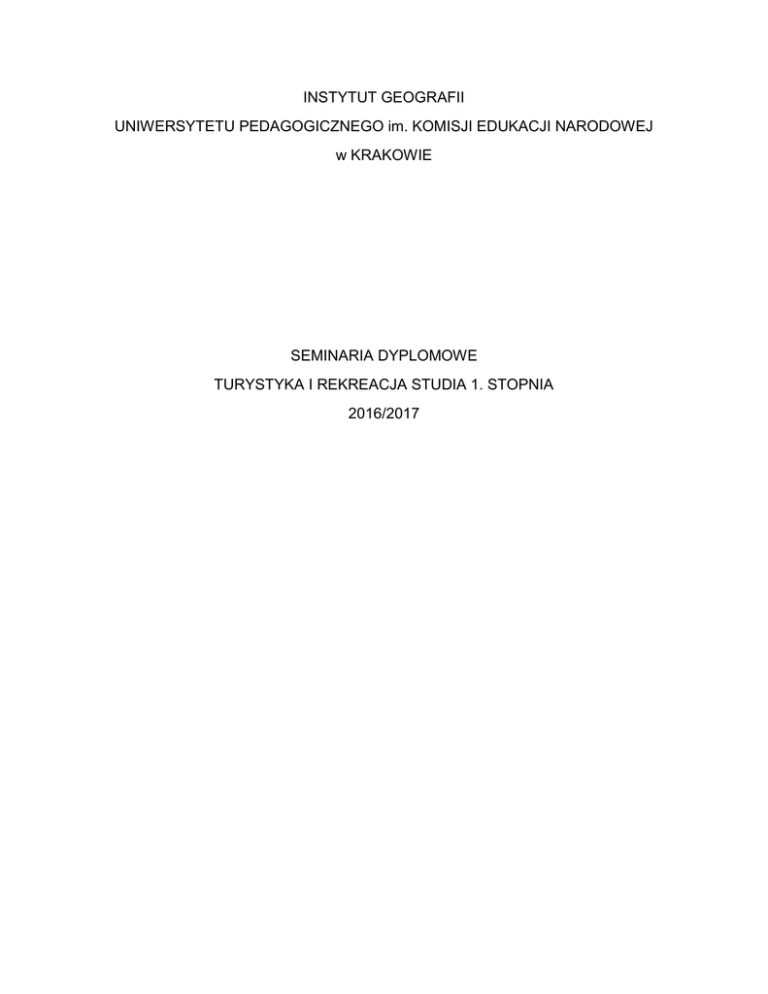 INSTYTUT GEOGRAFII UNIWERSYTETU PEDAGOGICZNEGO im. KOMISJI EDUKACJI NARODOWEJ w KRAKOWIE SEMINARIA DYPLOMOWE TURYSTYKA I REKREACJA STUDIA 1. STOPNIA 2016/2017 Prof. dr hab. Zbigniew Długosz Organizacja seminarium W IV semestrze – pracujemy nad koncepcją i metodologią pracy, definiujemy temat pracy, tworzymy plan pracy i zapoznajemy z literaturą dotyczącą problematyki pracy. Warunkiem zaliczenia jest uczestnictwo w seminariach i sporządzenie szczegółowego konspektu pracy. Okres wakacyjny wykorzystujemy na bliższe poznanie terenu, studiowanie literatury i wykonanie dokumentacji fotograficznej miejsc i obiektów opisywanych w pracy oraz zbieranie wiadomości w terenie. Semestr V i VI to na początku zaprezentowanie dokonań wakacyjnych, a następnie odbywa się pisanie poszczególnych rozdziałów i ich referowanie. Warunkiem zaliczenia V semestru jest wykazanie się postępami w pisaniu pracy, natomiast warunkiem zaliczenia VI – ostatniego semestru jest złożenie gotowej i przyjętej pracy. Problematyka prac Problematyka prac licencjackich w dużym zakresie ma charakter kompilacyjny. Obejmuje ona zagadnienia w ujęciu przekrojowym (specyfiki rodzaju turystyki) lub regionalnym. Dotyczy charakterystyki bądź oceny walorów przyrodniczych lub pozaprzyrodniczych, a także zagospodarowania turystycznego wybranych obszarów w określonych granicach na obszarze Polski lub innego kraju. Wskazane jest (chociaż nie jest to warunek konieczny) aby wybrany do analizy w pracy teren był znany z autopsji. Przedmiotem analizy w Polsce może być miasto lub dzielnica dużego miasta, gmina(y), powiat, województwo, a spoza Polski także region historyczny bądź administracyjny danego kraju. Dopuszczalne są propozycje oryginalnych zaproponowanych tematów ale realnych w realizacji. Dr hab., prof UP Józef Kukulak Organizacja seminarium Seminarium trwa 1,5 roku akademickiego. Pierwszy semestr jest poświęcony omówieniu struktury i tematyki pracy dyplomowej, przeglądu źródeł informacji tematycznych, uzgodnienia tematu pracy i ułożenia spisu jej treści. Planowany jest również przegląd i dobór metod badawczych dla podjętych tematów prac. W semestrze drugim studenci prezentują zebrany materiał tematyczny, gromadzą literaturę do poszczególnych rozdziałów pracy i piszą na ich podstawie rozdział wstępny. Ostatni semestr jest opracowaniem tekstowym i graficznym realizowanego tematu i prezentacją tego opracowania. Przy realizacji tematu student powinien wykazać się umiejętnością gromadzenia i selekcji informacji z literatury, ich poprawną interpretacją i kompilacją tematyczną. W każdej pracy, oprócz treści z literatury, powinien znajdować się wkład autorskich dokonań przy realizacji tematu (np. wyniki ankiet, obserwacje terenowe, rozwiązania graficzne). Tematyka prac dyplomowych: Tematyka prac dyplomowych koncentruje się wokół wybranych zagadnień z zakresu turystyki. Preferuje się wybór tematów dotyczących turystyki lokalnej, głównie z terenów już znanych seminarzystom. Wtenczas jest większa szansa na zebranie materiałów autorskich, bardziej szczegółowych i dotąd nie publikowanych. Dobór tematu pracy jest ustalany oddzielnie z każdym z seminarzystów wedle ich zainteresowań turystycznych i możliwości realizacji tematu. Dr hab., prof. UP Sławomir Kurek Organizacja seminarium: Semestr 4 - wybór tematu pracy - dobór i przegląd literatury i źródeł - opracowanie planu pracy, celu i metod, które będą wykorzystane w pracy) - złożenie jednego rozdziału pracy (teoretycznego, wstępnego) Zaliczenie na podstawie złożonego rozdziału i planu pracy Semestr 5 - opracowanie rozdziału analitycznego (głównego, empirycznego) w pracy - omawianie formy pisania pracy (struktura, wymogi edytorskie, notki bibliograficzne) Zaliczenie na podstawie oddanego rozdziału analitycznego Semestr 6 - proces pisania pozostałych rozdziałów pracy - opracowanie form graficznych (wykresy, mapy) - złożenie całości pracy Zaliczenie na podstawie złożonej i przyjętej do obrony pracy Zakres tematyczny prac dyplomowych: 1. Potencjał turystyczny wybranych regionów Polski, Europy i świata. 2. Rozwój wybranych form turystyki (np. turystyka eventowa, winiarska, rowerowa, wodna, kolejowa, kulinarna, kulturowa itp.) 3. Zróżnicowanie zagospodarowania turystycznego wybranych regionów Polski, Europy i świata. 4. Natężenie, kierunki i zmiany w wielkości ruchu turystycznego wybranych regionów Polski, Europy i świata. 5. Przyrodnicze, ekonomiczne i kulturowe uwarunkowania rozwoju turystyki wybranych regionów Polski, Europy i świata. Dr hab. Danuta Piróg, prof. UP Zainteresowania naukowe D.Piróg koncentrują głównie na zagadnieniach dotyczących: szeroko pojętego funkcjonowania człowieka na rynku pracy w zmieniających się warunkach, ze szczególnym uwzględnieniem procesu wkraczania absolwentów szkół wyższych na rynek pracy; optymalizacji kształcenia z zakresu turystyki i rekreacji na poziomie studiów wyższych. Problematyka prac licencjackich – przykłady: 1. 2. 3. 4. 5. 6. 7. Absolwent kierunku turystyka i rekreacja na rynku pracy Motywy wyboru studiów z zakresu turystyki i rekreacji Oczekiwania studentów turystyki i rekreacji wobec rynku pracy Plany edukacyjno-zawodowe studentów kierunku turystyka i rekreacja Predyspozycje zawodowe do pracy w branży turystycznej Rola rozwoju turystyki i rekreacji w rozwoju gospodarczym wybranych regionów Turystyka szkolna oraz inne tematy zaproponowane przez Studentów i powiązane z naukowymi zainteresowaniami D. Piróg Prof. dr hab. Roman Soja Organizacja seminarium Tematy prac dyplomowych ustalam ze studentami do końca czerwca. Chętnie widzę tematy zaproponowane przez zainteresowanych. Preferuję tematy łączące ruch turystyczny i środowiskowe uwarunkowania państw, regionów czy jednostek administracyjnych z dowolnego obszaru na świecie. Warunkami zaliczenia seminarium są: ustale