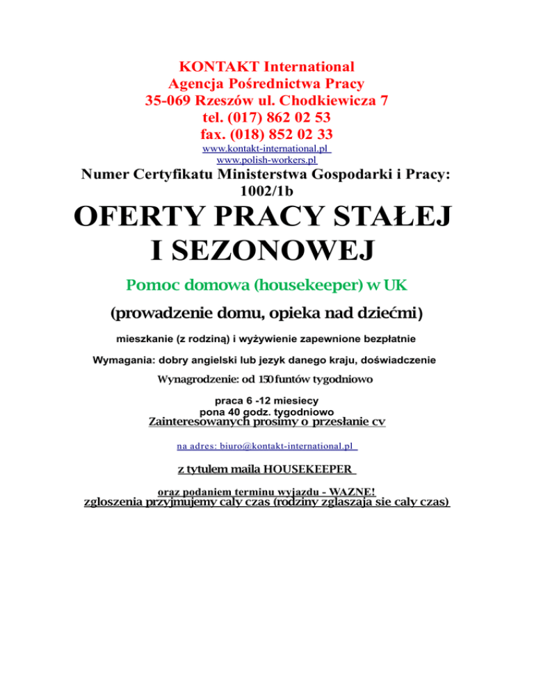 KONTAKT International Agencja Pośrednictwa Pracy 35-069 Rzeszów ul. Chodkiewicza 7 tel. (017) 862 02 53 fax. (018) 852 02 33 www.kontakt-international.pl www.polish-workers.pl Numer Certyfikatu Ministerstwa Gospodarki i Pracy: 1002/1b OFERTY PRACY STAŁEJ I SEZONOWEJ Pomoc domowa (housekeeper) w UK (prowadzenie domu, opieka nad dziećmi) mieszkanie (z rodziną) i wyżywienie zapewnione bezpłatnie Wymagania: dobry angielski lub jezyk danego kraju, doświadczenie Wynagrodzenie: od 150 funtów tygodniowo praca 6 -12 miesiecy pona 40 godz. tygodniowo Zainteresowanych prosimy o przesłanie cv na adres: [email protected] z tytulem maila HOUSEKEEPER oraz podaniem terminu wyjazdu - WAZNE! zgloszenia przyjmujemy caly czas (rodziny zglaszaja sie caly czas) OPIEKUNKA DO DZIECI (AU PAIR) Program dla osób uczących się języka 30 miejsc – UK, Irlandia, Niemcy, Austria, Hiszpania, Włochy, Francja, Belgia, Holandia, Luksemburg, kraje skandynawskie Wymagania: podstawowa znajomość języka obcego Wynagrodzenie: 260-400 euro kieszonkowego miesięcznie, mieszkanie, wyżywinie zapewnione bezpłatnie praca 6 -12 miesiecy, ok. 30 godzin pracy tygodniowo Mieszkanie i wyżywienie zapewnione bezpłatnie, Zainteresowanych prosimy o przeslanie zgłoszenia na adres [email protected] z tytulem maila AU PAIR oraz podaniem terminu wyjazdu - WAZNE! zgloszenia przyjmujemy cały czas (rodziny zglaszaja sie caly czas) PRACA w rolnictwie w Holandii (ze względu na to, że praca ma charakter stażu przyjmowane sa osoby tylko do 26 lat) cały czas mamy nowe oferty – wyjazdy są organizowane systematycznie Praca/staż od 12-16 tygodni Opis stanowiska pracy: Sadzenie i pielęgnacja drzewek owocowych, prace przy kwiatach, warzywach i owocach (głównie szklarnie), inne prace w rolnictwie Wymagania: osoby do 26 lat, mile widziane prawo jazdy, średnia znajomość jęz. angielskiego lub niemieckiego Warunki: mieszkanie zapewnione za darmo i wyżywienie zapewnione – odpłatne 4,5 euro/dzień, zwrot kosztów podroży przez pracodawcę, wynagrodzenie: 5,3 euro na rękę Zainteresowanych prosimy o przeslanie cv w jezyku angielskim ze zdjeciem na adres [email protected] z tytulem maila STAŻ/PRAKTYKA ROLNICZA W HOLANDII oraz podaniem terminu wyjazdu - WAZNE! cały czas mamy nowe oferty – wyjazdy są organizowane systematycznie ___________________________________________________________________________ OFERTY PRACY SEZONOWEJ SEZON 2010! 2-4 miesięcy w okresie czerwiec-wrzesień - wakacje 2010 OPIEKUNKA DO DZIECI ( AU PAIR) 15 miejsc – UK, Irlandia, Niemcy, Austria, Hiszpania, Włochy sezon 2009 – wyjazdy w maju, czerwcu, lipcu Wymagania: komunikatywna znajomośc języka obcego Wynagrodzenie: 260-400 euro kieszonkowego miesięcznie 30 godzin pracy tygodniowo praca 2-4 miesiecy Mieszkanie i wyżywienie zapewnione bezpłatnie, często rodziny zabierają au pair na wspaniałe wakacje!!! Zainteresowanych prosimy o przeslanie zgłoszenia na adres [email protected] z tytulem maila AU PAIR WAKACJE 2009 zgloszenia przyjmujemy do wyczerpania sie miejsc! OSOBY DO ZBIORU TRUSKAWEK W NIEMCZECH SEZON 2010 BEZ ZNAJOMOŚCI JĘZYKA! stawki ok. 5 euro na rękę Sezon 20010 praca 8 tygodni Termin wyjazdu : od początku maja i lipca – dwa terminy praca zawsze na 2 miesiace Wymagania: dobry stan zdrowia, nie jest wymagana znajomość języka Wynagrodzenie: ok. 5 euro netto /godz. 40 godzin pracy tygodniowo plus nadgodziny Zainteresowanych prosimy o przeslanie cv na adres [email protected] z tytulem maila TRUSKAwki 2010 oraz podaniem terminu wyjazdu - WAZNE! zgloszenia przyjmujemy tylko do wyczerpania się miejsc!!! Staż/praktykę w Holandii WAKACJE 2010 (ze względu na to, że praca ma charakter stażu przyjmowane sa osoby tylko do 26 lat) Praca/staż od 12-16 tygodni Opis stanowiska pracy: Sadzenie i pielęgnacja drzewek owocowych, prace przy kwiatach, warzywach i owocach (głównie szklarnie), inne prace w rolnictwie Wymagania: osoby do 26 lat, mile widziane prawo jazdy, średnia znajomość jęz. angielskiego lub niemieckiego Warunki: mieszkanie zapewnione za darmo i wyżywienie zapewnione – odpłatne 4,5 euro/dzień lub we własnym zakresie, zwrot kosztów podroży przez pracodawcę, wynagrodzenie: 5,3 euro na rękę Zainteresowanych prosimy o przeslanie cv w jezyku angielskim ze zdjeciem na adres [email protected] z tytulem maila STAŻ/PRAKTYKA ROLNICZAW HOLANDII 2010 oraz podaniem terminu wyjazdu - WAZNE! zgloszenia przyjmujemy do wyczerpania sie miejsc W związku ze zbliżającym się rozpoczęciem kontraktu poszukujemy chętnych na stanowisko: KUCHARZA - w NORWEGII 11.000,- NOK netto miesięcznie +ZAKWATEROWANIE +WYŻYWIENIE 3x dziennie +ZWROT KOSZTÓW PODRÓŻY Okres pracy : od lutego 2010 Zainteresowane osoby prosimy o przesłanie CV, kopii dowodu osobistego na poniższy adres. NIE WYMAGAMY ZNAJOMOSCI JĘZYKA OBCEGO Oferta ważna do 1.03.2010 Barbara Dawidowicz ZPR Agency Sp. z o.o. tel. 0-22-826-09-57 0-22-829-68-17 Senatorska 13/15 fax.0-22-826-22-36 00-075 Warszawa e-mail : [email protected] Wpis do rejestru agencji pośrednictwa pracy za granicą nr 3286 PRACA W HOLANDII DLA KOBIET I MĘŻCZYZN OTTO Polska Sp. z o.o. jest częścią holenderskiego holdingu OTTO Work Force B.V., który jest największą agencją pośrednictwa pracy w Holandii. OTTO Polska Sp. z o.o. jest niekwestionowanym i największym liderem oraz najprężniej rozwijającym się biurem pośrednictwa pracy za granicą i w Polsce. W chwili obecnej dla naszych holenderskich Klientów poszukujemy zarówno KOBIET jak i mężczyzn do pracy na stanowiskach produkcyjnych: Wymagania : znajomość języka obcego (angielski, niemiecki lub holenderski) – warunek konieczny gotowość na wyjazd już w grudniu 2009r. niekaralność motywacja i chęć do pracy wysoka kultura osobista Opis stanowiska pracownicy zatrudnieni będą na stanowisku pracownik fizyczny: praca przy taśmie produkcyjnej prace magazynowe – pakowanie, sortowanie, kompletowanie zamówień p