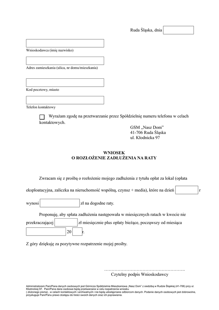 Ruda Śląska, dnia Wnioskodawca (imię nazwisko) Adres zamieszkania (ulica, nr domu/mieszkania) Kod pocztowy, miasto Telefon kontaktowy Wyrażam zgodę na przetwarzanie przez Spółdzielnię numeru telefonu w celach kontaktowych. GSM „Nasz Dom” 41-706 Ruda Śląska ul. Kłodnicka 97 WNIOSEK O ROZŁOŻENIE ZADŁUŻENIA NA RATY Zwracam się z prośbą o rozłożenie mojego zadłużenia z tytułu opłat za lokal (opłata eksploatacyjna, zaliczka na nieruchomość wspólną, czynsz + media), które na dzień wynosi zł na dogodne raty. Proponuję, aby spłata zadłużenia następowała w miesięcznych ratach w kwocie nie przekraczającej zł miesięcznie plus opłaty bieżące, począwszy od miesiąca 20 r. Z góry dziękuję za pozytywne rozpatrzenie mojej prośby. ………………………………………………. Czytelny podpis Wnioskodawcy Administratorem Pani/Pana danych osobowych jest Górnicza Spółdzielnia Mieszkaniowa „Nasz Dom” z siedzibą w Rudzie Śląskiej (41-706) przy ul. Kłodnickiej 97. Pani/Pana dane osobowe będą przetwarzane w celu rozpatrzenia wniosku ( złożonego pisma) , w celach kontaktowych i archiwalnych i nie będą udostępniane odbiorcom danych. Podanie danych osobowych jest dobrowolne, przysługuje Pani/Panu prawo dostępu do treści swoich danych oraz ich poprawiania. r
