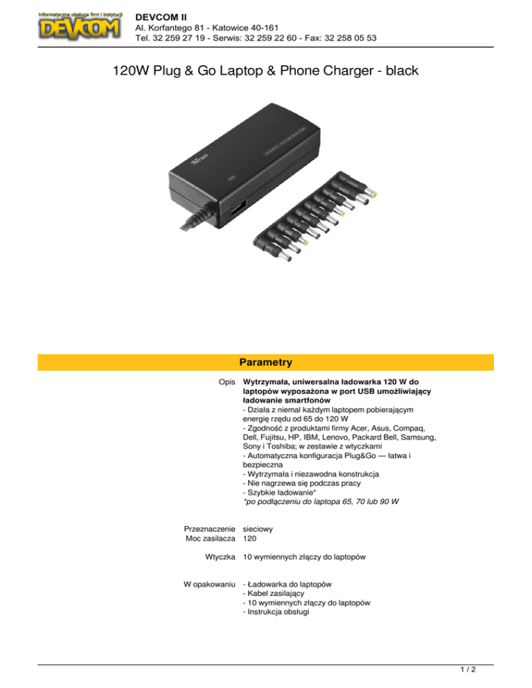 DEVCOM II Al. Korfantego 81 - Katowice 40-161 Tel. 32 259 27 19 - Serwis: 32 259 22 60 - Fax: 32 258 05 53 120W Plug & Go Laptop & Phone Charger - black Parametry Opis Wytrzymała, uniwersalna ładowarka 120 W do laptopów wyposażona w port USB umożliwiający ładowanie smartfonów - Działa z niemal każdym laptopem pobierającym energię rzędu od 65 do 120 W - Zgodność z produktami firmy Acer, Asus, Compaq, Dell, Fujitsu, HP, IBM, Lenovo, Packard Bell, Samsung, Sony i Toshiba; w zestawie z wtyczkami - Automatyczna konfiguracja Plug&Go — łatwa i bezpieczna - Wytrzymała i niezawodna konstrukcja - Nie nagrzewa się podczas pracy - Szybkie ładowanie* *po podłączeniu do laptopa 65, 70 lub 90 W Przeznaczenie sieciowy Moc zasilacza 120 Wtyczka 10 wymiennych złączy do laptopów W opakowaniu - Ładowarka do laptopów - Kabel zasilający - 10 wymiennych złączy do laptopów - Instrukcja obsługi 1/2 DEVCOM II Al. Korfantego 81 - Katowice 40-161 Tel. 32 259 27 19 - Serwis: 32 259 22 60 - Fax: 32 258 05 53 Pasuje do Zgodność z produktami firmy Acer, Asus, Compaq, Dell, Fujitsu, HP, IBM, Lenovo, Packard Bell, Samsung, Sony i Toshiba Pozostałe parametry - Wymiary: 62x148x35mm - Wymiary opakowania: 250x150x55 mm 2/2 Powered by TCPDF (www.tcpdf.org)