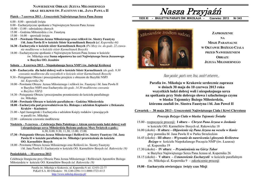 NAWIEDZENIE OBRAZU JEZUSA MIŁOSIERNEGO ORAZ RELIKWII ŚW. FAUSTYNY I BŁ. JANA PAWŁA II Piątek – 7 czerwca 2013 – Uroczystość Najświętszego Serca Pana Jezusa 6.00 - 8.00 - spowiedź święta 8.00 - Eucharystyczne spotkanie z Najświętszym Sercem Pana Jezusa 10.00 - 13.00 - odwiedziny chorych 15.00 - Godzina Miłosierdzia z św. Faustyną 15.00 – 16.00 – spowiedź święta 16.15 - Powitanie Obrazu Jezusa Miłosiernego oraz relikwii św. Siostry Faustyny i bł. Jana Pawła II w kościele Sióstr Karmelitanek Bosych (ul. Kopernika 44) 16.30 - Eucharystia w kościele sióstr Karmelitanek Bosych (Po Mszy św. do godz. 22 czuwanie modlitewne w kościele sióstr Karmelitanek Bosych) 18.00 - Eucharystyczne spotkanie z Najświętszym Sercem Pana Jezusa w kościele św. Mikołaja oraz Suma odpustowa ku czci Najświętszego Serca Jezusowego w Bazylice OO. Jezuitów Sobota – 8 czerwca 2013 – Niepokalanego Serca NMP i św. Jadwigi Królowej 6.30 - Eucharystia dla ludzi dobrej woli w kościele Sióstr Karmelitanek (do godz. 9.30 czuwanie modlitewne dla wszystkich w kościele sióstr Karmelitanek Bosych) 9.30 - Pożegnanie Obrazu i procesjonalne przejście z obrazem do Bazyliki NSPJ (ul. Kopernika 26) 10.00 - Powitanie Obrazu Jezusa Miłosiernego i relikwii św. Faustyny i bł. Jana Pawła II w Bazylice NSPJ oraz Eucharystia (do godz. 14.30 modlitewne czuwanie w Bazylice NSPJ) 14.30 - Pożegnanie Obrazu i procesjonalne przeniesienie do kościoła parafialnego św. Mikołaja 15.00 - Powitanie Obrazu w kościele parafialnym - Godzina Miłosierdzia 18.00 - Eucharystia pod przewodnictwem Ks. Biskupa z udziałem Kapłanów z Dekanatu Kraków - Kazimierz 21.00 - Apel Jasnogórski i Eucharystia z udziałem Księży rodaków i pracujących w parafii św. Mikołaja 22.00 – całonocne czuwanie modlitewne Niedziela – 9 czerwca – Celebracja Dnia Pańskiego z Aktem zawierzenia ludzi dobrej woli i niespokojnego serca Miłosierdziu Bożemu podczas Mszy Świętych o godz.: 6.30; 8.00; 9.30; 11.30; 13.00; 15.00. 17.30 - Pożegnanie Obrazu Jezusa Miłosiernego i Relikwii św. Siostry Faustyny i bł. Jana Pawła II w kościele parafialnym św. Mikołaja i przewiezienie do kościoła OO. Karmelitów Bosych 18.00 - Powitanie Obrazu Jezusa Miłosiernego oraz Relikwii św. Siostry Faustyny i bł. Jana Pawła II i Eucharystia w kościele OO. Karmelitów Bosych (ul. Rakowicka 18) Poniedziałek – 10 czerwca 2013 Celebracje liturgiczne przy Obrazie Pana Jezusa Miłosiernego i Relikwiach Apostołów Bożego Miłosierdzia w kościele OO. Karmelitów Bosych (ul. Rakowicka 18) Parafia św. Mikołaja w Krakowie, ul. Kopernika 9, tel. 12/431-22-77 PeKaO S.A. III O/Kraków: 58-1240-2294-1111-0000-3723-4113 http://www.mikolaj.diecezja.pl/ Nasza Przyjaźń 1935 XI - BIULETYN PARAFII ŚW. MIKOŁAJA - Czerwiec 2013 Nr 343 ZAPROSZENIE NA MISJE PARAFIALNE W OKTAWIE BOŻEGO CIAŁA PRZED NAWIEDZENIEM OBRAZU JEZUSA MIŁOSIERNEGO Bone pastor, panis vere, Iesu, nostri miserere… Parafia św. Mikołaja w Krakowie serdecznie zaprasza w dniach 30 maja do 10 czerwca 2013 roku wszystkich ludzi dobrej woli i niespokojnego serca na spotkania przy Stole dobrego słowa i szlachetnego czynu w blasku Tajemnicy Bożego Miłosierdzia, któremu zaufali św. Siostra Faustyna i bł. Jan Paweł II Czwartek – 30 maja 2013 - Uroczystość Najświętszego Ciała i Krwi Chrystusa Procesja Bożego Ciała w blasku Tajemnic Światła 15.00 - rozpoczęcie procesji: I ołtarz – Chrzest Pana Jezusa w Jordanie w kościele OO. Karmelitów Bosych ul. Rakowicka 18 16.00 (około) - II ołtarz – Objawienie się Pana Jezusa na weselu w Kanie przy pomniku bł. Jana Pawła II w Parku Strzeleckim 16.45 (około) - III ołtarz – Wzywanie do nawrócenia i głoszenie Królestwa Bożego w kościele Niepokalanego Poczęcia NMP (św. Łazarza) ul. Kopernika 19 17.30 (około) - IV ołtarz – Przemienienie na Górze Tabor w Bazylice Najświętszego Serca Pana Jezusa ul. Kopernika 26 18.15 (około) - V ołtarz – Ustanowienie Eucharystii w kościele parafialnym św. Mikołaja ul. Kopernika 9 – zakończenie procesji 19.00 - Eucharystia otwierająca święty czas Misji PROGRAM MISJI ŚWIĘTYCH KOŚCIÓŁ OO. KARMELITÓW BOSYCH I BAZYLIKA NSPJ OO. JEZUITÓW: Piątek 31 maja – czwartek 6 czerwca 2013 18.00 – Eucharystyczne spotkania ludzi dobrej woli i niespokojnego serca KOŚCIÓŁ PARAFIALNY ŚW. MIKOŁAJA: Piątek – 31 maja 2013 – Święto Nawiedzenia NMP „Jego miłosierdzie z pokolenia na pokolenie…” 8.00 - Eucharystyczne spotkanie z Matką Miłosierdzia 15.00 - Godzina Miłosierdzia z św. Faustyną 18.00 - Eucharystyczne spotkanie z Matką Miłosierdzia 19.00 - Nabożeństwo majowe z procesją i modlitwą za zmarłych bliskich naszym sercom 20.00 - Modlitewne czuwanie z bł. Janem Pawłem II 21.00 - Apel Jasnogórski Sobota – 1 czerwca 2013 – Międzynarodowy Dzień Dziecka „Nazywamy się dziećmi Bożymi i nimi jesteśmy…” 8.00 - Eucharystyczne spotkanie we wspólnocie dzieci Bożych 10.00 - Eucharystyczne spotkanie we wspólnocie absolwentów Wydziału Lekarskiego CMUJ 15.00 - Godzina Miłosierdzia z św. Faustyną 16.00 - Spotkanie dzieci ze św. Mikołajem dobroczyńcą z wyobraźnią miłosierdzia 18.00 - Eucharystyczne spotkanie we wspólnocie dzieci Bożych 19.00 - Nabożeństwo czerwcowe ku czci Najświętszego Serca Pana Jezusa z procesją Eucharystyczną, odnowieniem przyrzeczeń chrzcielnych i modlitwą w intencji dzieci nienarodzonych oraz matek w błogosławionym stanie 20.00 - Modlitewne czuwanie z bł. Janem Pawłem II 21.00 - Apel Jasnogórski Niedziela – 2 czerwca 2013 – Dzień Święty Uroczysta celebracja Pierwszego Dnia Tygodnia, w którym Jezus Chrystus zmartwychwstał i zesłał na Apostołów Ducha Świętego podczas Mszy Świętych: 6.30; 8.00; 9.30; 11.30; 13.00; 15.00; 19.00; 18.30 - Nabożeństwo czerwcowe z procesją Poniedziałek – 3 czerwca 2013 – Dzień modlitw w intencji osób chorych, sa