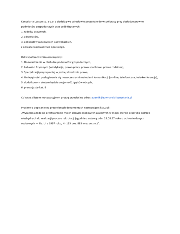 Kancelaria Lexcon sp. z o.o. z siedzibą we Wrocławiu poszukuje do współpracy przy obsłudze prawnej podmiotów gospodarczych oraz osób fizycznych: 1. radców prawnych, 2. adwokatów, 3. aplikantów radcowskich i adwokackich. z obszaru województwa opolskiego. Od współpracownika oczekujemy: 1. Doświadczenia w obsłudze podmiotów gospodarczych, 2. Lub osób fizycznych (windykacja, prawo pracy, prawo spadkowe, prawo rodzinne), 3. Specjalizacji przynajmniej w jednej dziedzinie prawa, 4. Umiejętności posługiwania się nowoczesnymi metodami komunikacji (on-line, telefoniczna, tele-konferencja), 5. dodatkowym atutem będzie znajomość języków obcych, 6. prawa jazdy kat. B CV wraz z listem motywacyjnym proszę przesłać na adres: [email protected] Prosimy o dopisanie na przesyłanych dokumentach następującej klauzuli: „Wyrażam zgodę na przetwarzanie moich danych osobowych zawartych w mojej ofercie pracy dla potrzeb niezbędnych do realizacji procesu rekrutacji (zgodnie z ustawą z dn. 29.08.97 roku o ochronie danych osobowych — Dz. U. z 1997 roku, Nr 133 poz. 883 wraz ze zm.)”.