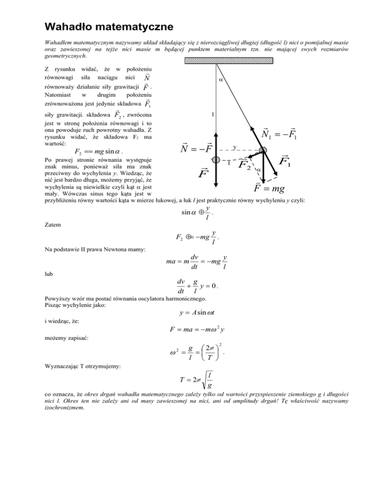 Wahadło matematyczne Wahadłem matematycznym nazywamy układ składający się z nierozciągliwej długiej (długość l) nici o pomijalnej masie oraz zawieszonej na tejże nici masie m będącej punktem materialnym tzn. nie mającej swych rozmiarów geometrycznych. Z rysunku widać, że w położeniu równowagi siła naciągu nici N α równoważy działanie siły grawitacji F . Natomiast w drugim położeniu zrównoważona jest jedynie składowa siły grawitacji. składowa F1 F2 , zwrócona l jest w stronę położenia równowagi i to ona powoduje ruch powrotny wahadła. Z rysunku widać, że składowa F2 ma 1 1 wartość: y F2 == mg sin α . Po prawej stronie równania występuje ł 1 znak minus, ponieważ siła ma znak 2 α przeciwny do wychylenia y. Wiedząc, że nić jest bardzo długa, możemy przyjąć, że wychylenia są niewielkie czyli kąt α jest mały. Wówczas sinus tego kąta jest w przybliżeniu równy wartości kąta w mierze łukowej, a łuk ł jest praktycznie równy wychyleniu y czyli: N = −F N = −F F F sin α ≈ F F = mg y . l Zatem F2 ≈= − mg y . l Na podstawie II prawa Newtona mamy: ma = m dv y = −mg dt l lub dv g + y = 0. dt l Powyższy wzór ma postać równania oscylatora harmonicznego. Pisząc wychylenie jako: y = A sin ωt i wiedząc, że: F = ma = − mω 2 y możemy zapisać: 2 g 2π ω = = . l T 2 Wyznaczając T otrzymujemy: T = 2π l g co oznacza, że okres drgań wahadła matematycznego zależy tylko od wartości przyspieszenie ziemskiego g i długości nici l. Okres ten nie zależy ani od masy zawieszonej na nici, ani od amplitudy drgań! Tę właściwość nazywamy izochronizmem.