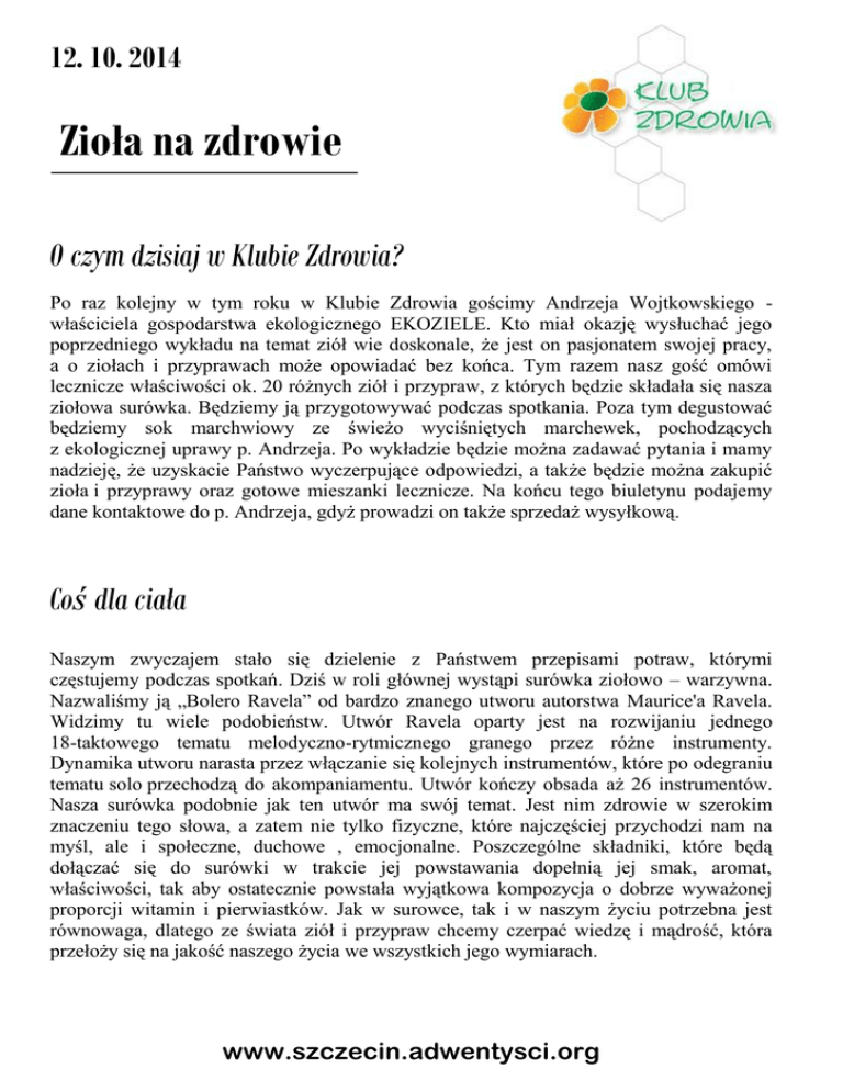 12. 10. 2014 Zioła na zdrowie O czym dzisiaj w Klubie Zdrowia? Po raz kolejny w tym roku w Klubie Zdrowia gościmy Andrzeja Wojtkowskiego właściciela gospodarstwa ekologicznego EKOZIELE. Kto miał okazję wysłuchać jego poprzedniego wykładu na temat ziół wie doskonale, że jest on pasjonatem swojej pracy, a o ziołach i przyprawach może opowiadać bez końca. Tym razem nasz gość omówi lecznicze właściwości ok. 20 różnych ziół i przypraw, z których będzie składała się nasza ziołowa surówka. Będziemy ją przygotowywać podczas spotkania. Poza tym degustować będziemy sok marchwiowy ze świeżo wyciśniętych marchewek, pochodzących z ekologicznej uprawy p. Andrzeja. Po wykładzie będzie można zadawać pytania i mamy nadzieję, że uzyskacie Państwo wyczerpujące odpowiedzi, a także będzie można zakupić zioła i przyprawy oraz gotowe mieszanki lecznicze. Na końcu tego biuletynu podajemy dane kontaktowe do p. Andrzeja, gdyż prowadzi on także sprzedaż wysyłkową. Coś dla ciała Naszym zwyczajem stało się dzielenie z Państwem przepisami potraw, którymi częstujemy podczas spotkań. Dziś w roli głównej wystąpi surówka ziołowo – warzywna. Nazwaliśmy ją „Bolero Ravela” od bardzo znanego utworu autorstwa Maurice'a Ravela. Widzimy tu wiele podobieństw. Utwór Ravela oparty jest na rozwijaniu jednego 18-taktowego tematu melodyczno-rytmicznego granego przez różne instrumenty. Dynamika utworu narasta przez włączanie się kolejnych instrumentów, które po odegraniu tematu solo przechodzą do akompaniamentu. Utwór kończy obsada aż 26 instrumentów. Nasza surówka podobnie jak ten utwór ma swój temat. Jest nim zdrowie w szerokim znaczeniu tego słowa, a zatem nie tylko fizyczne, które najczęściej przychodzi nam na myśl, ale i społeczne, duchowe , emocjonalne. Poszczególne składniki, które będą dołączać się do surówki w trakcie jej powstawania dopełnią jej smak, aromat, właściwości, tak aby ostatecznie powstała wyjątkowa kompozycja o dobrze wyważonej proporcji witamin i pierwiastków. Jak w surowce, tak i w naszym życiu potrzebna jest równowaga, dlatego ze świata ziół i przypraw chcemy czerpać wiedzę i mądrość, która przełoży się na jakość naszego życia we wszystkich jego wymiarach. www.szczecin.adwentysci.org Surówka „Bolero Ravela” Składniki: Warzywa: Zioła i przyprawy: papryka czerwona papryka żółta papryka ostra pomidory seler korzeń seler naciowy pietruszka korzeń kapusta marchew czosnek kozieradka rukola szałwia mięta cząber krwawnik pokrzywa mniszek lekarski natka pietruszki hyzop lekarski sól, olej z pestek winogron lub oliwa z oliwek, sok z cytryny - do smaku Wykonanie: 1. Warzywa - korzeń selera i pietruszki, kapustę, marchew - zetrzeć na tarce. 2. Warzywa - papryki, pomidory, seler naciowy - pokroić w drobną kostkę . 3. Czosnek zmiażdżyć. 4. Zioła i przyprawy posiekać. 5. Wszystkie składniki wymieszać. Dodać sól, olej i wyciśnięty sok z cytryny. Czy wiesz, że… Większość przypraw ziołowych zawiera dużo antyutleniaczy: wit.C i E, karotenoidów, flawonoidów, terpenów - wspierają one naturalne mechanizmy obronne komórek człowieka, przeciwdziałają wielu chorobom i opóźniają procesy starzenia. Zielone liście zawierają praktycznie wszystkie potrzebne nam substancje odżywcze (witaminy, minerały, substancje ochronne) oraz w małych ilościach zawierają pełnowartościowe białko. Kwiaty też można jeść – kwiaty malwy, hibiskusa, róży, nagietka, dyni, koniczyny łąkowej można dodawać je do sałatek lub deserów albo zamrażać w kostkach lodu. Do dresingów i ciasta chlebowego można dodać zmielone w mikserze zioła: kosmosę, pokrzywę, lebiodę lub zmielone suszone kwiaty i nasiona koniczyny polnej. www.szczecin.adwentysci.org Coś dla ducha Klub Zdrowia to miejsce, gdzie człowiek jest postrzegany jako jedność psycho – fizyczna. Chyba każdy zgodzi się, że utrzymanie zdrowia zależy nie tylko od stanu naszego ciała, ale i stanu naszego umysłu. Większość z nas nie docenia jednak rangi tej zależności. Dlatego zamieszczamy dla Państwa wartościowe myśli z Pisma Świętego, które niejednokrotnie dodają siły w troskach i zmartwieniach jakie przychodzi nam nosić w naszej codzienności i uczą nas jak żyć. Pełna jest ziemia łaski Pana. Ps. 33,5 Nienawiść powoduje spory, lecz miłość przykrywa wszystkie występki. Przyp. Sal. 10,12 Tak mówi Pan, twój Odkupiciel, Święty Izraelski: Ja, Pan twój Bóg, uczę cię tego co ci wyjdzie na dobre, prowadzę cię drogą, którą masz iść. O, gdybyś był zważał na moje przykazania, twój pokój byłby jak strumień, a twoja sprawiedliwość jak fale morskie! Izaj.48,17.18 Chociaż upadłem jednak wstanę, chociaż siedzę w ciemności, Jednak Pan jest moją światłością. Mich. 7,8 Pójdźcie do mnie wszyscy, którzy jesteście spracowani i obciążeni, a Ja wam dam ukojenie. Mat. 11,28 Niech żadne nieprzyzwoite słowo nie wychodzi z ust waszych, ale tylko dobre, które może budować, gdy zajdzie potrzeba, aby przyniosło błogosławieństwo tym, którzy go słuchają. Ef. 4,29 Nie troszczcie się o nic, ale we wszystkim w modlitwie i błaganiach z dziękczynieniem powierzcie prośby wasze Bogu. Fil. 4,6 www.szczecin.adwentysci.org Zioła Ekologiczne w dobrej cenie! Oferta dostępna na stronie www.ekoziele.pl Mieszanki ziołowe na różne dolegliwości Zioła do pielęgnacji – kosmetyczne Herbatki o różnych smakach Pojedyncze zioła sypkie Przyprawy ziołowe GOSPODARSTWO EKOLOGICZNE ANDRZEJ WOJTKOWSKI Pratków 79, 98 – 220 Zduńska Wola tel. 43 825 14 80 tel. kom. 603 094 422 Gospodarstwo prowadzi sprzedaż wysyłkową. Do ceny doliczane są koszty przesyłki Skorzystaj z biblioteki Klubu Zdrowia !!! W naszej bibliotece w dziale Zdrowie znajdziecie państwo ciekawe książki o tematyce zdrowotnej, poradniki lecznicze oraz przepisy kulinarne. Polecamy