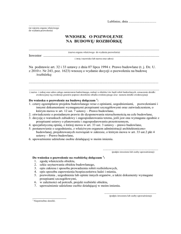 Lubliniec, dnia ................................. ..................................... (nr rejestru organu właściwego do wydania pozwolenia) WNIOSEK O POZWOLENIE NA BUDOWĘ/ ROZBIÓRKĘ ............................................................................................................................................... (nazwa organu właściwego do wydania pozwolenia) Inwestor ............................................................................................................................... ( imię i nazwisko lub nazwa oraz adres) Na podstawie art. 32 i 33 ustawy z dnia 07 lipca 1994 r. Prawo budowlane (t. j. Dz. U. z 2010 r. Nr 243, poz. 1623) wnoszę o wydanie decyzji o pozwoleniu na budowę /rozbiórkę: ........................................................................................................................................................... ............................................................................................................................................................ ( nazwa i rodzaj oraz adres całego zamierzenia budowlanego, rodzaj/-e obiektu/-ów bądź robót budowlanych, oznaczenie działki ewidencyjnej wg ewidencji gruntów poprzez określenie obrębu ewidencyjnego oraz numeru działki ewidencyjnej) Do wniosku o pozwolenie na budowę dołączam 1: 1. cztery egzemplarze projektu budowlanego wraz z opiniami, uzgodnieniami, pozwoleniami i innymi dokumentami wymaganymi przepisami szczegółowymi oraz zaświadczeniem, o którym mowa w art. 12 ust. 7 ustawy – Prawo budowlane, 2. oświadczenie o posiadanym prawie do dysponowania nieruchomością na cele budowlane, 3. decyzję o warunkach zabudowy i zagospodarowania terenu, jeśli jest ona wymagana zgodnie z przepisami ustawy o planowaniu i zagospodarowaniu przestrzennym, 4. specjalistyczną opinię, o której mowa w art. 33 ust. 3 ustawy – prawo budowlane, 5. postanowienie o uzgodnieniu, z właściwym organem administracji architektonicznobudowlanej, projektowanych rozwiązań w zakresie, o którym mowa w art. 33 ust.2 pkt 4 ustawy – Prawo budowlane, 6. upoważnienie udzielone osobie działającej w moim imieniu. ......................................................................... (podpis inwestora lub osoby upoważnionej) Do wniosku o pozwolenie na rozbiórkę dołączam 1: 1. zgodę właściciela obiektu, 2. szkic usytuowania obiektu budowlanego, 3. opis zakresu i sposobu prowadzenia robót rozbiórkowych, 4. opis sposobu zapewnienia bezpieczeństwa ludzi i mienia, 5. pozwolenia , uzgodnienia lub opinie innych organów, a także dokumenty wymagane przepisami szczegółowymi, 6. w zależności od potrzeb, projekt rozbiórki obiektu, 7. upoważnienie udzielone osobie działającej w moim imieniu. .............................................................. (podpis inwestora lub osoby upoważnionej) -----------------------------------------1 Niepotrzebne skreślić.