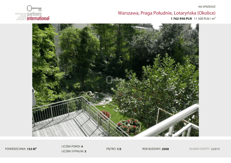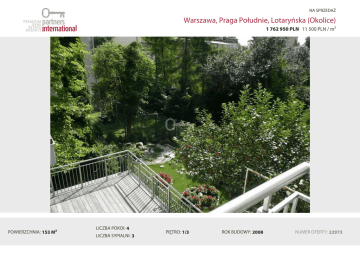 NA SPRZEDAŻ Warszawa, Praga Południe, Lotaryńska (Okolice) 1 762 950 PLN 11 500 PLN / m² POWIERZCHNIA: 153 M² LICZBA POKOI: 4 LICZBA SYPIALNI: 3 PIĘTRO: 1/3 ROK BUDOWY: 2008 NUMER OFERTY: 22973 Opis APARTAMENT W KAMERALNYM, NOWOCZESNYM BUDYNKU NA SASKIEJ KĘPIE – STAN DEWELOPERSKI! Każda kondygnacja umożliwia zaaranżowanie niezależnego, komfortowego apartamentu według indywidualnych upodobań. UKŁAD POMIESZCZEŃ: Apartament jednopoziomowy, 4 pokoje. LOKALIZACJA: Nieruchomość znajduje się w willowej dzielnicy w otoczeniu wielu placówek dyplomatycznych i apartamentowców. Okolica charakteryzuje się niską zabudową mieszkalną z zachowaną architekturą międzywojenną. Apartament przy niewielkiej wewnętrznej ulicy z możliwością parkowania wzdłuż ogrodzenia budynku. Willa leży w pobliżu punktów handlowo-usługowych i komunikacji miejskiej. INFORMACJE DODATKOWE: Obecnie trwa geodezyjne wyodrębnianie lokali. Willa posiada pomieszczenie dla ochrony (recepcja budynku). KONTAKT: Beata, Tel: 502 624 500 POŚREDNIK ODPOWIEDZIALNY: Joanna Czapska (licencja zawodowa nr 4585), Przedstawiona wyżej propozycja nie jest ofertą handlową w rozumieniu przepisów prawa lecz ma charakter informacyjny. Wszelkie dane dotyczące nieruchomości uzyskano na podstawie oświadczeń Wynajmujących. Plan Lokalizacja Katarzyna Joanna Czapska Katarzyna Joanna Czapska Ul. Koszykowa 10/19 00-564 Warszawa tel. (+48 22) 646 52 02 fax: (+48 22) 646 26 99 partnersinternational.pl Pośrednik odpowiedzialny: BEATA DZIEDZIC telefon: 502624500 email: [email protected]