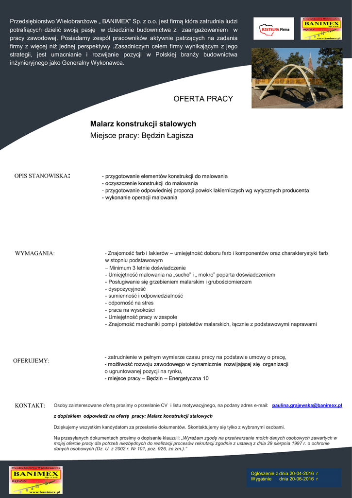 Przedsiębiorstwo OFERUJEMY: Wielobranżowe „ BANIMEX” Sp. z o.o. jest firmą która zatrudnia ludzi potrafiących dzielić swoją pasję w dziedzinie budownictwa z zaangażowaniem w pracy zawodowej. Posiadamy zespół pracowników aktywnie patrzących na zadania firmy z więcej niż jednej perspektywy .Zasadniczym celem firmy wynikającym z jego strategii, jest umacnianie i rozwijanie pozycji w Polskiej branży budownictwa inżynieryjnego jako Generalny Wykonawca. OFERTA PRACY Malarz konstrukcji stalowych Miejsce pracy: Będzin Łagisza OPIS STANOWISKA: WYMAGANIA: - przygotowanie elementów konstrukcji do malowania - oczyszczenie konstrukcji do malowania - przygotowanie odpowiedniej proporcji powłok lakierniczych wg wytycznych producenta - wykonanie operacji malowania - Znajomość farb i lakierów – umiejętność doboru farb i komponentów oraz charakterystyki farb w stopniu podstawowym Minimum 3 letnie doświadczenie - Umiejętność malowania na „sucho” i „ mokro” poparta doświadczeniem - Posługiwanie się grzebieniem malarskim i grubościomierzem - dyspozycyjność - sumienność i odpowiedzialność - odporność na stres - praca na wysokości Ul. Dowolna 5 - Umiejętność pracy w zespole 00-001 Nazwa Miasta - Znajomość mechaniki pomp i pistoletów malarskich, łącznie z podstawowymi Telefon 012 345 67naprawami 89 Faks 012 345 67 88 www.adatum.com OFERUJEMY: KONTAKT: - zatrudnienie w pełnym wymiarze czasu pracy na podstawie umowy o pracę, - możliwość rozwoju zawodowego w dynamicznie rozwijającej się organizacji o. ugruntowanej pozycji na rynku, - miejsce pracy – Będzin – Energetyczna 10 Osoby zainteresowane ofertą prosimy o przesłanie CV i listu motywacyjnego, na podany adres e-mail: [email protected] z dopiskiem odpowiedź na ofertę pracy: Malarz konstrukcji stalowych Dziękujemy wszystkim kandydatom za przesłanie dokumentów. Skontaktujemy się tylko z wybranymi osobami. Na przesyłanych dokumentach prosimy o dopisanie klauzuli: „Wyrażam zgodę na przetwarzanie moich danych osobowych zawartych w mojej ofercie pracy dla potrzeb niezbędnych do realizacji procesów rekrutacji zgodnie z ustawą z dnia 29 sierpnia 1997 r. o ochronie danych osobowych (Dz. U. z 2002 r. Nr 101, poz. 926, ze zm.).” Ogłoszenie z dnia 20-04-2016 r Wygaśnie dnia 20-06-2016 r
