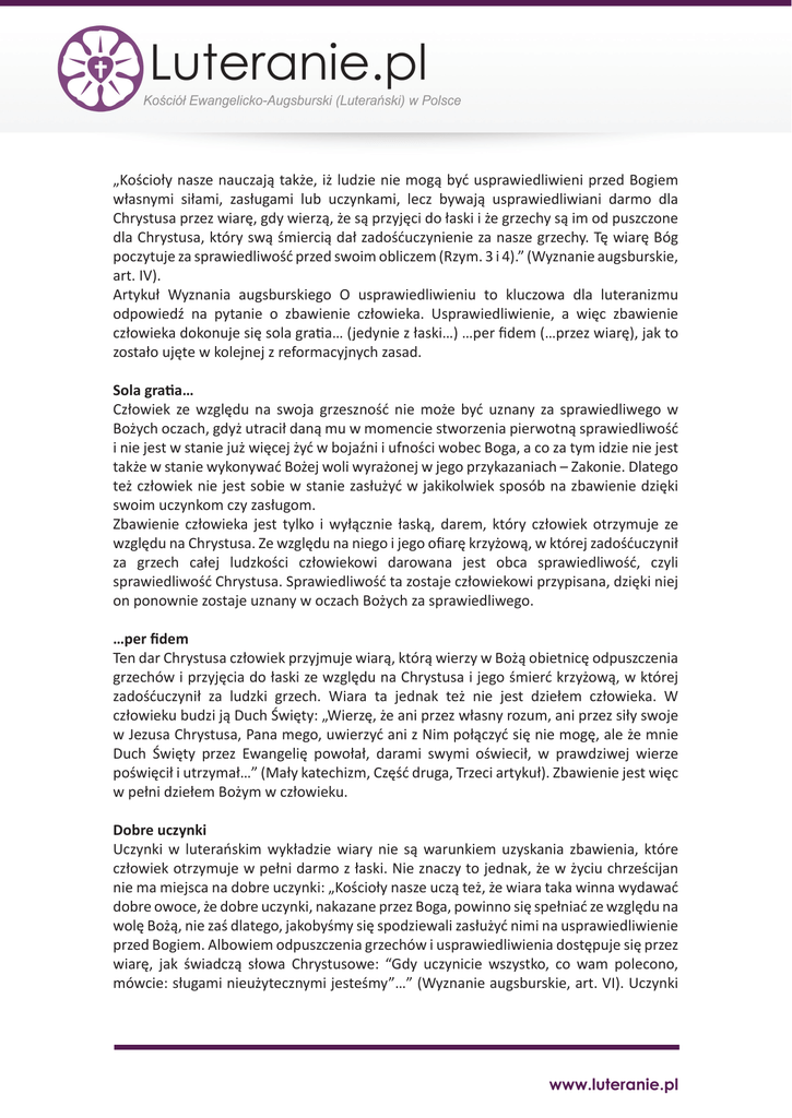 „Kościoły nasze nauczają także, iż ludzie nie mogą być usprawiedliwieni przed Bogiem własnymi siłami, zasługami lub uczynkami, lecz bywają usprawiedliwiani darmo dla Chrystusa przez wiarę, gdy wierzą, że są przyjęci do łaski i że grzechy są im od puszczone dla Chrystusa, który swą śmiercią dał zadośćuczynienie za nasze grzechy. Tę wiarę Bóg poczytuje za sprawiedliwość przed swoim obliczem (Rzym. 3 i 4).” (Wyznanie augsburskie, art. IV). Artykuł Wyznania augsburskiego O usprawiedliwieniu to kluczowa dla luteranizmu odpowiedź na pytanie o zbawienie człowieka. Usprawiedliwienie, a więc zbawienie człowieka dokonuje się sola gratia… (jedynie z łaski…) …per fidem (…przez wiarę), jak to zostało ujęte w kolejnej z reformacyjnych zasad. Sola gratia… Człowiek ze względu na swoja grzeszność nie może być uznany za sprawiedliwego w Bożych oczach, gdyż utracił daną mu w momencie stworzenia pierwotną sprawiedliwość i nie jest w stanie już więcej żyć w bojaźni i ufności wobec Boga, a co za tym idzie nie jest także w stanie wykonywać Bożej woli wyrażonej w jego przykazaniach – Zakonie. Dlatego też człowiek nie jest sobie w stanie zasłużyć w jakikolwiek sposób na zbawienie dzięki swoim uczynkom czy zasługom. Zbawienie człowieka jest tylko i wyłącznie łaską, darem, który człowiek otrzymuje ze względu na Chrystusa. Ze względu na niego i jego ofiarę krzyżową, w której zadośćuczynił za grzech całej ludzkości człowiekowi darowana jest obca sprawiedliwość, czyli sprawiedliwość Chrystusa. Sprawiedliwość ta zostaje człowiekowi przypisana, dzięki niej on ponownie zostaje uznany w oczach Bożych za sprawiedliwego. …per fidem Ten dar Chrystusa człowiek przyjmuje wiarą, którą wierzy w Bożą obietnicę odpuszczenia grzechów i przyjęcia do łaski ze względu na Chrystusa i jego śmierć krzyżową, w której zadośćuczynił za ludzki grzech. Wiara ta jednak też nie jest dziełem człowieka. W człowieku budzi ją Duch Święty: „Wierzę, że ani przez własny rozum, ani przez siły swoje w Jezusa Chrystusa, Pana mego, uwierzyć ani z Nim połączyć się nie mogę, ale że mnie Duch Święty przez Ewangelię powołał, darami swymi oświecił, w prawdziwej wierze poświęcił i utrzymał…” (Mały katechizm, Część druga, Trzeci artykuł). Zbawienie jest więc w pełni dziełem Bożym w człowieku. Dobre uczynki Uczynki w luterańskim wykładzie wiary nie są warunkiem uzyskania zbawienia, które człowiek otrzymuje w pełni darmo z łaski. Nie znaczy to jednak, że w życiu chrześcijan nie ma miejsca na dobre uczynki: „Kościoły nasze uczą też, że wiara taka winna wydawać dobre owoce, że dobre uczynki, nakazane przez Boga, powinno się spełniać ze względu na wolę Bożą, nie zaś dlatego, jakobyśmy się spodziewali zasłużyć nimi na usprawiedliwienie przed Bogiem. Albowiem odpuszczenia grzechów i usprawiedliwienia dostępuje się przez wiarę, jak świadczą słowa Chrystusowe: “Gdy uczynicie wszystko, co wam polecono, mówcie: sługami nieużytecznymi jesteśmy”…” (Wyznanie augsburskie, art. VI). Uczynki www.luteranie.pl są więc wyrazem wdzięczności za otrzymany dar zbawienia, nie zaś podstawą do jego otrzymania. Wiara dana przez Ducha Świętego, jeśli ma być wiarą zbawczą, musi być wiarą żywą, która przynosi owoce w postaci dobrych uczynków. Articulus stantis et cadentis ecclesiae Czwarty artykuł Wyznania augsburskiego O usprawiedliwieniu uznawany jest w teologii luterańskiej za articulus stantis et cadentis ecclesiae – artykuł od którego zależy czy Kościół stoi czy się chwieje. Od wierności temu artykułowi zależy istnienie Kościoła. Jego zakłamywanie podważa sens istnienia Kościoła. Artykuł O usprawiedliwieniu staje się więc podstawowym narzędziem krytycznym wobec życia Kościoła, a także jego teologii i zwiastowania. W takiej roli używał go już Marcin Luter w Artykułach Szmalkaldzkich. Część drugą, w której zawarto artykuły wiary od których nie wolno odstąpić, otwiera stwierdzenie: „Tutaj pierwszym i głównym artykułem jest to, że: Jezus Chrystus, Bóg i Pan nasz, umarł z powodu grzechów naszych i zmartwychwstał dla usprawiedliwienia naszego (Rzym. 4,25). (…) Od tego artykułu odstąpić lub coś przeciwnego uznawać czy dopuszczać nikt z nabożnych nie może, choćby niebo, ziemia i wszystko zawalić się miało. “Nie ma bowiem żadnego innego imienia danego ludziom, przez które moglibyśmy być zbawieni” – powiada Piotr w Dziejach Apostolskich 4,12. “I przez Jego rany jesteśmy uzdrowieni” (Izaj. 53,5). Na tym też artykule zasadza się i opiera wszystko, czego przeciwko papieżowi, diabłu i całemu światu w naszym życiu nauczamy, świadczymy i czynimy. Dlatego powinniśmy co do tej nauki mieć pewność i bynajmniej nie powątpiewać, w przeciwnym razie sprawa jest całkowicie przegrana, i papież, i diabeł, i wszystko, co nam przeciwne, wygrywają i odnoszą nad nami zwycięstwo.” (Artykuły Szmalkaldzkie, II, 1). W kolejnych artykułach części II nauka o usprawiedliwieniu jest podstawowym kryterium krytycznej oceny i idącego za nim odrzucenia takich praktyk i nauczania średniowiecznego Kościoła jak m. in.: msze prywatne (odprawiane bez obecności zboru, rozumiane w średniowieczu jako zasługa przed Bogiem przyczyniająca się do zbawienia człowieka), czyściec, pielgrzymki, prośba o wstawiennictwo świętych, odpusty, cześć relikwii, życie zakonne, czy roszczenia papiestwa do władzy nad duszami. Literatura podstawowa: Księgi Wyznaniowe Kościoła Luterańskiego, wyd. Wydawnictwo Augustana, Bielsko-Biała 2003. Wyznanie augsburskie (Konfesja Augsburska) z 1530 r. Część pierwsza, przeł. z niemieckiego A. Wantuła, w: Wyznanie augsburskie (Konfesja Augsburska) z 1530 roku. 95 tez ks. Marcina Lutra z 1517 roku, seria: Biblioteki Klasyki Ewangelickiej, t. 1,