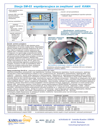 Stacja SM-03 wspó³pracujaca ze zwê¿kami serii KAMA dioda sygnalizacji alarmowej dioda sygnalizacji stanu akumulatora przycisk za³ /wy³ wyœwietlacza gniazdo USB i mini USB do przenoszenia danych do pamiêci zewnêtrznej 3 Przep³yw bie¿¹cy 18,9 m. /h 250 ALARM - 3 m. Suma 000000234 Temperatura 3 2.3 m. pH 3 ON OFF + 19,8 C 7,8 3.7 m 0 poziom Esc Enter Wtorek 9 paŸdziernik 2012r kolorowy wyœwietlacz zasilanie standard 230 V50 Hz opcje - akumulator 12VDC - ogniwa solarne przyciski wyboru wyœwietlanych raportów wykresów i ustawieñ stacji 130 3 Open Channel Flow Monitor Sm-03 KAMA eco Group Zestaw stacja Sm-03 zwê¿ka serii Kama dziêki swej konstrukcji spe³nia wymogi obowi¹zuj¹cych przepisów z zakresu:Prawa ochrony œrodowiska ,Prawa wodnego Zbiorowego zaopatrzenia w wodê i odprowadzenie œcieków , dyrektyw UE EMC & LVD stacja posiada znak CE Service; tel.+ 48(32) 356-32-48 EMC & LVD email [email protected] UltradŸwiêkowy czujnik poziomu dodatkowo mo¿na zamontowaæ czujniki: pH temperatury , przewodnoœci , ropopochodnych kierunku przeplywu,cofki sygna³y wyjœciowe : Modbus RTU, - dwustanowe , - impulsowe - 4-20mA - gprs odizolowana galwanicznie trasa kablowa 24VDC Zasada pomiaru przep³ywu Przep³ywaj¹ca ciecz trafia na opór stawiany przez zabudowan¹ na ich drodze zwê¿kê Kama. Odpowiednio dobrany kszta³t zwê¿ki powoduje spiêtrzanie siê cieczy. Przy ma³ych przep³ywach œcieków spiêtrzenie jest wiêksze wraz z wzrostem poziomu spiêtrzenie ulega zmniejszeniu nie ograniczaj¹c przepustowoœci kana³u a prêdkoœæ przy dnie zwê¿ki wzrasta ,co powoduje jej samooczyszczanie.Zwe¿ka mierzy przep³yw od zera a¿ do pe³nego wype³nienie kolektora. Wartoœæ tego spiêtrzenia zmierzona przez czujnik poziomu przes³ana zostaje tras¹ kablow¹ do stacji Sm-03 ,gdzie przy pomocy odpowiedniego algorytmu przeliczana jest na przep³yw, wyra¿ony w m3/h na wyœwietlaczu stacji. Przeliczony przep³yw elektronika stacji przetwarza na dane do pamiêci jej rejestratorów i liczników sumarycznych. Zwê¿ka KAMA - wlot kolektora œciekowego o œrednicy od 50 do 400 mm przyk³adowa zabudowa zwê¿ki KAMA 1 o szerokosci 400 mm w istniejacej studzience o œrednicy 1000mm .Stacja monitoringu Sm-03 to: po³¹czenie przep³ywomierza, pH- metru, mierników temperatury, przewodnoœci oraz rejestratorów i liczników. Automatyczne rejestratory i liczniki sumaryczne rejestruj¹ i zliczaj¹ dane o iloœci odprowadzanych œcieków w tym z przekroczonym pH, temperatur¹, przewodnoœci¹ rejestruj¹ tak¿e czas wy³¹czeñ i zdarzenia , awarie ,próbê ingerencji w uk³ad pomiarowy . Rejestratory te zapamiêtuj¹ poszczególne dane w cyklach dobowym ,godzinowym miesiêcznym. kwartalnym za ostanie 370 dni ( ka¿da minuta) . Wbudowany w stacji modem GPRS mo¿e przesy³aæ dane do sieci Internet zapewniaj¹c automatyczny nadzór nad uk³adem pomiarowym . U¿ytkownik po zalogowaniu siê do sieci mo¿e przegl¹daæ zgromadzone dane, ustawiæ progi awaryjne .Bardzo prosty intuicyjny system przycisków obs³ugi stacji pozwala tak¿e oprócz bie¿¹cych danych : poziom ,przep³yw pH ,temperatura , stany liczników ,odczytaæ na wyœwietlaczu dane archiwalne zapisane w niezale¿nej pamiêci stacji.Dane te mo¿na przegl¹daæ w formie wykresów liniowych, s³upkowych - skopiowaæ na noœnik pamiêci przez gniazdo USB. Opracowany wspólnie z firm¹ Geryco system teleinformatyczny MONSTREAM H2O pozwala tworzyæ wzajemn¹ k oleracjê pomiêdzy poszczególnymi danymi przes³anymi przez stacjê Sm 03 ,mo¿e je sumowaæ , odejmowaæ a tak¿e ustawiæ parametry automatycznej analizê przepustowoœci odcinków kanalizacji np. w zale¿noœci od wielkoœci zarejestrowanych przez czujnika opadów deszczu naszej produkcji . Dostêp do systemu internetowego i jego konfiguracja jest ustalany indywidualnie z klientem . Przyk³adowe typy zwê¿ek serii KAMA przeznaczonych do wspó³pracy ze stacj¹ Sm-03 lub Sm-01pH . Produkujemy zwê¿ki dopasowane do istniej¹cych kana³ów i kolektorów .Opracowana przez nas technologia monta¿u zwê¿ki nie wymaga zatrzymywania zrzutu œcieków. szerokoœæ typ KAMA-1 400mm KAMA 2 600mm KAMA 3 800mm KAMA 4 1500mm KAMA -euro KAMA euro KAMA euro KAMA euro R 500 R 1000 R 2000 zakres pomiaru od 0 do 250m3/h od 0 do 800m3/h od 0 do 7200m3/h od 0 do 10000m3/h od 0 do 60 000m3/h Zwê¿ki segmentowe do kolektorów wód opadowych i œcieków od 0 do 2500m3/h kolektory wód opadowych o œrednicy od 400 do 500 mm od 0 do 5000m3/h kolektory wód opadowych o œrednicy od 800 do 1200 mm od 0 do 25000m3/h kolektory wód opadowych o œrednicy od 2000 do 4000 mm Tabela produkowanych zwê¿ek KAMA KAMA eco Group Silesian Seaplane Company Sp. z o.o. mo¿liwoœci monta¿u studzienki > 1000mm, kana³y szer. 400mm , kolektory o œrednicy od 100 do 400 mm studzienki > 1200mm, kana³y szer. 600mm , kolektory o œrednicy od 100 do 600 mm studzienki > 1600mm, kana³y szer 800mm , kolektory o œrednicy od 100 do 800 mm studzienki > 2400mm, kana³y szer 1500mm , kolektory o œrednicy od 100 do 1200 mm kana³y betonowe rowy ziemne o szerokoœci 2500 mm do 6000 mm - na zamówienie wykonujemy równie¿ zwê¿ki o innych wymiarach i zakresach pomiarowych tel . 48(32) 353 - 47- 73 kom. 790 045 045 ul.St.Kóski 43 Lotnisko Kaniów ( EPKW) 43-512 Bestwina [email protected]