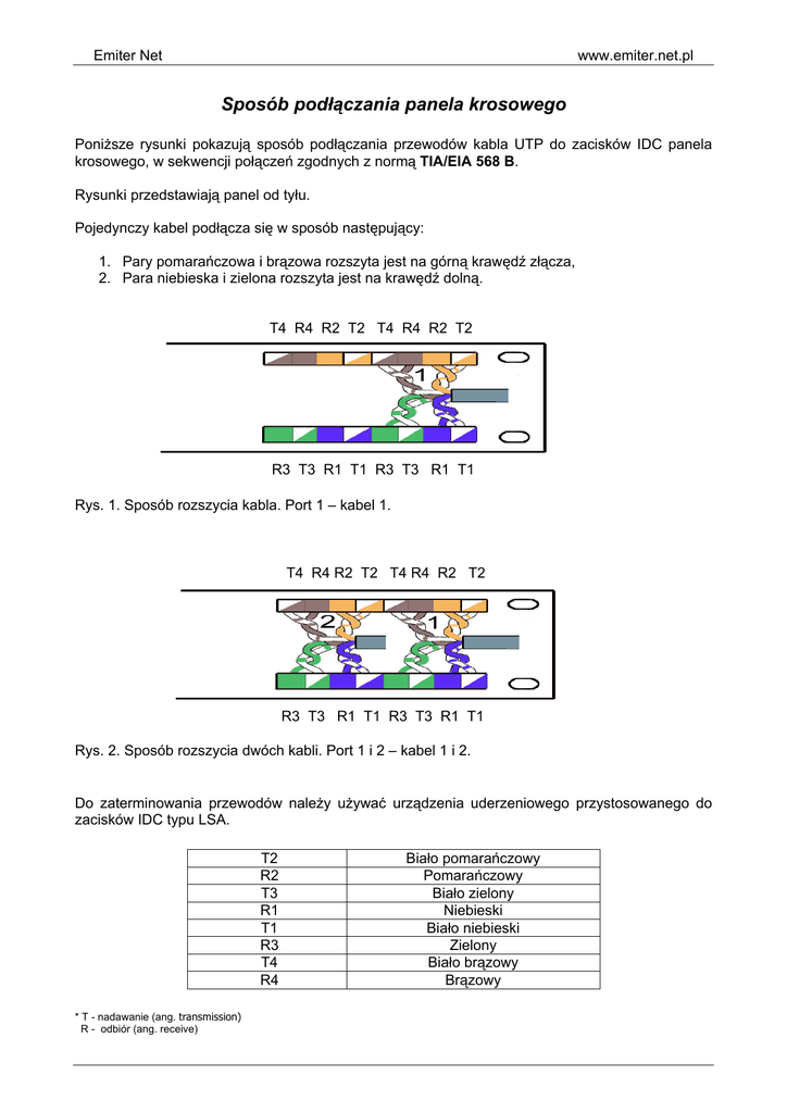 Emiter Net www.emiter.net.pl Sposób podłączania panela krosowego Poniższe rysunki pokazują sposób podłączania przewodów kabla UTP do zacisków IDC panela krosowego, w sekwencji połączeń zgodnych z normą TIA/EIA 568 B. Rysunki przedstawiają panel od tyłu. Pojedynczy kabel podłącza się w sposób następujący: 1. Pary pomarańczowa i brązowa rozszyta jest na górną krawędź złącza, 2. Para niebieska i zielona rozszyta jest na krawędź dolną. T4 R4 R2 T2 T4 R4 R2 T2 R3 T3 R1 T1 R3 T3 R1 T1 Rys. 1. Sposób rozszycia kabla. Port 1 – kabel 1. T4 R4 R2 T2 T4 R4 R2 T2 R3 T3 R1 T1 R3 T3 R1 T1 Rys. 2. Sposób rozszycia dwóch kabli. Port 1 i 2 – kabel 1 i 2. Do zaterminowania przewodów należy używać urządzenia uderzeniowego przystosowanego do zacisków IDC typu LSA. T2 R2 T3 R1 T1 R3 T4 R4 * T - nadawanie (ang. transmission) R - odbiór (ang. receive) Biało pomarańczowy Pomarańczowy Biało zielony Niebieski Biało niebieski Zielony Biało brązowy Brązowy