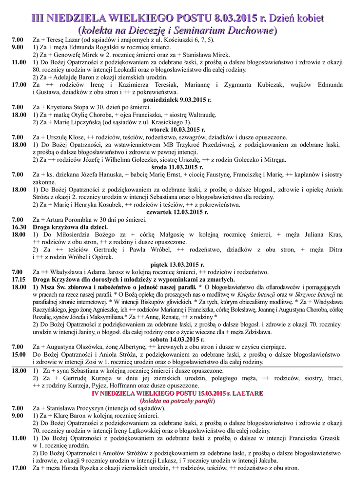 7.00 9.00 11.00 17.00 7.00 18.00 7.00 18.00 7.00 18.00 7.00 16.30 18.00 7.00 17.15 18.00 7.00 15.00 18.00 7.00 9.00 11.00 17.00 III NIEDZIELA WIELKIEGO POSTU 8.03.2015 r. Dzień kobiet (kolekta na Diecezję i Seminarium Duchowne) Za + Teresę Lazar (od sąsiadów i znajomych z ul. Kościuszki 6, 7, 5). 1) Za + męża Edmunda Rogalski w rocznicę śmierci. 2) Za + Genowefę Mirek w 2. rocznicę śmierci oraz za + Stanisława Mirek. 1) Do Bożej Opatrzności z podziękowaniem za odebrane łaski, z prośbą o dalsze błogosławieństwo i zdrowie z okazji 80. rocznicy urodzin w intencji Leokadii oraz o błogosławieństwo dla całej rodziny. 2) Za + Adelajdę Baron z okazji ziemskich urodzin. Za ++ rodziców Irenę i Kazimierza Teresiak, Mariannę i Zygmunta Kubiczak, wujków Edmunda i Gustawa, dziadków z obu stron i ++ z pokrewieństwa. poniedziałek 9.03.2015 r. Za + Krystiana Stopa w 30. dzień po śmierci. 1) Za + matkę Otylię Choroba, + ojca Franciszka, + siostrę Waltraudę. 2) Za + Marię Lipczyńską (od sąsiadów z ul. Krasickiego 3). wtorek 10.03.2015 r. Za + Urszulę Klose, ++ rodziców, teściów, rodzeństwo, szwagrów, dziadków i dusze opuszczone. 1) Do Bożej Opatrzności, za wstawiennictwem MB Trzykroć Przedziwnej, z podziękowaniem za odebrane łaski, z prośbą o dalsze błogosławieństwo i zdrowie w pewnej intencji. 2) Za ++ rodziców Józefę i Wilhelma Goleczko, siostrę Urszulę, ++ z rodzin Goleczko i Mitręga. środa 11.03.2015 r. Za + ks. dziekana Józefa Hanuska, + babcię Marię Ernst, + ciocię Faustynę, Franciszkę i Marię, ++ kapłanów i siostry zakonne. 1) Do Bożej Opatrzności z podziękowaniem za odebrane łaski, z prośbą o dalsze błogosł., zdrowie i opiekę Anioła Stróża z okazji 2. rocznicy urodzin w intencji Sebastiana oraz o błogosławieństwo dla rodziny. 2) Za + Marię i Henryka Kosubek, ++ rodziców i teściów, ++ z pokrewieństwa. czwartek 12.03.2015 r. Za + Artura Porombka w 30 dni po śmierci. Droga krzyżowa dla dzieci. 1) Do Miłosierdzia Bożego za + córkę Małgosię w kolejną rocznicę śmierci, + męża Juliana Kras, ++ rodziców z obu stron, ++ z rodziny i dusze opuszczone. 2) Za ++ teściów Gertrudę i Pawła Wróbel, ++ rodzeństwo, dziadków z obu stron, + męża Ditra i ++ z rodzin Wróbel i Ogórek. piątek 13.03.2015 r. Za ++ Władysława i Adama Jarosz w kolejną rocznicę śmierci, ++ rodziców i rodzeństwo. Droga Krzyżowa dla dorosłych i młodzieży z wypominkami za zmarłych. 1) Msza Św. zbiorowa i nabożeństwo o jedność naszej parafii. * O błogosławieństwo dla ofiarodawców i pomagających w pracach na rzecz naszej parafii. * O Bożą opiekę dla proszących nas o modlitwę w Księdze Intencji oraz w Skrzynce Intencji na parafialnej stronie internetowej. * W intencji Biskupów gliwickich. * Za tych, którym obiecaliśmy modlitwę. * Za + Władysława Raczyńskiego, jego żonę Agnieszkę, ich ++ rodziców Mariannę i Franciszka, córkę Bolesławę, Joannę i Augustyna Choroba, córkę Rozalię, synów Józefa i Maksymiliana.* Za ++ Annę, Renatę, ++ z rodziny * 2) Do Bożej Opatrzności z podziękowaniem za odebrane łaski, z prośbą o dalsze błogosł. i zdrowie z okazji 70. rocznicy urodzin w intencji Janiny, o błogosł. dla całej rodziny oraz o życie wieczne dla + męża Zdzisława. sobota 14.03.2015 r. Za + Augustyna Olszówka, żonę Albertynę, ++ krewnych z obu stron i dusze w czyścu cierpiące. Do Bożej Opatrzności i Anioła Stróża, z podziękowaniem za odebrane łaski, z prośbą o dalsze błogosławieństwo i zdrowie w intencji Zosi w 1. rocznicę urodzin oraz o błogosławieństwo dla całej rodziny. 1) Za + syna Sebastiana w kolejną rocznicę śmierci i dusze opuszczone. 2) Za + Gertrudę Kurzeja w dniu jej ziemskich urodzin, poległego męża, ++ rodziców, siostry, braci, ++ z rodziny Kurzeja, Pyjcz, Hoffmann oraz dusze opuszczone. IV NIEDZIELA WIELKIEGO POSTU 15.03.2015 r. LAETARE (kolekta na potrzeby parafii) parafii) Za + Stanisława Procyszyn (intencja od sąsiadów). 1) Za + Klarę Baron w kolejną rocznicę śmierci. 2) Do Bożej Opatrzności z podziękowaniem za odebrane łaski, z prośbą o dalsze błogosławieństwo i zdrowie z okazji 70. rocznicy urodzin w intencji Ireny Łątkowskiej oraz o błogosławieństwo dla całej rodziny. 1) Do Bożej Opatrzności z podziękowaniem za odebrane łaski z prośbą o dalsze w intencji Franciszka Grzesik w 1. rocznicę urodzin. 2) Do Bożej Opatrzności i Aniołów Stróżów z podziękowaniem za odebrane łaski, z prośbą o dalsze błogosławieństwo i zdrowie, z okazji 9 rocznicy urodzin w intencji Łukasz, i 7 rocznicy urodzin w intencji Jakuba. Za + męża Horsta Ryszka z okazji ziemskich urodzin, ++ rodziców, teściów, ++ rodzeństwo z obu stron.
