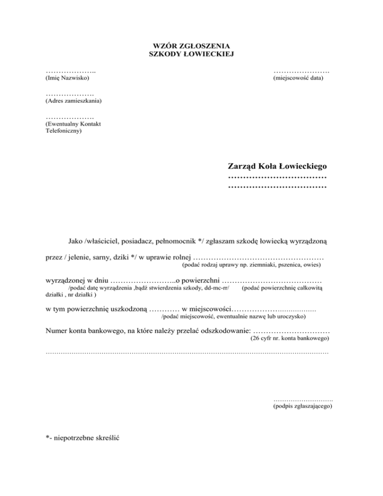 WZÓR ZGŁOSZENIA SZKODY ŁOWIECKIEJ ……………….. …………………. (Imię Nazwisko) (miejscowość data) ………………. (Adres zamieszkania) ………………. (Ewentualny Kontakt Telefoniczny) Zarząd Koła Łowieckiego …………………………… …………………………… Jako /właściciel, posiadacz, pełnomocnik */ zgłaszam szkodę łowiecką wyrządzoną przez / jelenie, sarny, dziki */ w uprawie rolnej …………………………………………… (podać rodzaj uprawy np. ziemniaki, pszenica, owies) wyrządzonej w dniu ……………………..o powierzchni ………………………………… /podać datę wyrządzenia ,bądź stwierdzenia szkody, dd-mc-rr/ działki , nr działki ) (podać powierzchnię całkowitą w tym powierzchnię uszkodzoną ………… w miejscowości……………………………… /podać miejscowość, ewentualnie nazwę lub uroczysko) Numer konta bankowego, na które należy przelać odszkodowanie: ………………………… (26 cyfr nr. konta bankowego) …………………………………………………………………………………………………………………… ………………………. (podpis zgłaszającego) *- niepotrzebne skreślić
