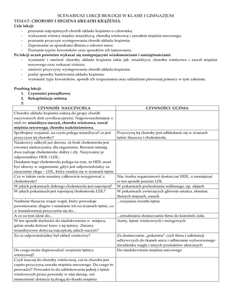 SCENARIUSZ LEKCJI BIOLOGII W KLASIE I GIMNAZJUM TEMAT: CHOROBY I HIGIENA UKŁADU KRĄŻENIA. Cele lekcji: - poznanie najczęstszych chorób układu krążenia u człowieka; - wykazanie różnicy między miażdżycą, chorobą wieńcową i zawałem mięśnia sercowego; - poznanie przyczyn występowania chorób układu krążenia; - Zapoznanie ze sposobami dbania o zdrowe serce; - Poznanie typów krwotoków oraz sposobów ich tamowania; Po lekcji uczeń powinien wykazać się następującymi wiadomościami i umiejętnościami: - wymienić i omówić choroby układu krążenia takie jak: miażdżyca, choroba wieńcowa i zawał mięśnia sercowego oraz wskazać różnice; - omówić przyczyny występowania chorób układu krążenia; - podać sposoby hartowania układu krążenia; - wymienić typy krwotoków, sposób ich rozpoznania oraz udzielanie pierwszej pomocy w tym zakresie; Przebieg lekcji: 1. Czynności porządkowe; 2. Rekapitulacja wtórna; 3. CZYNNOŚI NAUCZYCIELA Choroby układu krążenia należą do grupy chorób nazywanych dziś cywilizacyjnymi. Najpowszechniejsze z nich to: miażdżyca naczyń, choroba wieńcowa, zawał mięśnia sercowego, choroba nadciśnieniowa. Spróbujmy wyjaśnić, na czym polega miażdżyca? co jest przyczyna tej choroby? Naukowcy odkryli już dawno, że brak cholesterolu jest również niekorzystny dla organizmu. Bowiem istnieją dwa rodzaje cholesterolu: dobry i zły. Nazywamy je odpowiednio: HDL i LDL; Działanie tego cholesterolu polega na tym, że HDL musi być obecny w organizmie, gdyż jest odpowiedzialny za niszczenie złego – LDL, który osadza się w ścianach tętnic Czy w takim razie musimy całkowicie rezygnować z cholesterolu? W jakich pokarmach dobrego cholesterolu jest najwięcej? W jakich pokarmach jest najwięcej cholesterolu LDL? CZYNNOŚCI UCZNIA Przyczyną tej choroby jest odkładanie się w ścianach tętnic tłuszczu i cholesterolu Nie, trzeba organizmowi dostarczać HDL, a zmniejszać w ten sposób poziom LDL W pokarmach pochodzenia roślinnego, np. olejach W pokarmach zwierzęcych głównie smalcu, słoninie, tłustych mięsach, sosach ...zwężania światła tętnic Nadmiar tłuszczu wiąże wapń, który powoduje powstawanie złogów i osiadanie ich na ścianach tętnic, co w konsekwencji przyczynia się do... A co za tym idzie do... ...utrudniania dostarczania tlenu do komórek ciała. W ten sposób dochodzi do niedokrwienia w miejscu, Aorty, tętnic wieńcowych i mózgowych gdzie miała dotrzeć krew z tej tętnicy. Zmiany miażdżycowe dotyczą najczęściej, jakich naczyń? Za co odpowiedzialny był układ wieńcowy? Za dostarczanie „pokarmu” czyli tlenu i substancji odżywczych do tkanek serca i odbieranie wytworzonego dwutlenku węgla i innych produktów ubocznych Do czego może doprowadzić zwężenie tętnicy Do niedokrwienie mięśnia sercowego wieńcowej? Czyli inaczej do choroby wieńcowej, zaś ta choroba jest często przyczyną zawału mięśnia sercowego. Do czego to prowadzi? Prowadzi to do zablokowania jednej z tętnic wieńcowych przez powstały w niej skrzep, zaś niemożność dotarcia tą drogą do tkanki mięśnia sercowego tlenu powoduje martwicę tej tkanki, czyli zniszczenie tego obszaru serca, który niestety nie ma możliwości odbudowania się na nowo. Natomiast gdyby zablokowaniu uległa tętnica doprowadzająca krew do komórek mózgu dochodzi do uszkodzenia komórek mózgu. Choroba ta to ... Na czym więc polega różnica między miażdżycą, zawałem mięśnia sercowego i choroba wieńcową? Jakie są dwie główne przyczyny występowania chorób serca? Na podstawie przyczyn chorób układu krążenia wypisanych w waszych podręcznikach/str. 64/ Ułóżcie Przykazania jak zachować zdrowe serce i być szczęśliwym/praca w grupach 4 osobowych/ Wpiszcie do karty pracy w punkcie 1. Kontrola pracy. Co to jest krwotok? kiedy mamy z nim do czynienia? W jaki sposób może dojść do wystąpienia krwotoków? Jakie można wyróżnić krwotoki? Jakie jeszcze? Które z tych krwotoków są bardziej niebezpieczne? Wyróżniamy jeszcze krwotoki miąższowe, dotyczą one uszkodzenia naczyń włosowatych – np. sińce W jaki sposób udzielać pierwszej pomocy? Jak się zachowasz gdy kolega dozna urazu i wystąpi krwotok z nosa? W jaki sposób pomożesz młodszemu koledze, który upadł na boisku szkolnym i otarł sobie skórę na kolanie? Na co należy zwrócić jeszcze uwagę w trakcie udzielania pierwszej pomocy? Dlaczego w apteczkach pierwszej pomocy znajdują się rękawiczki ochronne? 4. 5. ...Udar mózgu Miażdżyca dotyczy blokowania przez tłuszcz i cholesterol drożności tętnic; choroba wieńcowa polega na tym, że skrzep pojawia się w tętnicach wieńcowych odpowiedzialnych za dostarczanie mięśniowi sercowemu tlenu i składników odżywczych, co w konsekwencji doprowadza do martwicy tkanek mięśnia sercowego - siedzący tryb życia, nieregularne spożywanie posiłków, spożywanie głównie pokarmów zawierających tłuszcze, brak ćwiczeń fizycznych... 1. Spożywaj jak najwięcej produktów pochodzenia roślinnego; 2. Ograniczaj spożywanie tłuszczów zwierzęcych; 3. Zażywaj ruchu- zastąp godzinę przed telewizorem – spacerem lub wyjściem na basen; 4. Zrezygnuj z palenia tytoniu; 5. Nie nadużywaj alkoholu; 6. Badaj się regularnie – sprawdzaj ciśnienie; 7. Bądź optymistą – nie daj się stresom; Krwotok to wydostanie się krwi z naczyń krwionośnych lub poza serce wskutek przerwania ścian. Może powstać wskutek urazu, pęknięcia zmienionego chorobowo naczynia Żylne – jeśli krew jest ciemniejsza, płynie wolno jednostajnie; Tętnicze – wtedy krew jest jasna, wypływa pulsując; Tętnicze ponieważ istnieje niebezpieczeństwo dużej utraty krwi czyli życie jest najbardziej zagrożone Jeśli mamy do czynienia z krwotokiem tętniczym to uciskamy miejsce powyżej uszkodzenia by zatrzymać wypływ krwi, natomiast w przypadku krwotoku żylnego tamowanie krwotoku w m