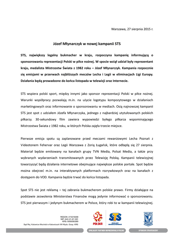 Warszawa, 27 sierpnia 2015 r. Józef Młynarczyk w nowej kampanii STS STS, największy legalny bukmacher w kraju, rozpoczyna kampanię informującą o sponsorowaniu reprezentacji Polski w piłce nożnej. W spocie wziął udział były reprezentant kraju, medalista Mistrzostw Świata z 1982 roku – Józef Młynarczyk. Kampania rozpocznie się emisjami w przerwach najbliższych meczów Lecha i Legii w eliminacjach Ligi Europy. Działania będą prowadzone do kooca listopada w telewizji oraz Internecie. STS wspiera polski sport, między innymi jako sponsor reprezentacji Polski w piłce nożnej. Warunki współpracy pozwalają m.in. na użycie logotypu kompozytowego w działaniach marketingowych oraz informowanie o sponsorowaniu w mediach. Osią najnowszej kampanii STS jest spot z udziałem Józefa Młynarczyka, jednego z najbardziej utytułowanych polskich piłkarzy. 30-sekundowy film zawiera wypowiedzi byłego piłkarza wspominającego Mistrzostwa Świata z 1982 roku, w których Polska zajęła trzecie miejsce. Pierwsze emisja spotu są zaplanowane przed meczami rewanżowymi Lecha Poznao z Videotonem Fehervar oraz Legii Warszawa z Zorią Ługaosk, które odbędą się 27 sierpnia. Materiał będzie emitowany na kanałach grupy TVN Media, Polsat Media, a także przy wybranych wydarzeniach transmitowanych przez Telewizję Polską. Kampanii telewizyjnej towarzyszyd będą działania internetowe obejmujące największe polskie portale. Spot będzie można obejrzed m.in. na interaktywnych platformach rozrywkowych oraz na kanałach z dostępem do VOD. Kampania będzie trwad do kooca listopada. Spot STS nie jest reklamą – tej zabrania bukmacherom polskie prawo. Firmy działające na podstawie zezwolenia Ministerstwa Finansów mogą jedynie informowad o sponsorowaniu. STS jest pierwszym i jedynym bukmacherem w Polsce, który robi to w kampanii telewizyjnej. To trzecia kampania informacyjna STS prowadzona z wykorzystaniem telewizji. Pierwsza, z udziałem byłego reprezentanta – Piotra Reissa, dotyczyła sponsoringu strategicznego drużyny KKS Lech Poznao. Druga natomiast skupiała się na współpracy z reprezentacją Polski, której STS również jest sponsorem. Zakaz reklamy jest tylko jednym z wielu ograniczeo, jakie dotyka legalnie działające firmy w Polsce. Prowadzi to do sytuacji, w której około 90% rynku należy do firm oferujących zakłady bez zezwoleo. W wyniku braku skutecznej kontroli nielegalnych operatorów, budżet kraju traci na tym rocznie ok. 200 mln złotych – dodał Mateusz Juroszek. Za planowanie i zakup mediów odpowiada dom mediowy Blueway Com. Spot przygotowała agencja Lunar Six. Więcej informacji: Paweł Rabantek Doradca zarządu ds. PR (+48) 603 870 044 [email protected]