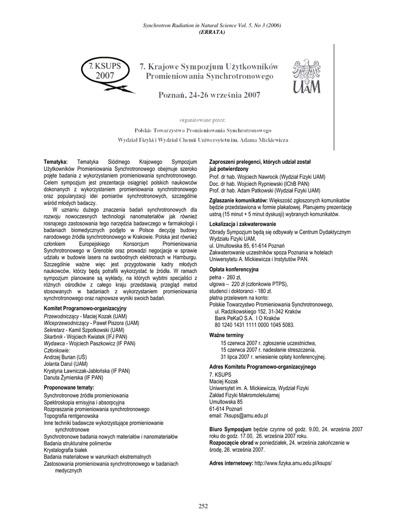 Synchrotron Radiation in Natural Science Vol. 5, No 3 (2006) (ERRATA) Tematyka: Tematyka Siódmego Krajowego Sympozjum Użytkowników Promieniowania Synchrotronowego obejmuje szeroko pojęte badania z wykorzystaniem promieniowania synchrotronowego. Celem sympozjum jest prezentacja osiągnięć polskich naukowców dokonanych z wykorzystaniem promieniowania synchrotronowego oraz popularyzacji idei pomiarów synchrotronowych, szczególnie wśród młodych badaczy. W uznaniu dużego znaczenia badań synchrotronowych dla rozwoju nowoczesnych technologii nanomateriałów jak również rosnącego zastosowania tego narzędzia badawczego w farmakologii i badaniach biomedycznych podjęto w Polsce decyzję budowy narodowego źródła synchrotronowego w Krakowie. Polska jest również członkiem Europejskiego Konsorcjum Promieniowania Synchrotronowego w Grenoble oraz prowadzi negocjacje w sprawie udziału w budowie lasera na swobodnych elektronach w Hamburgu. Szczególnie ważne więc jest przygotowanie kadry młodych naukowców, którzy będą potrafili wykorzystać te źródła. W ramach sympozjum planowane są wykłady, na których wybitni specjaliści z różnych ośrodków z całego kraju przedstawią przegląd metod stosowanych w badaniach z wykorzystaniem promieniowania synchrotronowego oraz najnowsze wyniki swoich badań. Zaproszeni prelegenci, których udział został już potwierdzony Prof. dr hab. Wojciech Nawrocik (Wydział Fizyki UAM) Doc. dr hab. Wojciech Rypniewski (IChB PAN) Prof. dr hab. Adam Patkowski (Wydział Fizyki UAM) Zgłaszanie komunikatów: Większość zgłoszonych komunikatów będzie przedstawiona w formie plakatowej. Planujemy prezentację ustną (15 minut + 5 minut dyskusji) wybranych komunikatów. Lokalizacja i zakwaterowanie Obrady Sympozjum będą się odbywały w Centrum Dydaktycznym Wydziału Fizyki UAM, ul. Umultowska 85, 61-614 Poznań Zakwaterowanie uczestników spoza Poznania w hotelach Uniwersytetu A. Mickiewicza i Instytutów PAN. Opłata konferencyjna pełna - 260 zł, ulgowa – 220 zł (członkowie PTPS), studenci i doktoranci - 180 zł. płatna przelewem na konto: Polskie Towarzystwo Promieniowania Synchrotronowego, ul. Radzikowskiego 152, 31-342 Kraków Bank PeKaO S.A. I O Kraków 80 1240 1431 1111 0000 1045 5083. Komitet Programowo-organizacyjny Przewodniczący - Maciej Kozak (UAM) Wiceprzewodniczący - Paweł Piszora (UAM) Sekretarz - Kamil Szpotkowski (UAM) Skarbnik - Wojciech Kwiatek (IFJ PAN) Wydawca - Wojciech Paszkowicz (IF PAN) Członkowie: Andrzej Burian (UŚ) Jolanta Darul (UAM) Krystyna Ławniczak-Jabłońska (IF PAN) Danuta Żymierska (IF PAN) Ważne terminy 15 czerwca 2007 r. zgłoszenie uczestnictwa, 15 czerwca 2007 r. nadesłanie streszczenia, 31 lipca 2007 r. wniesienie opłaty konferencyjnej. Adres Komitetu Programowo-organizacyjnego 7. KSUPS Maciej Kozak Uniwersytet im. A. Mickiewicza, Wydział Fizyki Zakład Fizyki Makromolekularnej Umultowska 85 61-614 Poznań email: [email protected] Proponowane tematy: Synchrotronowe źródła promieniowania Spektroskopia emisyjna i absorpcyjna Rozpraszanie promieniowania synchrotronowego Topografia rentgenowska Inne techniki badawcze wykorzystujące promieniowanie synchrotronowe Synchrotronowe badania nowych materiałów i nanomateriałów Badania strukturalne polimerów Krystalografia białek Badania materiałowe w warunkach ekstremalnych Zastosowania promieniowania synchrotronowego w badaniach medycznych Biuro Sympozjum będzie czynne od godz. 9.00, 24. września 2007 roku do godz. 17.00, 26. września 2007 roku. Rozpoczęcie obrad w poniedziałek, 24. września zakończenie w środę, 26. września 2007. Adres internetowy: http://www.fizyka.amu.edu.pl/ksups/ 252