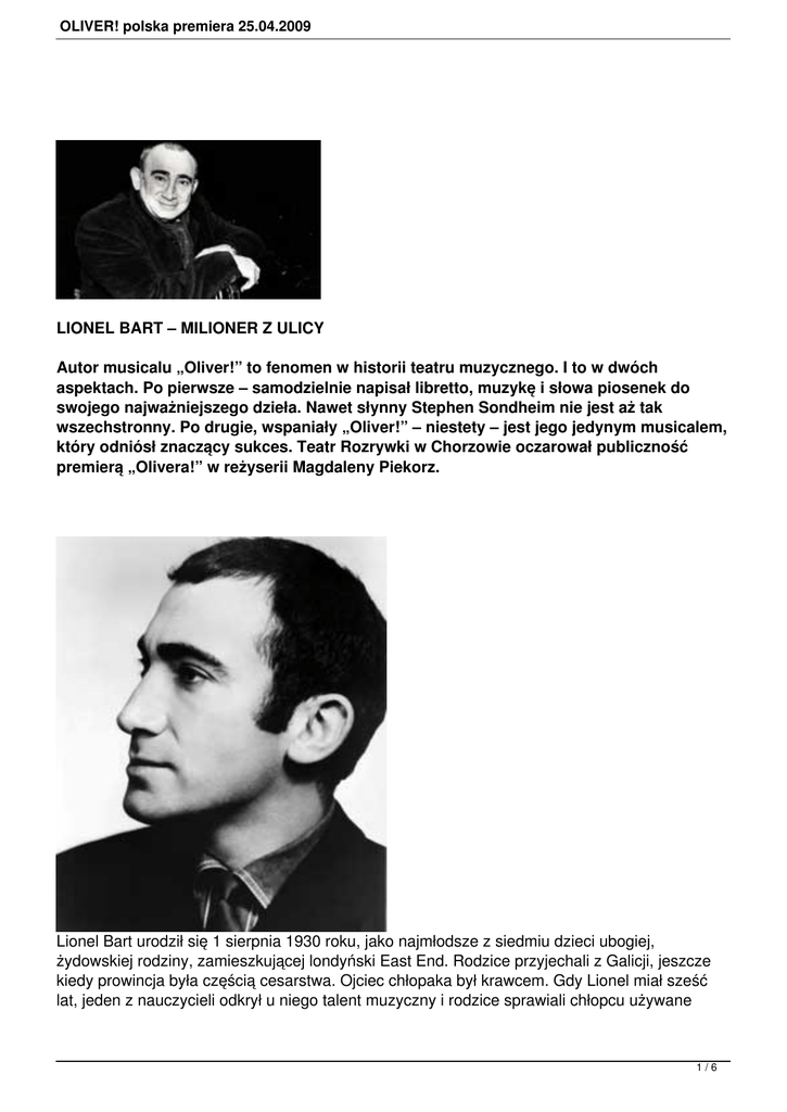 OLIVER! polska premiera 25.04.2009 LIONEL BART – MILIONER Z ULICY Autor musicalu „Oliver!” to fenomen w historii teatru muzycznego. I to w dwóch aspektach. Po pierwsze – samodzielnie napisał libretto, muzykę i słowa piosenek do swojego najważniejszego dzieła. Nawet słynny Stephen Sondheim nie jest aż tak wszechstronny. Po drugie, wspaniały „Oliver!” – niestety – jest jego jedynym musicalem, który odniósł znaczący sukces. Teatr Rozrywki w Chorzowie oczarował publiczność premierą „Olivera!” w reżyserii Magdaleny Piekorz. Lionel Bart urodził się 1 sierpnia 1930 roku, jako najmłodsze z siedmiu dzieci ubogiej, żydowskiej rodziny, zamieszkującej londyński East End. Rodzice przyjechali z Galicji, jeszcze kiedy prowincja była częścią cesarstwa. Ojciec chłopaka był krawcem. Gdy Lionel miał sześć lat, jeden z nauczycieli odkrył u niego talent muzyczny i rodzice sprawiali chłopcu używane 1/6 OLIVER! polska premiera 25.04.2009 skrzypce. Ale regularne ćwiczenia nie leżały w charakterze syna, który od najmłodszych lat był bardzo ruchliwy, niezależny, samodzielny. W wieku 16 lat Lionel Bart zdobył stypendium do szkoły plastycznej, ale szybko został z niej usunięty. Za złe zachowanie. Pracował później dorywczo w pracowniach graficznych, zajmując się sitodrukiem. Kiedy on sam odkrył w sobie prawdziwą pasję, okazało się nią pisanie piosenek. Przybrał wtedy pseudonim. Naprawdę nazywał się Lionel Begleiter, ale regularnie mijając autobusem szpital Świętego Bartłomieja – popularnie zwany w skrócie „Barts” – zmienił nazwisko na Lionel Bart. Na samym progu kariery autorskiej. Zaczynał od pisania satyrycznych piosenek dla niedzielnego programu radia BBC „The Billy Cotton Band Show”. Po niedługim czasie pisał dla teatru, związany przez kilka lat z ważną londyńską sceną, The Unity Theatre. Największe sukcesy przed powstaniem musicalu „Oliver!” odniósł Lionel Bart na gruncie muzyki popularnej, pisząc piosenki dla ulubionych wykonawców tamtych lat. Zaczęło się od singla „Living Doll” – wielkiego przeboju Cliffa Richarda i zespołu The Shadows (wtedy jeszcze występujących pod nazwą The Drifters). Piosenka weszła na szczyt brytyjskiej listy przebojów w czerwcu w 1959 roku, rozpoczynając imponującą listę 14 hitów numer jeden w karierze tego piosenkarza (jedynie Elvis Presley zajął więcej czasu na brytyjskich listach – Cliff Richard bije Beatlesów, zespół Queen i Madonnę). Sprzedaż ponad miliona egzemplarzy małej płyty zapewniła młodemu autorowi fortunę – Lionel Bart stał się zamożnym człowiekiem z dnia na dzień. Do dalszych sukcesów Lionela Barta na tym polu można zaliczyć napisanie tytułowej piosenki do drugiego filmu z cyklu przygód Jamesa Bonda, „From Russia With Love” („Pozdrowienia z Rosji”, 1963) – śpiewał ją Matt Monro. Inne późniejsze hity to m.in. „Do You Mind?” (duetu Anthony Newley i Andy Williams), „Easy Going Me” (Adam Faith) oraz „Always You And Me” (Russ Conway). O przebojowości jego materiału świadczy fakt, że utwór „Living Doll” wrócił na szczyt listy z nowym tekstem Lionela Barta w 1986 roku w wykonaniu Cliffa Richarda i trupy komediowej The Young Ones. Jego wielkim odkryciem był też bezpośredni rywal Cliffa Richarda, promowany jako „brytyjski Elvis” piosenkarz Tommy Steel. To dla niego pisał serię przebojów już od 1956 roku, m.in. „Rock With The Caveman”, „Butterfingers” i „Little White Bull”. To podobno Lionel Bart pierwszy usłyszał nieznanego chłopaka śpiewającego w pubie i umożliwił mu podpisanie kontraktu płytowego, zarażając swoim entuzjazmem szefów wytwórni płytowej Decca. Tylko w latach 1957-1960 Lionel Bart zdobył dziewięć Ivor Novello Awards – bardzo prestiżowych nagród brytyjskiego showbiznesu dla autorów piosenek. W roku 1960 Lionel Bart otrzymał „Srebrne serce” Variety Club jako „Osobowość roku” w brytyjskim przemyśle rozrywkowym. Był na samym szczycie. Ukoronowaniem owej imponującej kariery było stworzenie musicalu według powieści najważniejszego brytyjskiego pisarza XIX wieku. To Charles Dickens pierwszy pokazał Anglikom, jak bardzo niesprawiedliwy jest świat, w którym żyją. Sukces jego „Oliwera Twista” był także sukcesem posłannictwa autora – wyprzedzająca epokę świadomość społeczna pisarza kazała mu piętnować katastrofalne warunki życia nędzarzy (a także prawo, które regulowało stosunek państwa do biednych) oraz stosowanie dziecięcej siły roboczej (przypadki 2/6 OLIVER! polska premiera 25.04.2009 śmierci „kominiarczyków” w przewodach kominowych były nagminne). Lionel Bart – autor libretta – dokonał mistrzowskiej adaptacji dzieła. Z obszernej, wielowątkowej powieści wybrał wątki najistotniejsze (a także najbardziej „teatralne”), nakreślił czytelne relacje między głównymi postaciami i odmalował losy tytułowego bohatera, dając ma szansę na rozwój i odkrywanie świata. Podchodząc z szacunkiem do powieściowego oryginału Lionel Bart pozostawił wiele z książkowych dialogów. Napisał piosenki, które nie tylko komentują akcję, ale stają się okazją do zaprezentowania postaci. Całość wzbogacił o muzykę tak przebojową, że musical „Oliver!” nie ma równych w zakresie liczby wpadających w ucho „evergreenów”. Musical miał premierę na scenie New Theatre (przemianowanym później na The Albery Theatre) 30 czerwca 1960 i po zapadnięciu kurtyny artyści wychodzili 23 razy pokłonić się przed oszalałą z zachwytu publicznością. Pierwszą inscenizację „Olivera!” pokazano w Londynie 2618 razy. Po amerykańskiej premierze, 6 stycznia 1963 roku, wystawiono go na Broadwayu 774 razy, ale po latach miał tam wracać wielokrotnie. Był to zarazem pierwszy musical z West Endu, który podbił Broadway – prekursorski w tendencji, która sprawiła, 
