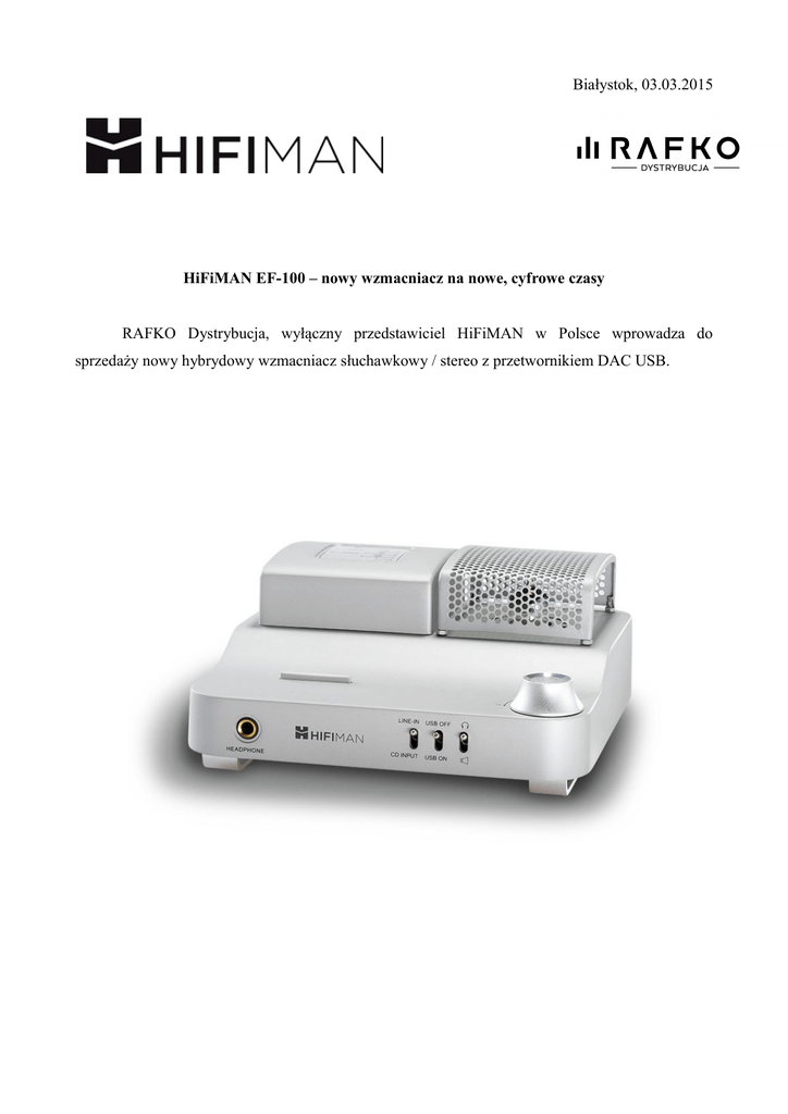 Białystok, 03.03.2015 HiFiMAN EF-100 – nowy wzmacniacz na nowe, cyfrowe czasy RAFKO Dystrybucja, wyłączny przedstawiciel HiFiMAN w Polsce wprowadza do sprzedaży nowy hybrydowy wzmacniacz słuchawkowy / stereo z przetwornikiem DAC USB. Najważniejsze cechy: EF100 to wzmacniacz hybrydowy nowej generacji, który łączy w sobie: sekcję przedwzmacniacza opartą o lampę elektronową wzmacniacz słuchawkowy w klasie AB o mocy 2W RMS końcówkę mocy stereo w klasie T o mocy 4.5W RMS potencjometr oparty o drabinkę rezystorową 24-bitowy przetwornik DAC Całość zamknięto w zgrabnej, giętej kompaktowej obudowie wykonanej ze stopu aluminium. Obudowę wykończono wysokiej klasy malowaniem proszkowym. Obsługa wzmacniacza odbywa się za pomocą niezawodnych i stylowych przełączników hebelkowych. Gałka potencjometru została wykonana z aluminium. Zastosowanie przedwzmacniacza opartego o lampę pozwoliło na uzyskanie łagodnego, ciepłego, gładkiego, a jednocześnie detalicznego brzmienia. Muzykalność w połączeniu z mocą zdolną wysterować nawet najtrudniejsze słuchawki to od zawsze znak rozpoznawczy wszystkich wzmacniaczy słuchawkowych HiFiMAN. Ponadto EF100 został wzbogacony o nową funkcję możliwość wysterowania niewielkich monitorów biurkowych. Dzięki wejściu USB EF100 to znakomity partner dla każdego melomana słuchającego z rozmaitych źródeł opartych o komputer. Cena: 2290zł, dostępny kolor: srebrny matowy O marce HiFiMAN: HiFiMan to legendarna na terenie USA audiofilska marka, której właścicielem jest przedsiębiorstwo Head Direct z siedzibą w Nowym Jorku. Od kilku lat firma sukcesywnie wprowadza na rynek i popularyzuje alternatywny typ słuchawek określanych jako ortodynamiczne lub planarne. Jednym z pierwszych produktów jaki powstał w HiFiManie jest bez wątpienia najlepszy na świecie przenośny odtwarzacz audiofilski – HiFiMan HM-801. Produkt, który dał firmie międzynarodową sławę oraz bardzo mocną pozycję na amerykańskim rynku audiofilskim. Jakość marki HiFiMan: HiFiMan słynie z tego, że prototypy najwyższych modeli słuchawek dopracowuje przy udziale swoich potencjalnych Klientów. Normą stała się sytuacja, w której inżynierowie HiFiMana doszlifowują brzmienie swoich słuchawek w porozumieniu z użytkownikami audiofilskich for internetowych. Każdy nowy przetwornik od HiFiMana przechodzi aż roczny okres testowy. W efekcie tak nowatorskiej współpracy i zaufania w stosunku do swoich Klientów produkty HiFiMana uchodzą za niezwykle uniwersalne brzmieniowo oraz bezkonkurencyjnie niezawodne. http://hifiman.pl/ http://www.rafko.com/ Dodatkowych informacji udziela: Andrzej Lemański e-mail: [email protected] tel. (85) 747 97 58 tel. kom. 607 266 622