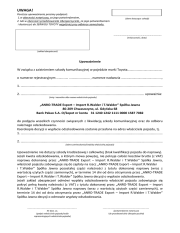 UWAGA! Poniższe upoważnienie prosimy podpisać: 1.w obecności notariusza, za jego potwierdzeniem, 2. lub w obecności przedstawiciela Ubezpieczyciela, za jego potwierdzeniem i dostarczyć do SERWISU TOYOTY najpóźniej przy odbiorze samochodu. (dane dotyczące szkody) …………………………………………………………… (miejscowość, data) (zakład ubezpieczeń) Upoważnienie W związku z zaistnieniem szkody komunikacyjnej w pojeździe marki Toyota……….......……………………. o numerze rejestracyjnym ………..… ....................… , numerze nadwozia …………………….………………....., 1. ........................................................................................................................................................... 2. ....................................................................................................................................... upoważnia: (imię i nazwisko albo nazwa właściciela pojazdu) „ANRO-TRADE Export – Import R.Walder i T.Walder” Spółka Jawna 80-209 Chwaszczyno, ul. Gdyńska 68 Bank Pekao S.A. O/Sopot nr konta 31 1240 1242 1111 0000 1587 7082 do podjęcia wszelkich czynności związanych z likwidacją szkody komunikacyjnej oraz do odbioru należnego odszkodowania. Kserokopia decyzji o wypłacie odszkodowania zostanie przesłana na adres właściciela pojazdu, tj. 1. ........................................................................................................................................................... 2. ........................................................................................................................................................... (adres zamieszkania/siedziby właściciela pojazdu) Upoważnienie nie dotyczy szkody kradzieżowej i całkowitej (brak kwalifikacji pojazdu do naprawy). Jeżeli kwota odszkodowania, o którym mowa powyżej, nie pokryje całości kosztów brutto (z VAT) naprawy dokonanej przez „ANRO-TRADE Export – Import R.Walder i T.Walder” Spółka Jawna, właściciel pojazdu zobowiązuje się do zapłaty na rzecz „ANRO-TRADE Export – Import R.Walder i T.Walder” Spółka Jawna pozostałej części należności z tytułu dokonanej naprawy (wraz z wartością użytych części zamiennych), w terminie 14 dni od dnia otrzymania przez „ANRO-TRADE Export – Import R.Walder i T.Walder” Spółka Jawna decyzji o wypłacie odszkodowania. Jeżeli zakład ubezpieczeń odmówi wypłaty odszkodowania właściciel pojazdu zobowiązuje się pokryć pełną kwotę należności (z VAT) z tytułu dokonanej przez „ANRO-TRADE Export – Import R.Walder i T.Walder” Spółka Jawna naprawy (wraz z wartością użytych części zamiennych), w terminie 14 dni od dnia otrzymania przez „ANRO-TRADE Export – Import R.Walder i T.Walder” Spółka Jawna decyzji o odmowie wypłaty odszkodowania. …………..………………………………………………………………… Nr dow. os. (podpis właściciela pojazdu/osób reprezentujących właściciela pojazdu) …………..…………………………………………………………… (potwierdzenie notariusza lub przedstawiciela Ubezpieczyciela)