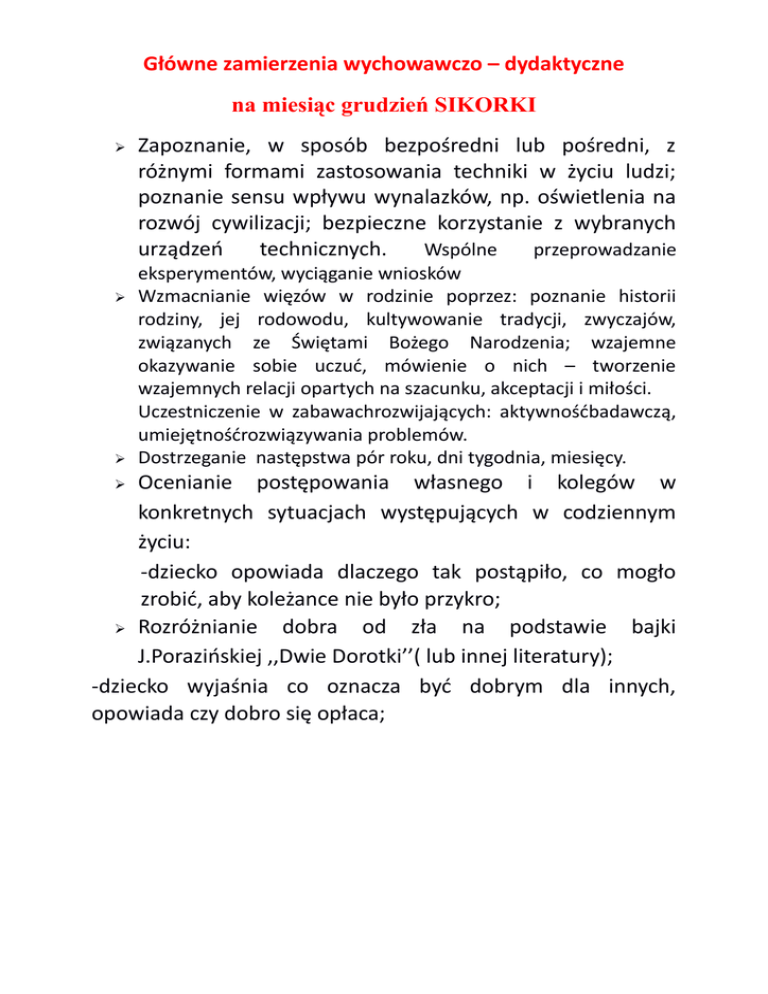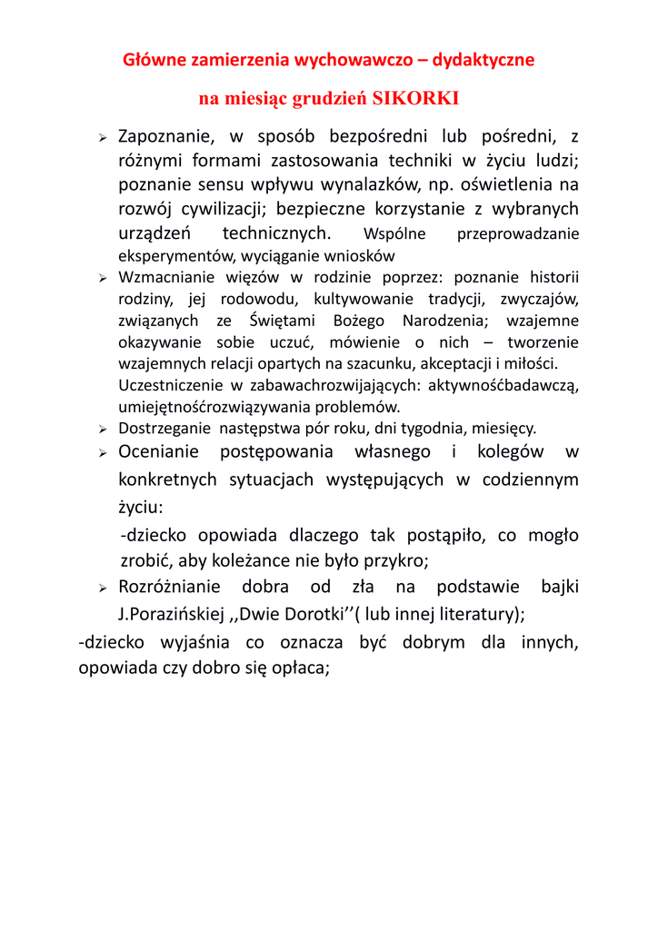 Główne zamierzenia wychowawczo – dydaktyczne na miesiąc grudzień SIKORKI Zapoznanie, w sposób bezpośredni lub pośredni, z różnymi formami zastosowania techniki w życiu ludzi; poznanie sensu wpływu wynalazków, np. oświetlenia na rozwój cywilizacji; bezpieczne korzystanie z wybranych urządzeń technicznych. Wspólne przeprowadzanie eksperymentów, wyciąganie wniosków Wzmacnianie więzów w rodzinie poprzez: poznanie historii rodziny, jej rodowodu, kultywowanie tradycji, zwyczajów, związanych ze Świętami Bożego Narodzenia; wzajemne okazywanie sobie uczuć, mówienie o nich – tworzenie wzajemnych relacji opartych na szacunku, akceptacji i miłości. Uczestniczenie w zabawachrozwijających: aktywnośćbadawczą, umiejętnośćrozwiązywania problemów. Dostrzeganie następstwa pór roku, dni tygodnia, miesięcy. Ocenianie postępowania własnego i kolegów w konkretnych sytuacjach występujących w codziennym życiu: -dziecko opowiada dlaczego tak postąpiło, co mogło zrobić, aby koleżance nie było przykro; Rozróżnianie dobra od zła na podstawie bajki J.Porazińskiej ,,Dwie Dorotki’’( lub innej literatury); -dziecko wyjaśnia co oznacza być dobrym dla innych, opowiada czy dobro się opłaca; Słówka z języka angielskiego na miesiąc grudzień I TYDZIEŃ: walk- spaceruj, run- biegać, slow- wolno, Fastszybko, hop- podskocz, stop- zatrzymaj się, jump- skacz, swimpłyń, tiptoe- stopa za stopą, steep- spać, wakeup- budzić się, time- czas, go- idź. II TYDZIEŃ: family- rodzina, member( s)- członek/ członkowie, mummy- mamusia, daddy- tatuś, sister- siostra, brother- brat, grandpa- dziadek, grandma- babcia, babyniemowlę, child- dziecko, children- dzieci, mum- mama, dadtata, mother- mama, father- tata. III TYDZIEŃ: family- rodzina, finger- palec u ręki, singśpiewać, listen- słuchać, where- gdzie, Here i am- Jestem tutaj, you- ty/wy, How do you do?- Jak się masz? IV TYDZIEŃ: Christmas- Święta Bożego Narodzenia, showman- bałwan, snow- śnieg, sledze- sanie, stockongsskarpety, chimney- kominek, Santa Claus- Święty Mikołaj, presents- prezenty, star- gwiazda, Reindeer- renifer, Winterzima, Christmastree- choinka. ULICA ŚNIEŻYNKOWA Muz.: Majka Jeżowska, sł.: Jacek Cygan Opadły płatki na pieska w łatki, czarno-biały był, teraz gdzieś się skrył, a tu sypie śnieg. I piesek znika, śnieg go połyka, oj, gdzie jest - nie wiem, to miał być prezent, ten pies pluszowy jest. I co, i co, i co? Gdzie jest ten mały pies? Ja go znaleźć muszę... Spokojnie, spokojnie, spokojnie, prezenty przecież mają duszę! Refren: Ulica Śnieżynkowa prezenty w sobie chowa, ooo, je je, ooo, je je! Ulica Śnieżynkowa zrozumie Cię bez słowa, ooo, je je, ooo, je je! Kupiłam jeża - śmiesznego zwierza, zieloniutki był, teraz gdzieś się skrył, na choince gdzieś. Jeżyka igły wśród igieł znikły, oj, gdzie jest - nie wiem, to miał być prezent, czy wiesz, gdzie jest ten jeż? I co, i co, i co? Gdzie jest ten mały pies? Ja go znaleźć muszę... Spokojnie, spokojnie, spokojnie, prezenty przecież mają duszę! Refren: Ulica Śnieżynkowa… Widziałam misia, jak płakał dzisiaj: "pójdę sobie gdzieś, dzieci nie chcą mnie, stoję w kącie sam... Do sklepu wrócę, z półki się rzucę." Nie lubi siebie nie chciany prezent, gdy dzieciom uczuć brak. I co, i co, i co? Gdzie jest ten mały miś? Ja go znaleźć muszę... Ostrożnie, ostrożnie, ostrożnie, prezenty przecież mają duszę! Refren:Ulica Śnieżynkowa … Choinka w przedszkolu Cz. Janczarski Kolorowe świeczki, kolorowy łańcuch. Wkoło choineczki przedszkolacy tańczą. Serduszko z piernika, pozłacany orzech. Ciepło jest w przedszkolu, chociaż mróz na dworze. Za oknami – wieczór, Złota gwiazdka błyska. Bawi się w przedszkolu, dziś rodzinka bliska. Dziadzio siwobrody wędruje po dworze. Niesie do przedszkola podarunki w worze.