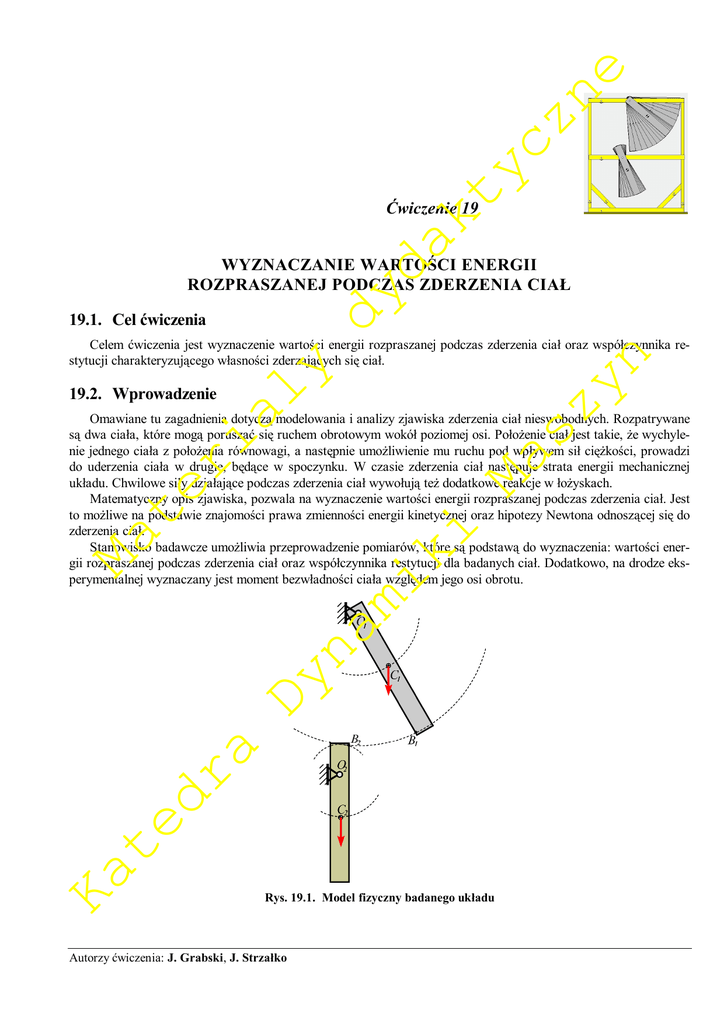 dy da kt Ma yc sz zn yn e Ćwiczenie 19 WYZNACZANIE WARTOŚCI ENERGII ROZPRASZANEJ PODCZAS ZDERZENIA CIAŁ 19.1. Cel ćwiczenia Ma te ri al y Celem ćwiczenia jest wyznaczenie wartości energii rozpraszanej podczas zderzenia ciał oraz współczynnika restytucji charakteryzującego własności zderzających się ciał. 19.2. Wprowadzenie Ka te dr a Dy na mi ki Omawiane tu zagadnienia dotyczą modelowania i analizy zjawiska zderzenia ciał nieswobodnych. Rozpatrywane są dwa ciała, które mogą poruszać się ruchem obrotowym wokół poziomej osi. Położenie ciał jest takie, że wychylenie jednego ciała z położenia równowagi, a następnie umożliwienie mu ruchu pod wpływem sił ciężkości, prowadzi do uderzenia ciała w drugie, będące w spoczynku. W czasie zderzenia ciał następuje strata energii mechanicznej układu. Chwilowe siły działające podczas zderzenia ciał wywołują też dodatkowe reakcje w łożyskach. Matematyczny opis zjawiska, pozwala na wyznaczenie wartości energii rozpraszanej podczas zderzenia ciał. Jest to możliwe na podstawie znajomości prawa zmienności energii kinetycznej oraz hipotezy Newtona odnoszącej się do zderzenia ciał. Stanowisko badawcze umożliwia przeprowadzenie pomiarów, które są podstawą do wyznaczenia: wartości energii rozpraszanej podczas zderzenia ciał oraz współczynnika restytucji dla badanych ciał. Dodatkowo, na drodze eksperymentalnej wyznaczany jest moment bezwładności ciała względem jego osi obrotu. Rys. 19.1. Model fizyczny badanego układu Autorzy ćwiczenia: J. Grabski, J. Strzałko 19.3. Teoretyczny opis zjawiska dy da kt Ma yc sz zn yn e Wyznaczanie wartości energii rozpraszanej podczas zderzenia ciał Do analizy zjawisk towarzyszących zderzeniu ciał niezbędna jest znajomość następujących zagadnień: • modelowanie zjawiska zderzenia (wykorzystujemy tu hipotezę Newtona), • prawo zmienności energii kinetycznej, • prawo zmienności pędu, • prawo zmienności krętu. Wykorzystanie prawa zmienności pędu i prawa zmienności krętu umożliwia wyznaczenie impulsów sił oddziaływania pomiędzy ciałami i impulsów reakcji łożysk. W tym ćwiczeniu impulsy reakcji nie będą rozpatrywane. 19.3.1. Modelowanie zjawiska zderzenia Ma te ri al y Przytoczymy tu niektóre pojęcia i hipotezy wykorzystywane w modelowaniu zjawiska zderzenia ciał. Normalna uderzenia jest to prosta prostopadła do płaszczyzny stycznej do ciał w punkcie, w którym następuje zderzenie. Symbolem n będzie dalej oznaczona oś o kierunku normalnej uderzenia. Zgodnie z hipotezą Newtona stosunek względnej prędkości punktów zderzających się ciał po uderzeniu do ich prędkości względnej przed uderzeniem jest wielkością stałą i charakteryzuje własności materiałów, z jakich wykonane są ciała. Przedstawia to zależność k =− v1′′n − v ′2′n , v1′n − v ′2n (19.1) Ka te dr a Dy na mi ki w której v1′′n i v 2′′n oznaczają rzuty prędkości punktów styku zderzających się ciał na oś n – tuż po zderzeniu, a v1′n i v ′2 n tuż przed zderzeniem (rys. 19.2). Tak określoną wielkość (k) nazywa się współczynnikiem restytucji. Rys. 19.2. Prędkości wybranych punktów zderzających się ciał: a) tuż przed zderzeniem, b) podczas zderzenia (zaznaczone są rzuty prędkości na oś o kierunku normalnej uderzenia n), c) tuż po zderzeniu W przypadku, gdy jedno z ciał jest nieruchome (np. v ′2 n = v ′2′n = 0 ), to znając współczynnik restytucji i prędkość przed uderzeniem, można wyznaczyć prędkość punktu ciała ruchomego po uderzeniu jako v1′′n = − k v1′n . (19.2) Współczynnik restytucji (k) jest miarą odzyskiwania prędkości po uderzeniu (a ściślej składowej normalnej tej prędkości). Składowe prędkości ciał w kierunku stycznym (τ) nie zależą od współczynnika restytucji (są one zależne od sił tarcia, a w przypadku ciał idealnie gładkich nie ulegają zmianie podczas uderzenia). 2 dy da kt Ma yc sz zn yn e Ćwiczenie nr 19 Wartość współczynnika restytucji zawiera się w granicach od 0 do 1 (0 ≤ k ≤ 1), przy czym dla k=0 mamy do czynienia ze zderzeniem idealnie plastycznym, a dla k=1 ze zderzeniem idealnie sprężystym. 19.3.2. Prawo zmienności energii kinetycznej Prawo zmienności energii kinetycznej układu materialnego1, w przypadku układu ciał sztywnych o więzach idealnych, można zapisać w formie E k − E p = L p−k , (19.3) gdzie Ek i Ep oznaczają energię kinetyczną w położeniu końcowym i początkowym, natomiast Lp-k jest pracą wykonaną przez siły zewnętrzne na drodze pomiędzy położeniem początkowym i końcowym. Przypomnimy, że energię kinetyczną ciała sztywnego określa zależność E= 1 1 mv C2 + J C ω 2 , 2 2 (19.4) Ma te ri al y w której v C oznacza prędkość środka masy ciała, a J C masowy moment bezwładności ciała względem osi przechodzącej przez środek masy i równoległej do wektora prędkości kątowej. W przypadku, gdy ciało porusza się ruchem obrotowym można stosować prostszy wzór E= 1 J Oω 2 , 2 (19.5) przy czym J O jest masowym momentem bezwładności ciała względem osi pokrywającej się z osią obrotu. 19.3.3. Wyznaczenie współczynnika restytucji Ka te dr a Dy na mi ki Współczynnik restytucji jest wyznaczany na podstawie hipotezy Newtona (19.1). Rys. 19.3. Oznaczenia używane do opisu modelu badanego układu: a) wymiary ciał, b) kierunki prędkości przed i po zderzeniu 1 Prawo zmienności energii kinetycznej dowolnego układu materialnego ma postać dE = d ′L Z + d ′LW + d ′L R , gdzie: d ′L Z oznacza elementarną pracę zewnętrznych sił czynnych, d ′LW elementarną pracę sił wewnętrznych, a d ′LR pracę zewnętrznych sił biernych (reakcji). W przypadku ciał sztywnych praca sił wewnętrznych jest równa zeru (d’LW=0 oraz LW=0). Dla układów o więzach idealnych praca reakcji jest równa zeru (d’LR=0 oraz LR=0). 3 dy da kt Ma yc sz z