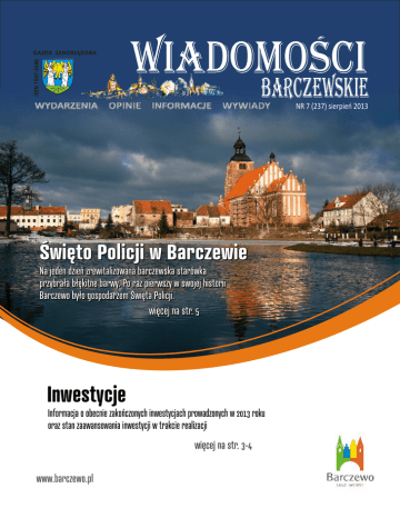 NR 7 (237) sierpień 2013 Inwestycje Informacja o obecnie zakończonych inwestycjach prowadzonych w 2013 roku oraz stan zaawansowania inwestycji w trakcie realizacji więcej na str. 3-4 KOMUNIKAT DO WŁAŚCICIELI ZWIERZĄT DOMOWYCH Utrzymujący zwierzęta domowe są zobowiązani do zachowania środków ostrożności zapewniających ochronę zdrowia i życia ludzi i innych zwierząt, a w szczególności do dołożenia starań, by zwierzęta te były jak najmniej uciążliwe dla otoczenia, nie zakłócały spokoju domowego i nie zanieczyszczały miejsc przeznaczonych do wspólnego użytku. Właściciele psów zobowiązani są do: wyposażenia psa w obrożę, a w przypadku ras uznawanych za agresywne również w kaganiec, do nie puszczania psów bez możliwości ich kontroli i bez oznakowania umożliwiającego identyfikację właściciela lub opiekuna. Zgodnie z obowiązującym REGULAMINEM CZYSTOŚCI I PORZĄDKU NA TERENIE GMINY BARCZEWO, właściciele zwierząt domowych są zobowiązani do bezzwłocznego usuwania odchodów tych zwierząt z terenów przeznaczonych do wspólnego użytku (trawniki, place, chodniki itp.). Aby zapobiec rozprzestrzenianiu się chorób, których nosicielami są zwierzęta podjęto działania celem wyeliminowania zagrożeń. W tym celu zostały zakupione i zainstalowane na terenie miasta specjalnie oznakowane kosze (z zasobnikiem na zestawy higieniczne). Wystarczy pobrać z zasobnika zestaw - czyli torebkę i łopatkę i sprzątnąć odchody po pupilu. Jeśli nie mamy specjalnego zestawu do sprzątania, wystarczy torba foliowa ale bezwzględnie odchody muszą być umieszczone w zainstalowanych do tego celu koszach. Kosze zostały zainstalowane na terenie miasta Barczewa: - ul. Armii Krajowej (park) - ul. Mickiewicza (park) - ul. Nowowiejskiego (staw) - Os. Słoneczne (SM Rodło) - Os. Słoneczne 3 - Os. Słoneczne 4 - ul. Słowackiego (park przy CKiPG) - Centrum Koledze Radnemu Ryszardowi Kulesza szczere wyrazy współczucia z powodu śmierci żony składają Radni z Komisji Finansów Publicznych Koledze Ryszardowi Kulesza wyrazy szczerego żalu i współczucia z powodu śmierci żony składają Przewodniczący Rady Miejskiej Zbigniew Chlubicki Burmistrz Barczewa Lech Jan Nitkowski GKRPA informuje Fot. UM Barczewo WIADOMOSCI BARCZEWSKIE Wydanie bieżące i numery archiwalne dostępne są w Biurze Informacji w Barczewie przy ul. Mickiewicza 12 oraz na www.gazeta.barczewo.pl Redaktor naczelny: Mariola Łukowska-Juckiewicz e-mail: [email protected] Redaktor Bogdan Caruk W Punkcie Konsultacyjno – Doradczym dyżurują: psycholog (wtorek) godz. 10.00 - 14.00, psychiatra (środa) godz. 15.00 - 17.00, prawnik (czwartek) godz. 13.00 -15.00, pedagog (czwartek) godz. 15.00 – 17.00 . Ponadto raz w tygodniu terapeuta prowadzi zajęcia dla osób uzależnionych ( wtorki godz. 18.00 - 20.00) i współuzależnionych (wtorki godz. 16.00 - 18.00). Redaktor Grzegorz Gawrylczyk Współpraca: M. Łowkiel, J. Dzioba, L. Zelman, o. D. Szulca Skład DTP: Zbigniew Kozłowski e-mail: [email protected] Wydawca: Centrum Kultury i Promocji Gminy Adres: Barczewo, ul. Słowackiego 5 Tel. / fax. 89 514 82 81 Druk: Zakład ALGRAF s.c., 11-300 Biskupiec, ul Harcerska 19 Redaktor Wojciech Zenderowski e-mail: [email protected] Redakcja nie ponosi odpowiedzialności za treść ogłoszeń i reklam, nie zwraca tekstów nie zamówionych oraz zastrzega sobie prawo skracania i opracowywania tekstów. Redakcja informuje o możliwości zamieszczenia reklam. www.gazeta.barczewo.pl ZDJĘCIE NA ODKŁADCE: MAREK KOJRO 2 GAZETA SAMORZĄDOWA 7 (237) sierpień 2013 Urząd Miejski informuje Informacja o zakończonych inwestycjach prowadzonych w 2013 roku 1. Budowa sieci wodociągowej w miejscowościach Wójtowo – Nikielkowo – realizacja II, III, IV etapu budowy sieci rozdzielczej. Inwestycja została zakończona, a wykonawcą była olsztyńska firma Marka Szkoda Instalatorstwo Sanitarne. 3. Odwodnienie ul. Warmińskiej i ul. Nadrzecznej w Barczewie. To kolejna zakończona inwestycja, której wykonawcą była firma Gwarant Przedsiębiorstwo Robót Inżynieryjno-Drogowych i Budowlanych Dariusza Jedynak z Łęgajn. W ramach inwestycji została wybudowana sieć kanalizacji deszczowej biegnąca wzdłuż ul. Nadrzecznej. Wody opadowe odprowadzane są do Strugi Barczewo po ich uprzednim podczyszczeniu w osadniku i separatorze substancji ropopochodnych. Po rozbiórce nawierzchni drogowej w celu wykonania robót kanalizacyjnych, nawierzchnia drogowa została odtworzona z kostki brukowej. Wodociąg w trakcie budowy Ciąg dalszy na str. 4 Informacja na temat stanu zaawansowania inwestycji w trakcie realizacji Teren robót po zakończeniu inwestycji 2. Budowa chodnika przy ul. Wojska Polskiego w Barczewie. Wykonawcą był barczewski Zakład Usług Komunalnych. Roboty zostały wykonane w terminie zapisanym w umowie. Wykonano chodnik o nawierzchni z kostki betonowej typu „polbruk” oraz jeden zjazd z ul. Wojska Polskiego (dz. nr 21/5 obręb 2 miasto Barczewo, odcinek od Szkoły Podstawowej do Stacji Benzynowej). Stan na 05.08.2013r.: - Opracowanie projektu budowy parkingu przy ul. Miłej w Barczewie. Trwa opracowywanie dokumentacji projektowej. Wykonawca złożył w urzędzie miasta 2 koncepcje projektowe, z których została wybrana najbardziej korzystna propozycja. - Przebudowa odcinka drogi gminnej w obrębie Niekielkowo – Dz. nr 169. Opracowywana jest dokumentacja projektowa. Projektantem przebudowy tego odcinka drogi jest Tadeusz Radomski, właściciel Zakładu Usług Projektowych i Handlowych „RAD” z Olsztyna. - Przebudowa odcinka drogi gminnej w miejscowości Niedźwiedź – obręb Ramsowo dz. nr 385. Została opracowana dokumentacja projektowo - kosztorysowa na przebudowę tej drogi. Obecnie trwają uzgodnienia z Powiatową Służbą Drogową w Olsztynie. GAZETA SAMORZĄDOWA 7 (237) sierpień 2013 - ,,Renowacja i adaptacja budynku kościoła poewangelickiego, ratusza oraz remont z wyposażeniem Muzeum im
