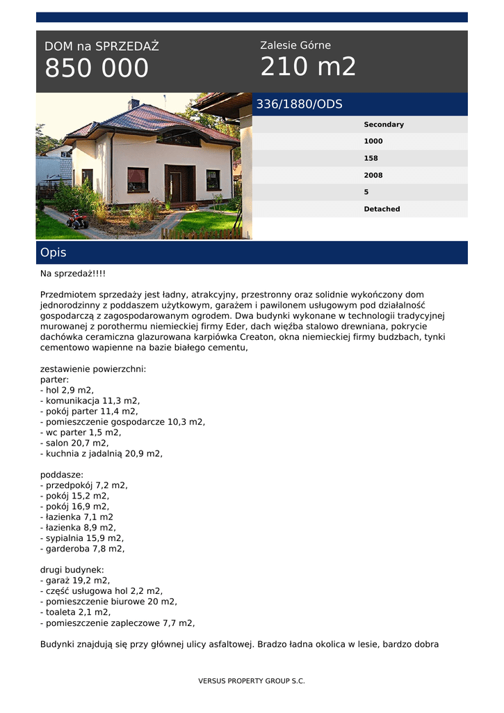 Zalesie Górne DOM na SPRZEDAŻ 210 m2 850 000 336/1880/ODS Secondary 1000 158 2008 5 Detached Opis Na sprzedaż!!!! Przedmiotem sprzedaży jest ładny, atrakcyjny, przestronny oraz solidnie wykończony dom jednorodzinny z poddaszem użytkowym, garażem i pawilonem usługowym pod działalność gospodarczą z zagospodarowanym ogrodem. Dwa budynki wykonane w technologii tradycyjnej murowanej z porothermu niemieckiej firmy Eder, dach więźba stalowo drewniana, pokrycie dachówka ceramiczna glazurowana karpiówka Creaton, okna niemieckiej firmy budzbach, tynki cementowo wapienne na bazie białego cementu, zestawienie powierzchni: parter: - hol 2,9 m2, - komunikacja 11,3 m2, - pokój parter 11,4 m2, - pomieszczenie gospodarcze 10,3 m2, - wc parter 1,5 m2, - salon 20,7 m2, - kuchnia z jadalnią 20,9 m2, poddasze: - przedpokój 7,2 m2, - pokój 15,2 m2, - pokój 16,9 m2, - łazienka 7,1 m2 - łazienka 8,9 m2, - sypialnia 15,9 m2, - garderoba 7,8 m2, drugi budynek: - garaż 19,2 m2, - część usługowa hol 2,2 m2, - pomieszczenie biurowe 20 m2, - toaleta 2,1 m2, - pomieszczenie zapleczowe 7,7 m2, Budynki znajdują się przy głównej ulicy asfaltowej. Bradzo ładna okolica w lesie, bardzo dobra VERSUS PROPERTY GROUP S.C. komunikacja, blisko szkoła, przedszkola, przychodnia, apteka, ośrodek wypoczynkowy Wisła, Dom gotowy do zamieszkania !!! Zapraszamy do oglądania!!! Doradcy finansowi współpracujący z Versus Property Group s.c. pomagają w organizacji wszystkich formalności niezbędnych do uzyskania kredytu. Nr.oferty 336/ODS Zapraszamy do naszego biura w Piasecznie, ul. Pomorska 22. Nasi pracownicy są do Państwa dyspozycji od 10:00 do 18:00 (pon-pt), w sobotę od 10:00 do 13:00. Kontakt telefoniczny w sprawie ofert codziennie od godziny 8:00 do 22:00 tel. 664 476 532 W celu zapoznania się z naszą pełną ofertą nieruchomości zapraszamy na naszą stronę www.versusgroup.pl Niniejsze ogłoszenie nie stanowi oferty w rozumieniu przepisów Kodeksu Cywilnego oraz innych właściwych przepisów prawnych, a dane w niej zawarte mają jedynie charakter informacyjny. Jacek Gawin tel. 664 476 532 email: [email protected] VERSUS PROPERTY GROUP S.C. Powered by TCPDF (www.tcpdf.org)
