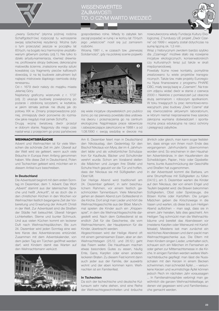 „zwany Gotsche“ (słynna później rodzina Schaffgotsch‘ów) rozpoczął tu wznoszenie swojej szlacheckiej rezydencji. Można było o tym przeczytać jeszcze w początku lat 60-tych, na bogato lecz harmonijnie ukształtowanym głównym portalu (zdj.1). Nie tylko to dzieło artysty-kamieniarza, również drewniane, profilowane stropy belkowe, dekoracyjne malowidła ścienne, znalezione wyroby sztuki kowalskiej czy fragmenty pieców kaflowych dowodzą, iż na tej budowie zatrudnieni byli najlepsi mistrzowie śląskiego rzemiosła doby renesansu. Od r. 1679 dwór należy do majątku miasta Jeleniej Góry. Najstarszy graficzny wizerunek z r. 1737 (zdj. 2) ukazuje budowlę powiększoną po pożarze i zdobioną szczytami, w kształcie, w jakim istniała jednak nie dłużej jak do połowy XIX w. Zmiany przeprowadzone później, zmniejszyły dwór ponownie do rozmiarów jakie niegdyś miał zamek Schoff‘a. Drugą wojnę światową dwór przeżył w dobrym stanie. Najgorszy dla niego czas nastał wraz z przejęciem go przez państwowe gospodarstwo rolne. Wtedy to zabytek ten zaczął popadać w ruinę i w końcu lat 70-tych jego „właściciel“ nosił się już zamiarem rozbiórki. Wiosną 1981 r., w czasach tzw. „pierwszej Solidarności“, gdy na polskiej scenie pojawiło WEIHNACHTSBRÄUCHE Advent und Weihnachten ist für viele Menschen die schönste Zeit im Jahr. Überall auf der Welt wird sie gefeiert, wenn auch viele Bräuche in Europa ihren Anfang genommen haben. Wie diese Zeit in Deutschland, Polen und Tschechien gefeiert wird, möchten wir in diesem Artikel kurz beschreiben. Am 6. Dezember feiert man in Deutschland den Nikolaustag, den Gedenktag für den Bischof Nikolaus von Myra, der im 4. Jahrhundert lebte und als volkstümlicher Schutzpatron für Kaufleute, Bäcker und Schulkinder verehrt wurde. Schon am Vorabend stellen die Mädchen und Jungen ihre Stiefel und Schuhe frisch geputzt vor die Tür und hoffen, dass der Nikolaus sie mit Süßigkeiten und Obst füllt. Der Heilige Abend wird traditionell am 24. Dezember gefeiert, in sehr beschaulichem Rahmen, vor einem festlich geschmückten Tannenbaum. Viele Menschen gehen an diesem Abend zum Gottesdienst in die Kirche. Dort singt man Lieder und hört die Weihnachtsgeschichte aus der Bibel. Manchmal spielen die Kinder auch ein „Krippenspiel“, in dem die Weihnachtsgeschichte dargestellt wird. Nach dem Gottesdienst ist es endlich Zeit für die Geschenke, die vom Weihnachtsmann, der Hauptperson für die Kinder, überbracht werden. Abgeschlossen wird der Heilige Abend oft mit einem gemeinsamen Essen, aber an den Weihnachtstagen (25.12. und 26.12.) geht das Feiern weiter. Die Hausfrauen machen etwas besonders Gutes zu essen, häufig Ente, Gans, Karpfen oder einen anderen leckeren Braten. Zu diesem Fest kommt dann auch jeder aus der Familie, der auswärts wohnt und der eben kommen kann. Weihnachten ist ein Familienfest. In Deutschland Die Adventszeit beginnt mit dem ersten Sonntag im Dezember, dem 1. Advent. Das Wort „Advent” stammt aus der lateinischen Sprache und heißt „Ankunft”, ist es doch die in den christlichen Kirchen in den Wochen vor Weihnachten festlich begangene Zeit der Vorbereitung und Erwartung der Ankunft Christi in der Welt. Zur Adventszeit sind die Straßen der Städte hell beleuchtet. Überall hängen Lichterketten, Sterne und bunter Schmuck. Und aus vielen Küchen kommt ein leckerer Duft nach Weihnachtsplätzchen. Bis zum 24. Dezember wird jeden Sonntag eine weitere Kerze des Adventskranzes entzündet. Zusammen mit dem Adventskalender, von dem jeden Tag ein Türchen geöffnet werden darf, wird Kindern damit das Warten auf den Weihnachtsmann verkürzt. się wiele inicjatyw obywatelskich pro publico bono, po raz pierwszy powstała idea uratowania dworu i przeznaczenia go na centrum ekologiczne. Najpilniejsze prace ratownicze i zabezpieczające zakończono w 1988 r. a od 1.08.1990 r. swoją siedzibę w dworze ma In Tschechien Da sich der tschechische und deutsche Kulturraum sehr nahe stehen, sind eine Reihe der Weihnachtsgewohnheiten und -bräuche nowoutworzona wtedy Fundacja Kultury Ekologicznej. Z funduszy UE projekt „Dwór Czarne” od 1999 r. wsparty został dotychczas na sumę łączną ok. 1,3 mln . Wraz z historycznym zwrotem bardzo szybko dla „Czarnego” możliwe stało się rozwijanie inicjatyw ekologicznych, konserwatorskich czy kulturalnych teraz już także w skali międzynarodowej. Powstały liczne nowe kontakty, pomyślnie zrealizowano tu wiele projektów transgranicznych. Także tzw. małe projekty Euroregionu Nysa finansowane z programu PHARE CBC, miały swoją bazę w „Czarnem”. Na trzecim zdjęciu widać dwór w stanie z czerwca 2000 r. Niektóre z pomieszczeń już obecnie służą seminariom i roboczym spotkaniom. W toku trwających tu prac remontowo-renowacyjnych, plac budowy „Dwór Czarne” stał się równocześnie aktywnym laboratorium, w którym niemal nieprzerwanie trwa szeroko zakrojona wymiana doświadczeń i spontaniczna praca edukacyjna na rzecz ochrony i pielęgnacji zabytków. ähnlich oder gleich, man kann sogar feststellen, dass einige von ihnen noch Ende des vergangenen Jahrhunderts übernommen worden sind. So erscheinen in den Haushalten Adventskränze, in den Hausfenstern die Schwibbögen, Papier-, Holz- oder Gipsbetlehems, bunte Ausschmückung der Geschäfte und Straßen hat zugenommen. In der Adventszeit kommt die Barbara, um eine Strumpfhose mit Süßigkeiten zu füllen (04.12.), am 5. Dezember warten die Kinder auf den Nikolaus, der von einem Engel und Teufeln begleitet wird: die Braven bekommen Süßigkeiten, Obst oder Spielzeuge, die Bösen Kohle oder Kartoffeln. Die jungen Mädchen geben die Kirschzweige in die Vasen und warten, ob diese bis zum Heiligen Abend aufblühen – man sagt, dass sie in einem Jahr heiraten, falls dies geschieht. Am Heiligen Tag schmückt man die Weihnachtsbäume und bereitet das Abendessen vor (meistens Karpfen oder Weinwur
