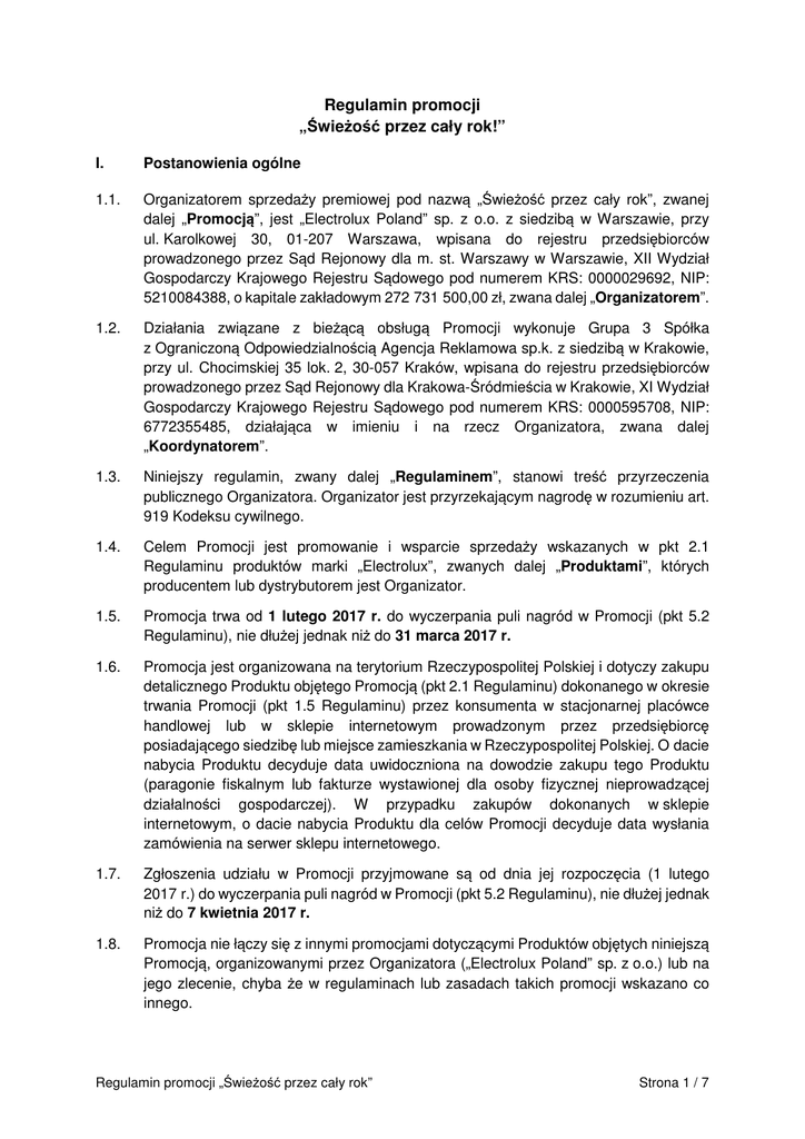 Regulamin promocji „Świeżość przez cały rok!” I. Postanowienia ogólne 1.1. Organizatorem sprzedaży premiowej pod nazwą „Świeżość przez cały rok”, zwanej dalej „Promocją”, jest „Electrolux Poland” sp. z o.o. z siedzibą w Warszawie, przy ul. Karolkowej 30, 01-207 Warszawa, wpisana do rejestru przedsiębiorców prowadzonego przez Sąd Rejonowy dla m. st. Warszawy w Warszawie, XII Wydział Gospodarczy Krajowego Rejestru Sądowego pod numerem KRS: 0000029692, NIP: 5210084388, o kapitale zakładowym 272 731 500,00 zł, zwana dalej „Organizatorem”. 1.2. Działania związane z bieżącą obsługą Promocji wykonuje Grupa 3 Spółka z Ograniczoną Odpowiedzialnością Agencja Reklamowa sp.k. z siedzibą w Krakowie, przy ul. Chocimskiej 35 lok. 2, 30-057 Kraków, wpisana do rejestru przedsiębiorców prowadzonego przez Sąd Rejonowy dla Krakowa-Śródmieścia w Krakowie, XI Wydział Gospodarczy Krajowego Rejestru Sądowego pod numerem KRS: 0000595708, NIP: 6772355485, działająca w imieniu i na rzecz Organizatora, zwana dalej „Koordynatorem”. 1.3. Niniejszy regulamin, zwany dalej „Regulaminem”, stanowi treść przyrzeczenia publicznego Organizatora. Organizator jest przyrzekającym nagrodę w rozumieniu art. 919 Kodeksu cywilnego. 1.4. Celem Promocji jest promowanie i wsparcie sprzedaży wskazanych w pkt 2.1 Regulaminu produktów marki „Electrolux”, zwanych dalej „Produktami”, których producentem lub dystrybutorem jest Organizator. 1.5. Promocja trwa od 1 lutego 2017 r. do wyczerpania puli nagród w Promocji (pkt 5.2 Regulaminu), nie dłużej jednak niż do 31 marca 2017 r. 1.6. Promocja jest organizowana na terytorium Rzeczypospolitej Polskiej i dotyczy zakupu detalicznego Produktu objętego Promocją (pkt 2.1 Regulaminu) dokonanego w okresie trwania Promocji (pkt 1.5 Regulaminu) przez konsumenta w stacjonarnej placówce handlowej lub w sklepie internetowym prowadzonym przez przedsiębiorcę posiadającego siedzibę lub miejsce zamieszkania w Rzeczypospolitej Polskiej. O dacie nabycia Produktu decyduje data uwidoczniona na dowodzie zakupu tego Produktu (paragonie fiskalnym lub fakturze wystawionej dla osoby fizycznej nieprowadzącej działalności gospodarczej). W przypadku zakupów dokonanych w sklepie internetowym, o dacie nabycia Produktu dla celów Promocji decyduje data wysłania zamówienia na serwer sklepu internetowego. 1.7. Zgłoszenia udziału w Promocji przyjmowane są od dnia jej rozpoczęcia (1 lutego 2017 r.) do wyczerpania puli nagród w Promocji (pkt 5.2 Regulaminu), nie dłużej jednak niż do 7 kwietnia 2017 r. 1.8. Promocja nie łączy się z innymi promocjami dotyczącymi Produktów objętych niniejszą Promocją, organizowanymi przez Organizatora („Electrolux Poland” sp. z o.o.) lub na jego zlecenie, chyba że w regulaminach lub zasadach takich promocji wskazano co innego. Regulamin promocji „Świeżość przez cały rok” Strona 1 / 7 II. Warunki uczestnictwa w Promocji 2.1. Promocją objęte są następujące Produkty: a) b) 2.2. pralki marki „Electrolux” (zarówno otwierane od frontu jak i od góry) o cenie zakupu co najmniej 1 099 zł brutto; pralko-suszarki marki „Electrolux” o cenie zakupu co najmniej 1 500 zł brutto. Promocja jest przeznaczona dla osób fizycznych, które spełniają wszystkie poniższe warunki (dalej „Uczestnicy”): a) b) c) d) posiadają miejsce stałego zamieszkania na terytorium Rzeczypospolitej Polskiej; ukończyły 18 rok życia i posiadają pełną zdolność do czynności prawnych; w czasie trwania Promocji (pkt 1.5 Regulaminu) dokonały jako konsument (w rozumieniu art. 221 Kodeksu cywilnego) zakupu Produktu, o którym mowa w pkt 2.1 Regulaminu i zachowały oryginał dowodu tego zakupu (paragon fiskalny lub faktura wystawiona dla Uczestnika jako osoby fizycznej nieprowadzącej działalności gospodarczej) jak również oryginał karty gwarancyjnej zakupionego Produktu; w okresie, o którym mowa w pkt 1.7 Regulaminu, dokonały zgłoszenia uczestnictwa w Promocji, zgłaszając zakup promocyjny, o którym mowa powyżej, zgodnie z postanowieniami pkt 3.1 i nast. Regulaminu. 2.3. W Promocji nie mogą uczestniczyć właściciele (współwłaściciele), wspólnicy lub osoby zatrudnione w jakiejkolwiek formie prawnej (na podstawie umowy o pracę, umowy cywilnoprawnej, etc.) w punktach sprzedaży detalicznej lub hurtowej, prowadzących sprzedaż produktów Organizatora, w przedsiębiorstwie Organizatora lub Koordynatora oraz członkowie najbliższej rodziny takich osób. 2.4. Przez członków najbliższej rodziny, o których mowa w pkt 2.3 Regulaminu, rozumie się: wstępnych, zstępnych, rodzeństwo, małżonków, małżonków rodzeństwa, rodziców małżonków i osoby pozostające w stosunku przysposobienia. 2.5. Promocja jest skierowana wyłącznie do osób nabywających Produkt jako konsument w rozumieniu art. 221 Kodeksu cywilnego. Oznacza to w szczególności, że Promocja nie jest przeznaczona dla osób lub podmiotów nabywających Produkt jako przedsiębiorca. 2.6. Udział w Promocji i podanie związanych z tym danych jest całkowicie dobrowolne. 2.7. Z Promocji można skorzystać tylko jeden raz, co oznacza, że jeden Uczestnik może zgłosić zakup tylko jednego Produktu i otrzymać tylko jedną nagrodę w Promocji. Zakup tego samego Produktu może zostać zgłoszony w Promocji wyłącznie przez jednego Uczestnika. III. Zgłoszenie uczestnictwa w Promocji 3.1. Zgłoszenie uczestnictwa w Promocji następuje online za pośrednictwem elektronicznego formularza zgłoszeniowego dostępnego na stronie internetowej Organizatora, pod adresem www.electrolux.pl/promocje. Zgłoszenie może być dokonane w terminie wskazanym w pkt 1.7 Regulaminu. Regulamin promocji „Świeżość przez cały rok” Strona 2 / 7 3.2. Dokonując zgłoszenia uczestnictwa w Promocji, Uczestnik podaje w formularzu, o którym mowa w pkt 3.1 Regulaminu: a) b) c) swoje imię, nazwisko i dokładny adres do 