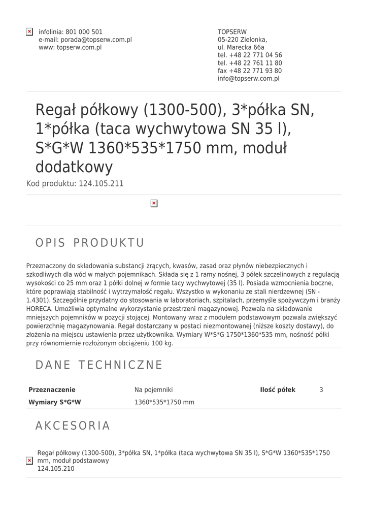 infolinia: 801 000 501 e-mail: [email protected] www: topserw.com.pl TOPSERW 05-220 Zielonka, ul. Marecka 66a tel. +48 22 771 04 56 tel. +48 22 761 11 80 fax +48 22 771 93 80 [email protected] Regał półkowy (1300-500), 3*półka SN, 1*półka (taca wychwytowa SN 35 l), S*G*W 1360*535*1750 mm, moduł dodatkowy Kod produktu: 124.105.211 OPIS PRODUKTU Przeznaczony do składowania substancji żrących, kwasów, zasad oraz płynów niebezpiecznych i szkodliwych dla wód w małych pojemnikach. Składa się z 1 ramy nośnej, 3 półek szczelinowych z regulacją wysokości co 25 mm oraz 1 półki dolnej w formie tacy wychwytowej (35 l). Posiada wzmocnienia boczne, które poprawiają stabilność i wytrzymałość regału. Wszystko w wykonaniu ze stali nierdzewnej (SN 1.4301). Szczególnie przydatny do stosowania w laboratoriach, szpitalach, przemyśle spożywczym i branży HORECA. Umożliwia optymalne wykorzystanie przestrzeni magazynowej. Pozwala na składowanie mniejszych pojemników w pozycji stojącej. Montowany wraz z modułem podstawowym pozwala zwiększyć powierzchnię magazynowania. Regał dostarczany w postaci niezmontowanej (niższe koszty dostawy), do złożenia na miejscu ustawienia przez użytkownika. Wymiary W*S*G 1750*1360*535 mm, nośność półki przy równomiernie rozłożonym obciążeniu 100 kg. DANE TECHNICZNE Przeznaczenie Na pojemniki Wymiary S*G*W 1360*535*1750 mm Ilość półek 3 AKCESORIA Regał półkowy (1300-500), 3*półka SN, 1*półka (taca wychwytowa SN 35 l), S*G*W 1360*535*1750 mm, moduł podstawowy 124.105.210 CERTYFIKATY POWIĄZANE Produkt Przeznaczenie Rodzaj półek Ilość półek Pojemność wanny wychwytowej [l] Regał półkowy (1300-500), 3*półka SN, 1*półka (taca wychwytowa SN 35 l), S*G*W 1360*535*1750 mm, moduł podstawowy Na pojemniki -- 3 -- Regał półkowy (1300-500), 3*półka SN, 1*półka (taca wychwytowa SN 35 l), S*G*W 1360*535*1750 mm, moduł dodatkowy Na pojemniki -- 3 --